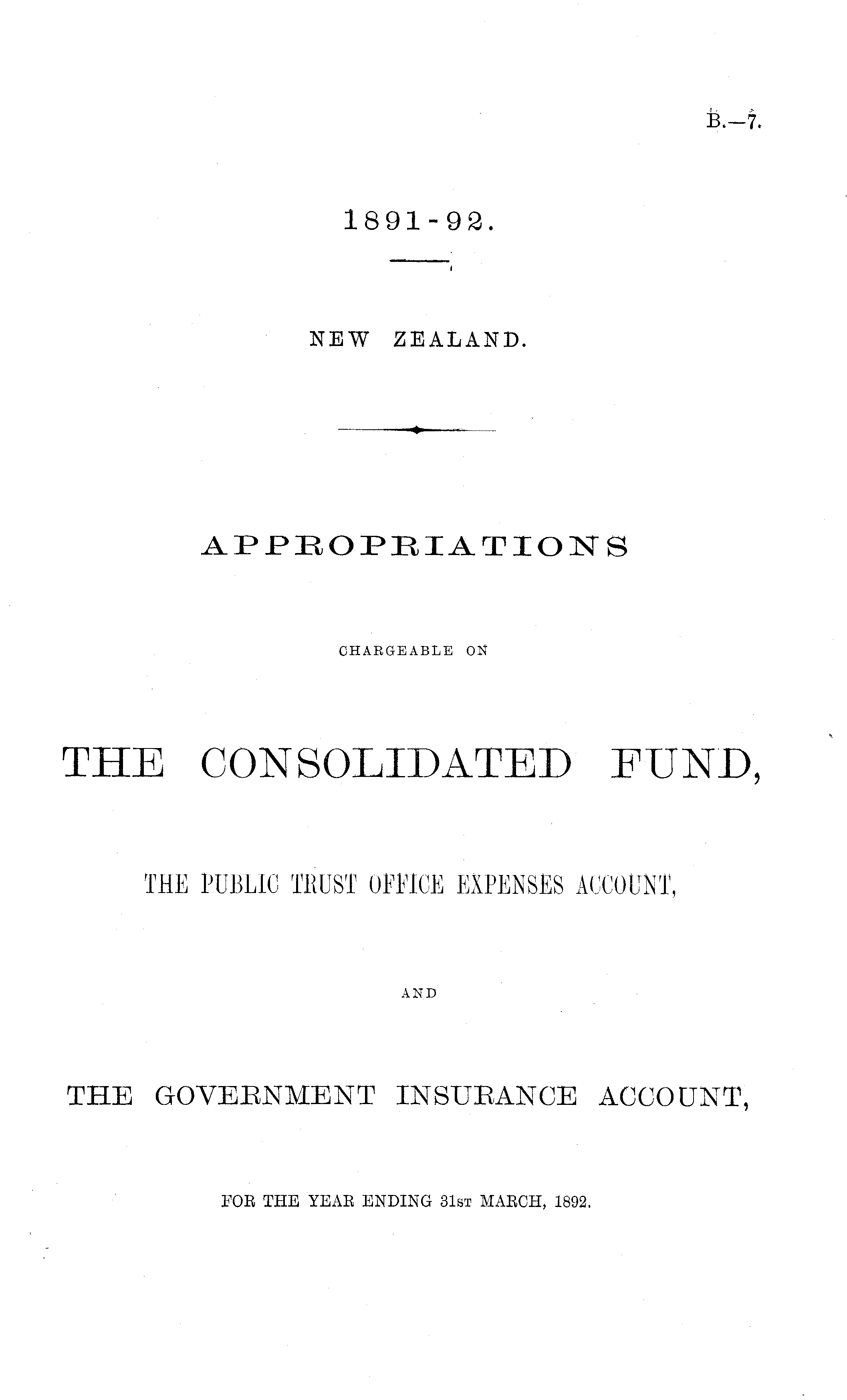 APPROPRIATIONS CHARGEABLE ON THE CONSOLIDATED FUND, THE PUBLIC TRUST OFFICE EXPENSES ACCOUNT, AND THE GOVERNMENT INSURANCE ACCOUNT, FOR THE YEAR ENDING 31st MARCH, 1892.