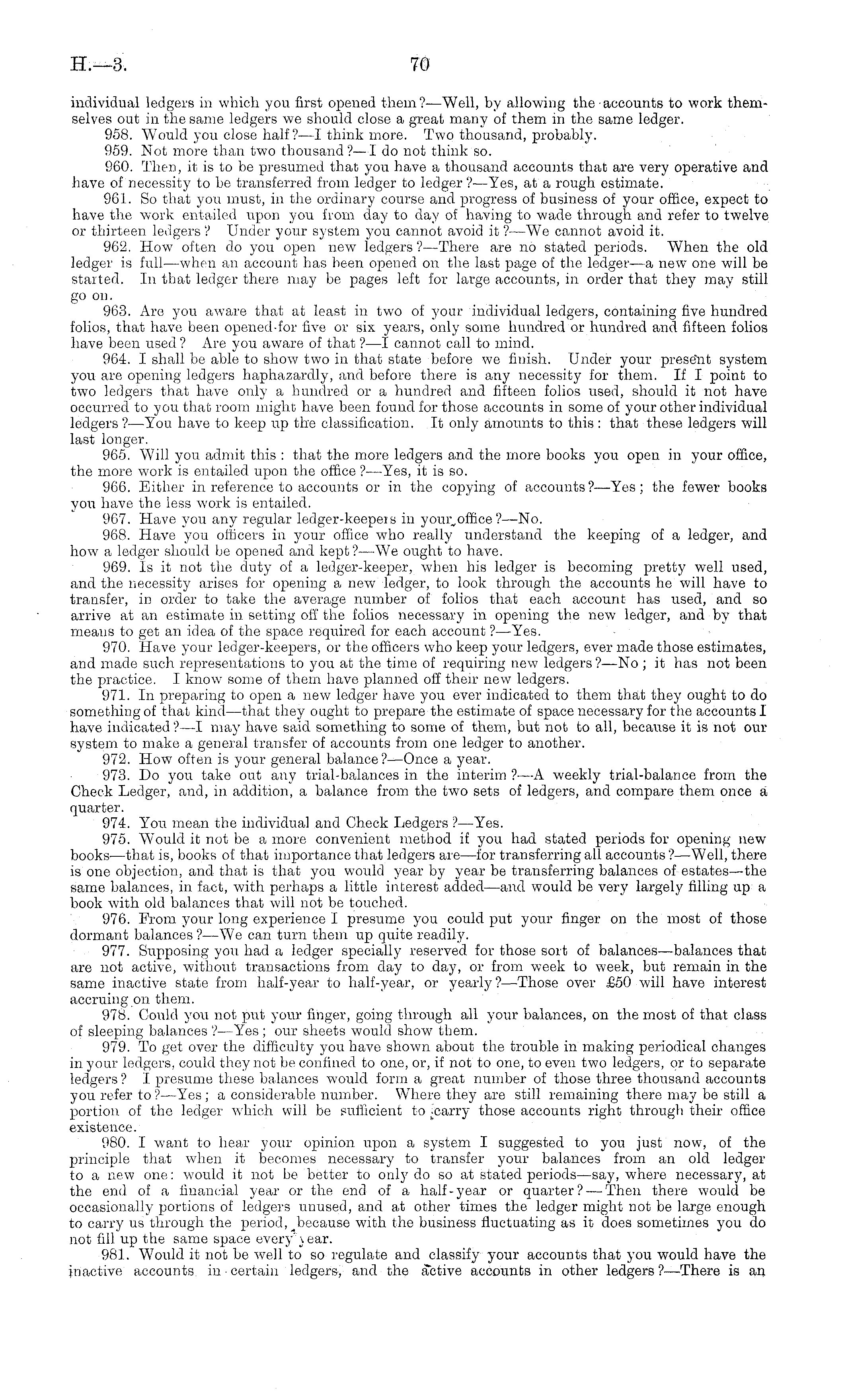 individual ledgers in which you first opened them?— Well, by allowing the accounts to work themselves out in the same ledgers we should close a great many of them in the same ledger. 958. Would you close half?—l think more. Two thousand, probably. 959. Not more than two thousand?—l do not think so. 960. Then, it is to be presumed that you have a thousand accounts that are very operative and have of necessity to be transferred from ledger to ledger ?—Yes, at a rough estimate. 961. So that you must, in the ordinary course and progress of business of your office, expect to have the work entailed upon you from day to day of having to wade through and refer to twelve or thirteen ledgers ? Under your system you cannot avoid it ?—We cannot avoid it. 962. How often do you open new ledgers ?—There are no stated periods. When the old ledger is full—when an account has been opened on. the last page of the ledger—a new one will be started. In that ledger there may be pages left for large accounts, in order that they may still go on. 963. Are you aware that at least in two of your individual ledgers, containing five hundred folios, that have been opened-for five or six years, only some hundred or hundred and fifteen folios have been used ? Are you aware of that ?—I cannot call to mind. 964. I shall be able to show two in that state before we finish. Under your present system you are opening ledgers haphazardly, and before there is any necessity for them. If I point to two ledgers that have only a hundred or a hundred and fifteen folios used, should it not have occurred to you that room might have been found for those accounts in some of your other individual ledgers ?—You have to keep up the classification. It only amounts to this : that these ledgers will last longer. 965. Will you admit this : that the more ledgers and the more books you open in your office, the more work is entailed upon the office ? —Yes, it is so. 966. Either in reference to accounts or in the copying of accounts?— Yes; the fewer books you have the less work is entailed. 967. Have you any regular ledger-keepeis in your v office? —No. 968. Have you officers in your office who really understand the keeping of a ledger, and how a ledger should be opened and kept ?—We ought to have. 969. Is it not the duty of a ledger-keeper, when his ledger is becoming pretty well used, and the necessity arises for opening a new ledger, to look through the accounts he will have to transfer, in order to take the average number of folios that each account has used, and so arrive at an estimate in setting off the folios necessary in opening the new ledger, and by that means to get an idea of the space required for each account ? —Yes. 970. Have your ledger-keepers, or the officers who keep your ledgers, ever made those estimates, and made such representations to you at the time of requiring new ledgers ?—No ; it has not been the practice. I know some of them have planned off their new ledgers. 971. In preparing to open a new ledger have you ever indicated to them that they ought to do something of that kind—that they ought to prepare the estimate of space necessary for the accounts I have indicated ?—I may have said something to some of them, but not to all, because it is not our system to make a general transfer of accounts from one ledger to another. 972. How often is your general balance?— Once a year. 973. Do you take out any trial-balances in the interim ?—A weekly trial-balance from the Check Ledger, and, in addition, a balance from the two sets of ledgers, and compare them once a quarter. 974. You mean the individual and Check Ledgers ?—Yes. 975. Would it not be a more convenient method if you had stated periods for opening new books—that is, books of that importance that ledgers are—for transferring all accounts ?—Well, there is one objection, and that is that you would year by year be transferring balances of estates—the same balances, in fact, with perhaps a little interest added—and would be very largely filling up a book with old balances that will not be touched. 976. From your long experience I presume you could put your finger on the most of those dormant balances ? —We can turn them up quite readily. 977. Supposing you had a ledger specially reserved for those sort of balances—balances that are not active, without transactions from clay to day, or from week to week, but remain in the same inactive state from half-year to half-year, or yearly?— Those over £50 will have interest accruing on them. 978. Could you not put your finger, going through all your balances, on the most of that class of sleeping balances ?—Yes ; our sheets would show them. 979. To get over the difficulty you have shown about the trouble in making periodical changes in your ledgers, could they not be confined to one, or, if not to one, to even two ledgers, or to separate ledgers? I presume these balances would form a great number of those three thousand accounts you refer to ?—Yes ; a considerable number. Where they are still remaining there may be still a portion of the ledger which will be sufficient to .carry those accounts right through their office existence. 980. I want to hear your opinion upon a system I suggested to you just now, of the principle that when it becomes necessary to transfer your balances from an old ledger to a new one: would it not be better to only do so at stated periods—say, where necessary, at the end of a financial year or the end of a half-year or quarter? — Then there would be occasionally portions of ledgers unused, and at other times the ledger might not be large enough to carry us through the period, because with the business fluctuating as it does sometimes you do not fill up the same space every'v ear. 981. Would it not be well to so regulate and classify your accounts that you would have the inactive accounts in certain ledgers, and the active accounts in other l