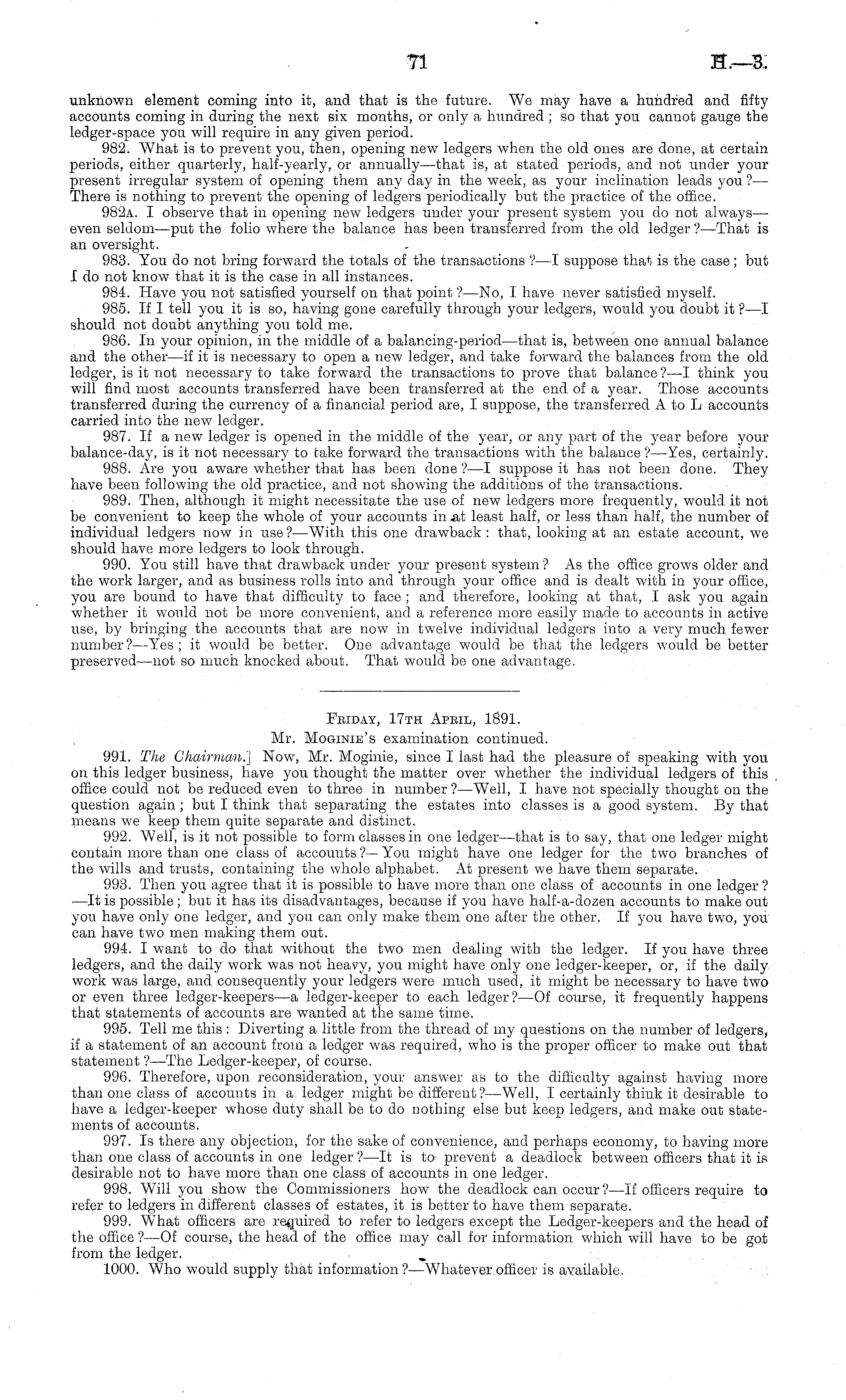 unknown element coining into it, and that is the future. We may have a hundred and fifty accounts coming in during the next six months, or only a hundred ; so that you cannot gauge the ledger-space you will require in any given period. 982. What is to prevent you, then, opening new ledgers when the old ones are done, at certain periods, either quarterly, half-yearly, or annually—that is, at stated periods, and not under your present irregular system of opening them any day in the week, as your inclination leads you ?— There is nothing to prevent the opening of ledgers periodically but the practice of the office. 982 a. I observe that in opening new ledgers under your present system you do not always — even seldom—put the folio where the balance has been transferred from the old ledger ?—That is an oversight. 983. You do not bring forward the totals of the transactions ?—I suppose that is the case; but I do not know that it is the case in all instances. 984. Have you not satisfied yourself on that point ?—No, I have never satisfied myself. 985. If I tell you it is so, having gone carefully through your ledgers, would you doubt it ? —I should not doubt anything you told me. 986. In your opinion, in the middle of a balancing-period—that is, between one annual balance and the other—if it is necessary to open a new ledger, and take forward the balances from the old ledger, is it not necessary to take forward the transactions to prove that balance ?—I think you will find most accounts transferred have been transferred at the end of a year. Those accounts transferred during the currency of a financial period are, I suppose, the transferred A to L accounts carried into the new 7 ledger. 987. If a new ledger is opened in the middle of the year, or any part of the year before your balance-day, is it not necessary to take forward the transactions with the balance ?—Yes, certainly. 988. Are you aware whether that has been done ?—I suppose it has not been done. They have been following the old practice, and not showing the additions of the transactions. 989. Then, although it might necessitate the use of new ledgers more frequently, would it not be convenient to keep the whole of your accounts in ,at least half, or less than half, the number of individual ledgers now in use?— With this one drawback: that, looking at an estate account, we should have more ledgers to look through. 990. You still have that drawback under your present system ? As the office grows older and the work larger, and as business rolls into and through your office and is dealt with in your office, you are bound to have that difficulty to face ; and therefore, looking at that, I ask you again whether it would not be more convenient, and a reference more easily made to accounts in active use, by bringing the accounts that are now in twelve individual ledgers into a very much fewer number? —Yes; it would be better. One advantage would be that the ledgers would be better preserved —not so much knocked about. That would be one advantage.