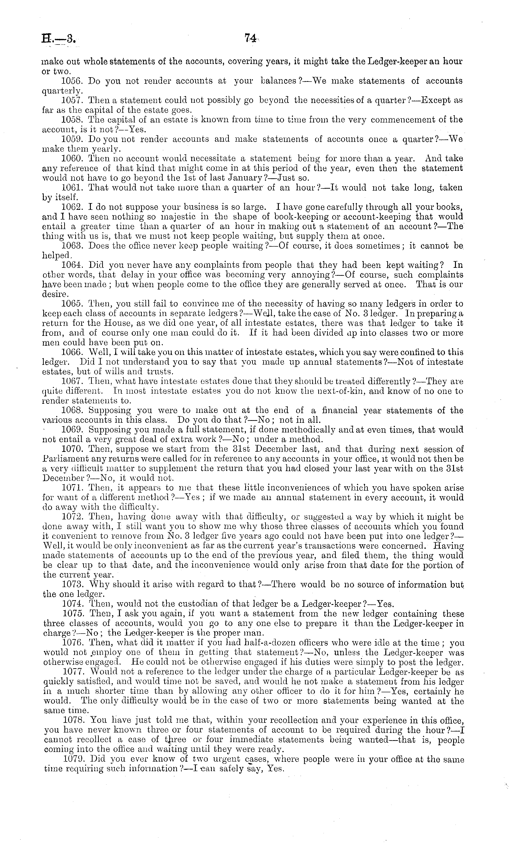 make out whole statements of the accounts, covering years, it might take the Ledger-keeper an hour or two. 1056. Do you not render accounts at your balances ?—We make statements of accounts quarterly. 1057. Then a statement could not possibly go beyond the necessities of a quarter? —Except as far as the capital of the estate goes. 1058. The capital of an estate is known from time to time from the very commencement of the account, is it not? —Yes. 1059. Do you not render accounts and make statements of accounts once a quarter?—We make them yearly. 1060. Then no account would necessitate a statement being for more than a year. And take any reference of that kind that might come in at this period of the year, even then the statement would not have to go beyond the Ist of last January ?—Just so. 1061. That would not take more than a quarter of an hour?—lt would not take long, taken by itself. 1062. Ido not suppose your business is so large. I have gone carefully through all your books, and I have seen nothing so majestic in the shape of book-keeping or account-keeping that would entail a greater time than a quarter of an hour in making out a statement of an account ?—The thing with us is, that we must not keep people waiting, but supply them at once. 1063. Does the office never keep people waiting?—Of course, it does sometimes; it cannot be helped. 1064. Did you never have any complaints from people that they had been kept waiting? In other words, that delay in your office was becoming very annoying? —Of course, such complaints have been made ; but when people come to the office they are generally served at once. That is our desire. 1065. Then, you still fail to convince me of the necessity of having so many ledgers in order to keep each class of accounts in separate ledgers ? —Well, take the case of No. 3 ledger. In preparing a return for the House, as we did one year, of all intestate estates, there was that ledger to take it from, and of course only one man could do it. If it had been divided up into classes two or more men could have been put on. 1066. Well, I will take you on this matter of intestate estates, which you say were confined to this ledger. Did I not understand you to say that you made up annual statements? —Not of intestate estates, but of wills and trusts. 1067. Then, what have intestate estates done that they should be treated differently ?—They are quite different. In most intestate estates you do not know the next-of-kin, and know of no one to render statements to. 1068. Supposing you were to make out at the end of a financial year statements of the various accounts in this class. Do you do that ?—No ; not in all. 1069. Supposing you made a full statement, if done methodically and at even times, that would not entail a very great deal of extra work ?—No; under a method. 1070. Then, suppose we start from the 31st December last, and that during next session of Parliament any returns were called for in reference to any accounts in your office, it would not then be a very difficult matter to supplement the return that you had closed your last year with on the 31st December ? —No, it would not. 1071. Then, it appears to me that these little inconveniences of which you have spoken arise for want of a different method ?—Yes ; if we made an annual statement in every account, it would do away with the difficulty. 1072. Then, having done away with that difficulty, or suggested a way by which it might be done away with, I still want you to show me why those three classes of accounts which you found it convenient to remove from No. 3 ledger five years ago could not have been put into one ledger ?— Well, it would be only inconvenient as far as the current year's transactions were concerned. Having made statements of accounts up to the end of the previous year, and filed them, the thing would be clear up to that date, and the inconvenience would only arise from that date for the portion of the current year. 1073. Why should it arise with regard to that ?—There would be no source of information but the one ledger. 1074. Then, would not the custodian of that ledger be a Ledger-keeper?— Yes. 1075. Then, I ask you again, if you want a statement from the new ledger containing these three classes of accounts, would you go to any one else to prepare it than the Ledger-keeper in charge?—No ; the Ledger-keeper is the proper man. 1076. Then, what did it matter if you had half-a-dozen officers who were idle at the time; you would not .employ one of them in getting that statement ?—No, unless the Ledger-keeper was otherwise engaged. He could not be otherwise engaged if his duties were simply to post the ledger. 1077. Would not a reference to the ledger under the charge of a particular Ledger-keeper be as quickly satisfied, and would time not be saved, and would he not make a statement from his ledger in a much shorter time than by allowing any other officer to do it for him ?—Yes, certainly he would. The only difficulty would be in the case of two or more statements being wanted at the same time. 1078. You have just told me that, within your recollection and your experience in this office, you have never known three or four statements of account to be required during the hour?—l cannot recollect a case of three or four immediate statements being wanted—that is, people coming into the office and waiting until they were ready. 1079. Did you ever know of two urgent cases, where people were in your office at the same time requiring such information?—l-can safely say, Yes.