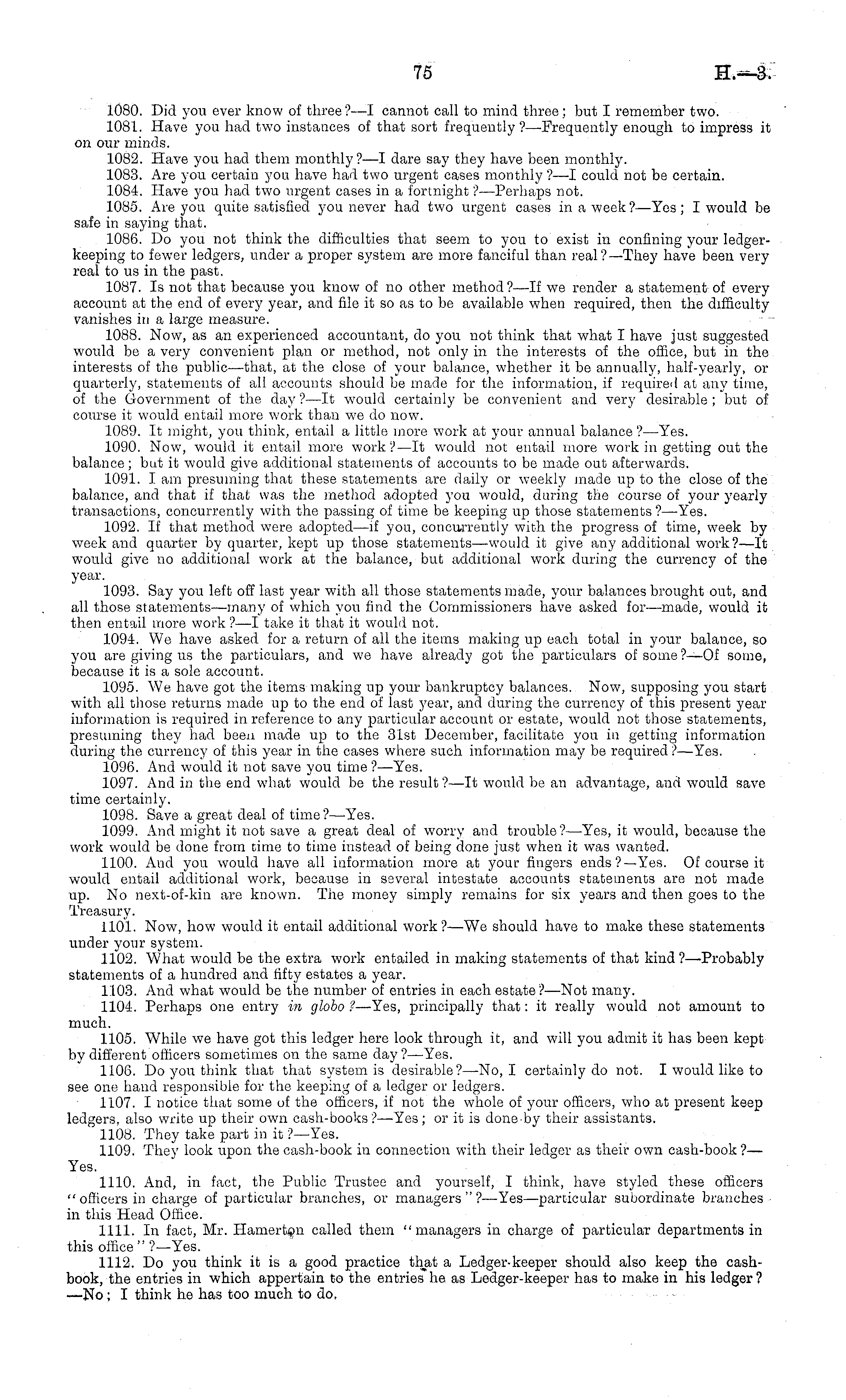 1080. Did you ever know of three ?—I cannot call to mind three ; but I remember two. 1081. Have you had two instances of that sort frequently ? —Frequently enough to impress it on our minds. 1082. Have you had them monthly ? —I dare say they have been monthly. 1083. Are you certain you have had two urgent cases monthly ? —I could not be certain. 1084. Have you had two urgent cases in a fortnight ? —Perhaps not. 1085. Are you quite satisfied you never had two urgent cases in a week? —Yes; I would be safe in saying that. 1086. Do you not think the difficulties that seem to you to exist in confining your ledgerkeeping to fewer ledgers, under a proper system are more fanciful than real?— They have been very real to us in the past. 1087. Is not that because you know of no other method?—lf we render a statement of every account at the end of every year, and file it so as to be available when required, then the difficulty vanishes in a large measure. 1088. Now, as an experienced accountant, do you not think that what I have just suggested would be a very convenient plan or method, not only in the interests of the office, but in the interests of the public—that, at the close of your balance, whether it be annually, half-yearly, or quarterly, statements of all accounts should be made for the information, if required at any time, of the Government of the day ?—lt would certainly be convenient and very desirable ; but of course it would entail more work than we do now. 1089. It might, you think, entail a little more work at your annual balance ?—Yes. 1090. Now, would it entail more work ?—lt would not entail more work in getting out the balance; but it would give additional statements of accounts to be made out afterwards. 1091. I am presuming that these statements are daily or weekly made up to the close of the balance, and that if that was the method adopted you would, during the course of your yearly transactions, concurrently with the passing of time be keeping up those statements?— Yes. 1092. If that method were adopted —if yon, concurrently with the progress of time, week by week and quarter by quarter, kept up those statements—would it give any additional work?—lt would give no additional work at the balance, but additional work during the currency of the year. 1093. Say you left off last year with all those statements made, your balances brought out, and all those statements —many of which you find the Commissioners have asked for —made, would it then entail more work ?—I take it that it would not. 1094. We have asked for a return of all the items making up each total in your balance, so you are giving us the particulars, and we have already got the particulars of some ?—Of some, because it is a sole account. 1095. We have got the items making up your bankruptcy balances. Now, supposing you start with all those returns made up to the end of last year, and during the currency of this present year information is required in reference to any particular account or estate, would not those statements, presuming they had been made up to the 31st December, facilitate you in getting information during the currency of this year in the cases where such information may be required?— Yes. 1096. And would it not save you time ? —Yes. 1097. And in the end what would be the result?—lt would be an advantage, and would save time certainly. 1098. Save a great deal of time? —Yes. 1099. And might it not save a great deal of worry and trouble ?—Yes, it would, because the work would be done from time to time instead of being clone just when it was wanted. 1100. And you would have all information more at your fingers ends?— Yes. Of course it would entail additional work, because in several intestate accounts statements are not made up. No next-of-kin are known. The money simply remains for six years and then goes to the Treasury. 110 i. Now, how would it entail additional work ?—We should have to make these statements under your system. 1102. What would be the extra work entailed in making statements of that kind?— Probably statements of a hundred and fifty estates a year. 1103. And what would be the number of entries in each estate?— Not many. 1104. Perhaps one entry in globo ? —Yes, principally that: it really would not amount to much. 1105. While we have got this ledger here look through it, and will you admit it has been kept by different officers sometimes on the same day?— Yes. 1106. Do you think that that system is desirable?—No, I certainly do not. I would like to see one hand responsible for the keeping of a ledger or ledgers. 1107. I notice that some of the officers, if not the whole of your officers, who at present keep ledgers, also write up their own cash-books? —Yes; or it is done-by their assistants. 1108. They take part in it ?—Yes. 1109. They look upon the cash-book in connection with their ledger as their own cash-book ?— Yes. 1110. And, in fact, the Public Trustee and yourself, I think, have styled these officers " officers in charge of particular branches, or managers"?— Yes—particular subordinate branches in this Head Office. 1111. In fact, Mr. Hamerton called them "managers in charge of particular departments in this office " ?—Yes. 1112. Do you think it is a good practice that a Ledger-keeper should also keep the cashbook, the entries in which appertain to the entries he as Ledger-keeper has to make in his ledger ? —No; I think he has too much to do,