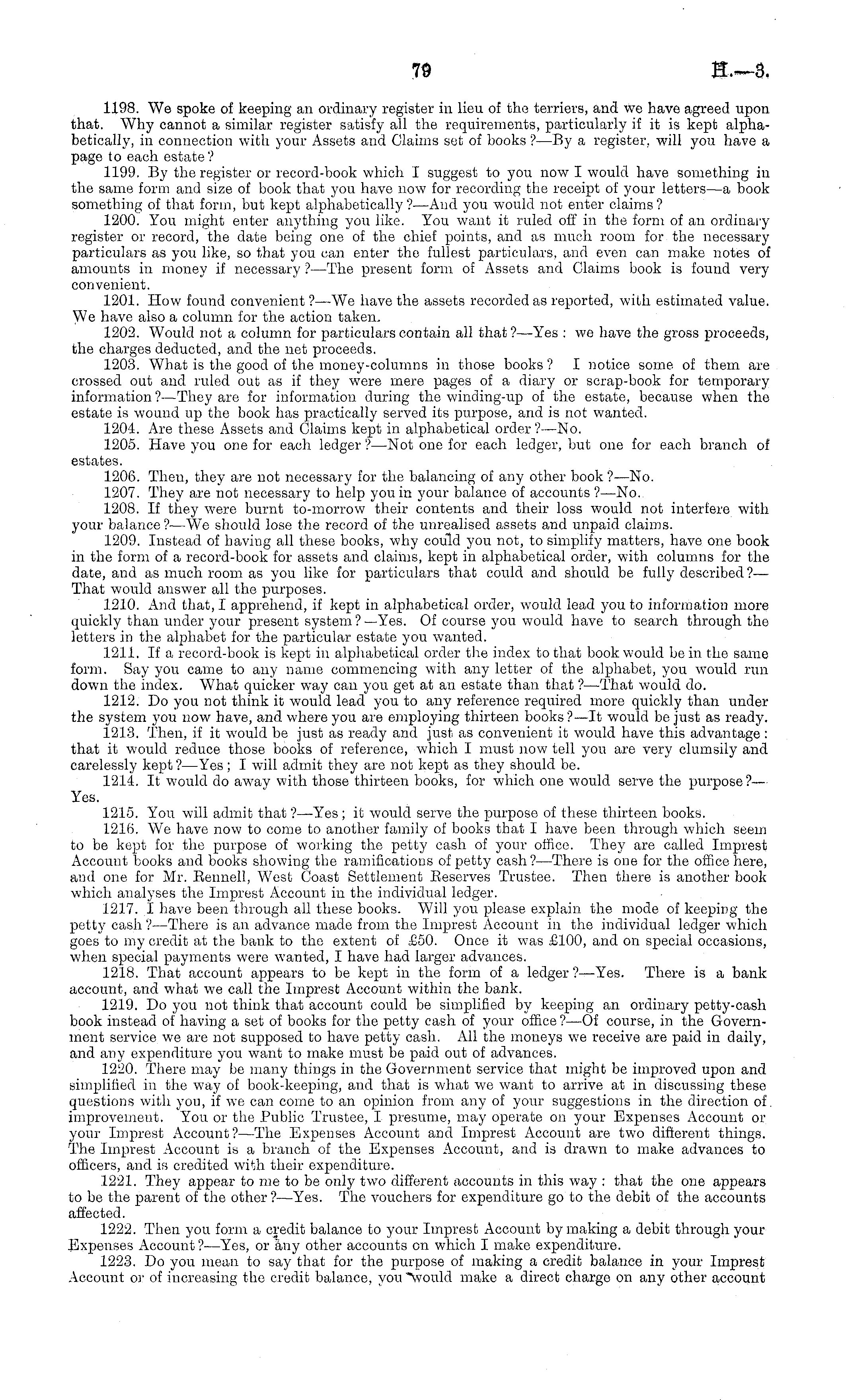 1198. We spoke of keeping an ordinary register in lieu of the terriers, and we have agreed upon that. Why cannot a similar register satisfy all the requirements, particularly if it is kept alphabetically, in connection with your Assets and Claims set of books ?—By a register, will you have a page to each estate? 1199. By the register or record-book which I suggest to you now I would have something in the same form and size of book that you have now for recording the receipt of your letters—a book something of that form, but kept alphabetically ?—And you would not enter claims ? 1200. You might enter anything you like. You want it ruled off in the form of an ordinary register or record, the date being one of the chief points, and as much room for the necessary particulars as you like, so that you can enter the fullest particulars, and even can make notes of amounts in money if necessary ?—The present form of Assets and Claims book is found veryconvenient. 1201. How found convenient ? —We have the assets recorded as reported, with estimated value. We have also a column for the action taken. 1202. Would not a column for particulars contain all that?— Yes :we have the gross proceeds, the charges deducted, and the net proceeds. 1203. What is the good of the money-columns in those books ? I notice some of them are crossed out and ruled out as if they were mere pages of a diary or scrap-book for temporary information?— They are for information during the winding-up of the estate, because when the estate is wound up the book has practically served its purpose, and is not wanted. 1204. Are these Assets and Claims kept in alphabetical order ?—No. 1205. Have you one for each ledger ? —Not one for each ledger, but one for each branch of estates. 1206. Then, they are not necessary for the balancing of any other book?— No. 1207. They are not necessary to help you in your balance of accounts ?—No. 1208. If they were burnt to-morrow their contents and their loss would not interfere with your balance?—We should lose the record of the unrealised assets and unpaid claims. 1209. Instead of having all these books, why could you not, to simplify matters, have one book in the form of a record-book for assets and claims, kept in alphabetical order, with columns for the date, and as much room as you like for particulars that could and should be fully described ?— That would answer all the purposes. 1210. And that, I apprehend, if kept in alphabetical order, would lead you to information more quickly than under your present system?— Yes. Of course you would have to search through the letters in the alphabet for the particular estate you wanted. 1211. If a record-book is kept in alphabetical order the index to that book would be in the same form. Say you came to any name commencing with any letter of the alphabet, you would run down the index. What quicker way can you get at an estate than that ?—That would do. 1212. Do you not think it would lead you to any reference required more quickly than under the system you now have, and where you are employing thirteen books ? —lt would be just as ready. 1213. Then, if it would be just as ready and just as convenient it would have this advantage : that it would reduce those books of reference, which I must now tell you are very clumsily and carelessly kept? —Yes; I will admit they are not kept as they should be. 1214. It would do away with those thirteen books, for which one would serve the purpose ?— Yes. 1215. You will admit that ? —Yes; it would serve the purpose of these thirteen books. 1216. We have now to come to another family of books that I have been through which seem to be kept for the purpose of working the petty cash of your office. They are called Imprest Account books and books showing the ramifications of petty cash?— There is one for the office here, and one for Mr. Beunell, W 7est Coast Settlement Beserves Trustee. Then there is another book which analyses the Imprest Account in the individual ledger. 1217. I have been through all these books. Will you please explain the mode of keeping the petty cash ? —There is an advance made from the Imprest Account in the individual ledger which goes to my credit at the bank to the extent of £50. Once it was £100, and on special occasions, when special payments were wanted, I have had larger advances. 1218. That account appears to be kept in the form of a ledger? —Yes. There is a bank account, and what we call the Imprest Account within the bank. 1219. Do you not think that account could be simplified by keeping an ordinary petty-cash book instead of having a set of books for the petty cash of your office ?—Of course, in the Government service we are not supposed to have petty cash. All the moneys we receive are paid in daily, and any expenditure you want to make must be paid out of advances. 1220. There may be many things in the Government service that might be improved upon and simplified in the way of book-keeping, and that is what we want to arrive at in discussing these questions with you, if we can come to an opinion from any of your suggestions in the direction of. improvement. You or the Public Trustee, I presume, may operate on your Expenses Account or your Imprest Account? —The Expenses Account and Imprest Account are two different things. The Imprest Account is a branch of the Expenses Account, and is drawn to make advances to officers, and is credited with their expenditure. 1221. They appear to me to be only two different accounts in this way : that the one appears to be the parent of the other ?—Yes. The vouchers for expenditure go to the debit of the accounts affected. 1222. Then you form a credit balance to your Imprest Account by making a debit through your Expenses Account ? —Yes, or any other accounts en which I make expenditure. 1223. Do you mean to say that for the purpose of making a credit balance in your Imprest Account or of increasing th