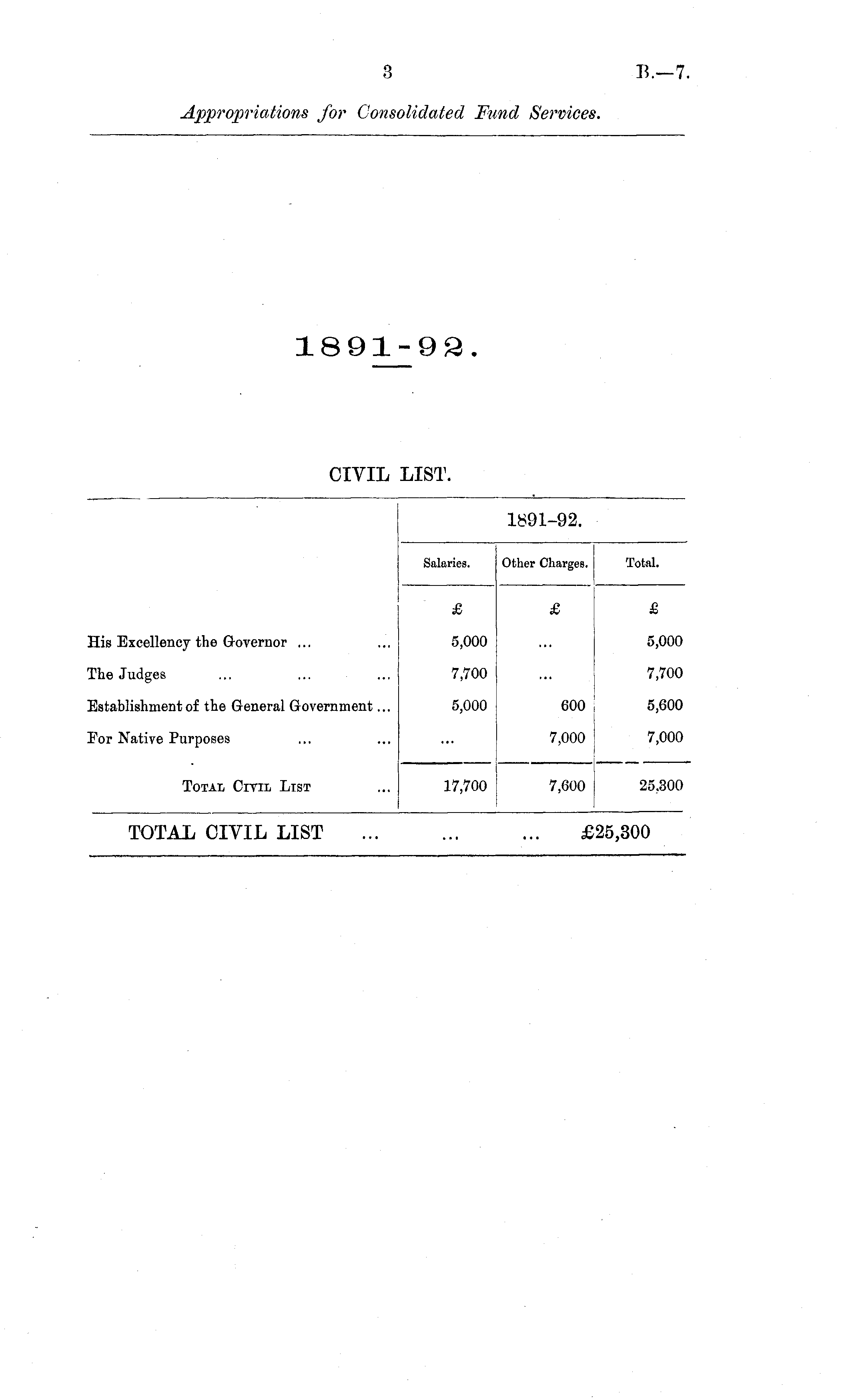 1891-92. Salaries. Other Charges. Total. lis Excellency the Governor ... £ £ & 5,000 5,000 'he Judges 7,700 7,700 Istablishment of the General Government... 5,000 600 5,600 "or Native Purposes 7,000 7,000 Total Citil List 17,700 7,600 25,300 TOTAL CIVIL LIST 25,300