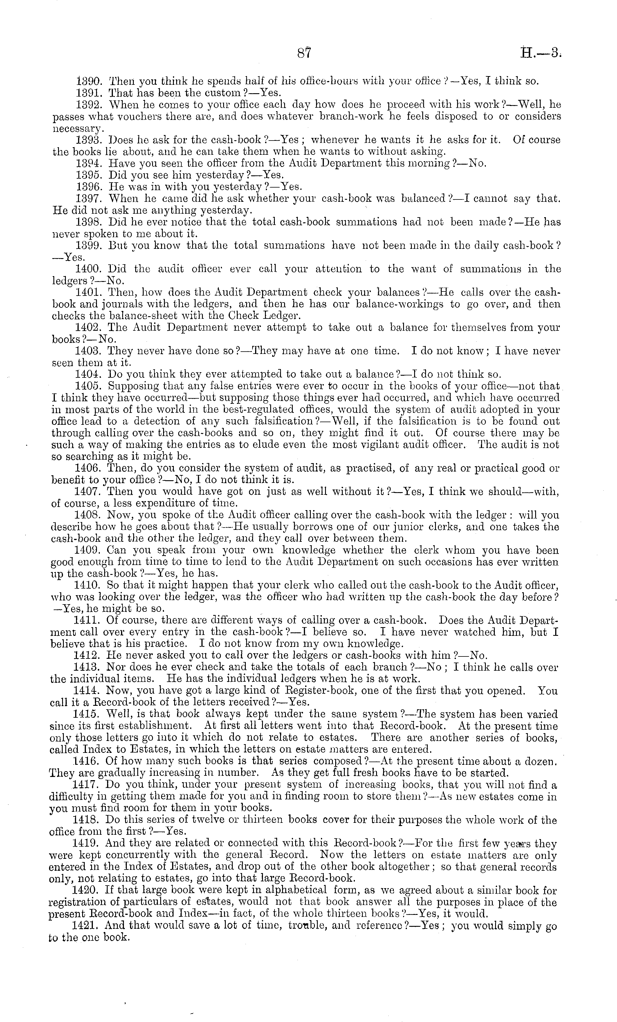 1390. Then you think he spends half of his office-hours with your office ?—Yes, I think so. 1391. That has been the custom ? —Yes. 1392. When ho comes to your office each day how does he proceed with his work?— Well, he passes what vouchers there are, and does whatever branch-work he feels disposed to or considers necessary. 1393. Does he ask for the cash-book ?—Yes ; whenever he wants it he asks for it. Of course the books lie about, and he can take them when he wants to without asking. 1394. Have you seen the officer from the Audit Department this morning ?—No. 1395. Did you see him yesterday?— Yes. 1396. He was in with you yesterday ? —Yes. 1397. When he came did he ask whether your cash-book was balanced ?—I cannot say that. He did not ask me anything yesterday. 1398. Did he ever notice that the total cash-book summations had not been made?—He has never spoken to me about it. 1399. But you know that the total summations have not been made in the daily cash-book ? —Yes. 1400. Did the audit officer ever call your attention to the want of summations in the ledgers ? —No. 1401. Then, how does the Audit Department check your balances ?—He calls over the cashbook and journals with the ledgers, and then he has our balance-workings to go over, and then checks the balance-sheet with the Check Ledger. 1402. The Audit Department never attempt to take out a balance for themselves from your books?—-No. 1403. They never have done so? —They may have at one time. Ido not know; I have never seen them at it. 1404. Do you think they ever attempted to take out a balance ?—I do not think so. 1405. Supposing that any false entries were ever to occur in the books of your office —not that I think they have occurred—but supposing those things ever had occurred, and which have occurred in most parts of the world in the best-regulated offices, would the system of audit adopted in your office lead to a detection of any such falsification?— Well, if the falsification is to be found out through calling over the cash-books and so on, they might find it out. Of course there may be such a way of making the entries as to elude even the most vigilant audit officer. The audit is not so searching as it might be. 1406. Then, do you consider the system of audit, as practised, of any real or practical good or benefit to your office ?—No, Ido not think it is. 1407. Then you would have got on just as well without it ?—Yes, I think wre should—with, of course, a less expenditure of time. 1408. Now, you spoke of the Audit officer calling over the cash-book with the ledger : will you describe how he goes about that ?—He usually borrows one of our junior clerks, and one takes the cash-book and the other the ledger, and they call over between them. 1409. Can you speak from your own knowledge whether the clerk whom you have been good enough from time to time to lend to the Audit Department on such occasions has ever written up the cash-book ?—Yes, he has. 1410. So that it might happen that your clerk who called out the cash-book to the Audit officer, who was looking over the ledger, was the officer who had written up the cash-book the day before ? —Yes, he might be so. 1411. Of course, there are different ways of calling over a cash-book. Does the Audit Department call over every entry in the cash-book ?—I believe so. I have never watched him, but I believe that is his practice. Ido not know from my own knowledge. 1412. He never asked you to call over the ledgers or cash-books with him ? —No. 1413. Nor does he ever check and take the totals of each branch ? —No ; I think he calls over the individual items. He has the individual ledgers when he is at work. 1414. Now, you have got a large kind of Eegister-book, one of the first that you opened. You call it a Becord-book of the letters received?— Yes. 1415. Well, is that book always kept under the same system ?—The system has been varied since its first establishment. At first all letters went into that Becord-book. At the present time only those letters go into it which do not relate to estates. There are another series of books, called Index to Estates, in which the letters on estate matters are entered. 1416. Of how many such books is that series composed?—At the present time about a dozen. They are gradually increasing in number. As they get full fresh books have to be started. 1417. Do you think, under your present system of increasing books, that you will not find a difficulty in getting them made for you and in finding room to store them ? —As new estates come in you must find room for them in your books. 1418. Do this series of twelve or thirteen books cover for their purposes the whole work of the office from the first ? —Yes. 1419. And they are related or connected with this Becord-book ? —Tor the first few yea>rs they were kept concurrently with the general Becord. Now the letters on estate matters are only entered in the Index of Estates, and drop out of the other book altogether; so that general records only, not relating to estates, go into that large Becord-book. 1420. If that large book were kept in alphabetical form, as we agreed about a similar book for registration of particulars of estates, would not that book answer all the purposes in place of the present Becord-book and Index—in fact, of the whole thirteen books ? —Yes, it would. 1421. And that would save a lot of time, trouble, and reference?— Yes ; you would simply go to the one book.