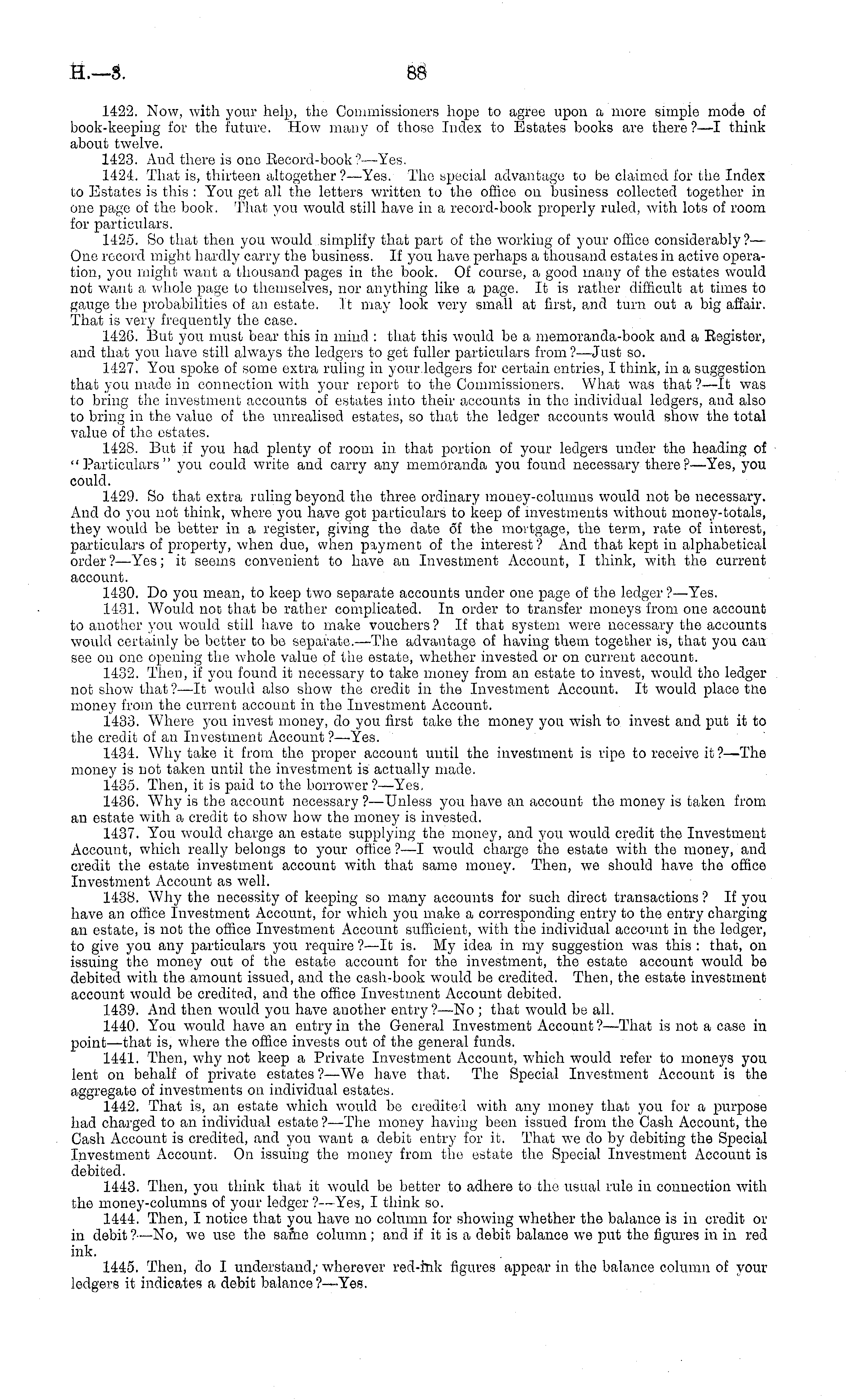 1422. Now, with your help, the Commissioners hope to agree upon a more simple mode of book-keeping for the future. How many of those Index to Estates books are there?—l think about twelve. 1423. And there is one Eecord-book°—Yes. 1424. That is, thirteen altogether ?—Yes. The special advantage to be claimed for the Index to Estates is this : You get all the letters written to the office on business collected together in one page of the book. That you would still have in a record-book properly ruled, with lots of room for particulars. 1425. So that then you would, simplify that part of the working of your office considerably?— One record might hardly carry the business. If you have perhaps a thousand estates in active operation, you might want a thousand pages in the book. Of course, a good many of the estates would not want a whole page to themselves, nor anything like a page. It is rather difficult at times to gauge the probabilities of an estate. It may look very small at first, and turn out a big affair. That is very frequently the case. 1426. But you must bear this in mind : that this would be a memoranda-book and a Begister, and that you have still always the ledgers to get fuller particulars from?— Just so. 1427. You spoke of some extra ruling in your.ledgers for certain entries, I think, in a suggestion that you made in connection with your report to the Commissioners. What was that ?—lt was to bring the investment accounts of estates into their accounts in the individual ledgers, and also to bring in the value of the unrealised estates, so that the ledger accounts would show the total value of the estates. 1428. But if you had plenty of room in that portion of your ledgers under the heading of "Particulars" you could write and carry any memoranda you found necessary there?— Yes, you could. 1429. So that extra ruling beyond the three ordinary money-columns would not be necessary. And do you not think, where you have got particulars to keep of investments without money-totals, they would be better in a register, giving the date of the mortgage, the term, rate of interest, particulars of property, when due, when payment of the interest ? And that kept in alphabetical order?— Yes; it seems convenient to have an Investment Account, I think, with the current account. 1430. Do you mean, to keep two separate accounts under one page of the ledger ? —Yes. 1431. Would not that be rather complicated. In order to transfer moneys from one account to another you would still have to make vouchers ? If that system were necessary the accounts would certainly be better to be separate.—The advantage of having them together is, that you can see on one opening the whole value of the estate, whether invested or on current account. 1432. Then, if you found it necessary to take money from an estate to invest, would the ledger not show that ? —lt would also show the credit in the Investment Account. It would place the money from the current account in the Investment Account. 1433. Where you invest money, do you first take the money you wish to invest and put it to the credit of an Investment Account ?—Yes. 1434. Why take it from the proper account until the investment is ripe to receive it?— The money is not taken until the investment is actually made. 1435. Then, it is paid to the borrower?— Yes. 1436. Why is the account necessary ?—Unless you have an account the money is taken from an estate with a credit to show how the money is invested. 1437. You would charge an estate supplying the money, and you would credit the Investment Account, which really belongs to your office ? —I would charge the estate with the money, and credit the estate investment account with that same money. Then, we should have the office Investment Account as well. 1438. Why the necessity of keeping so many accounts for such direct transactions ? If you have an office Investment Account, for which you make a corresponding entry to the entry charging an estate, is not the office Investment Account sufficient, with the individual account in the ledger, to give you any particulars you require ?—lt is. My idea in my suggestion was this : that, on issuing the money out of the estate account for the investment, the estate account would be debited with the amount issued, and the cash-book would be credited. Then, the estate investment account would be credited, and the office Investment Account debited. 1439. And then would you have another entry ?—No ; that would be all. 1440. You would have an entry in the General Investment Account ?—That is not a case in point—that is, where the office invests out of the general funds. 1441. Then, why not keep a Private Investment Account, which would refer to moneys you lent on behalf of private estates ? —We have that. The Special Investment Account is the aggregate of investments on individual estates. 1442. That is, an estate which would be credited with any money that you for a purpose had charged to an individual estate? —The money having been issued from the Cash Account, the Cash Account is credited, and you want a debit entry for it. That we do by debiting the Special Investment Account. On issuing the money from the estate the Special Investment Account is debited. 1443. Then, you think that it would be better to adhere to the usual rule in connection with the money-columns of your lodger ?—Yes, I think so. 1444. Then, I notice that you have no column for showing whether the balance is in credit or in debit ?—No, we use the same column ; and if it is a debit balance we put the figures in in red ink. 1445. Then, do I understand,- wherever red-ink figures appear in the balance column of your ledgers it indicates a debit balance?— Yes.