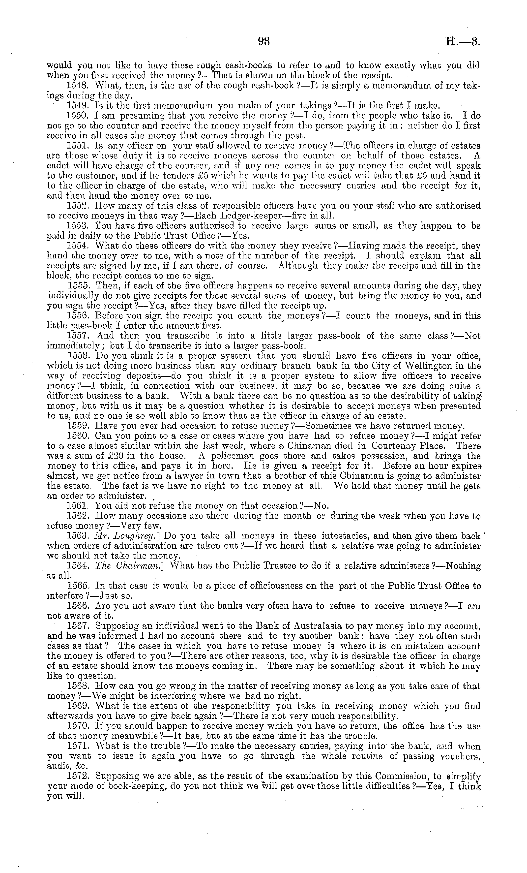 would you not like to have these rough cash-books to refer to and to know exactly what you did when you first received the money?— That is shown on the block of the receipt. 1548. What, then, is the use of the rough cash-book?—lt is simply a memorandum of my takings during the day. 1549. Is it the first memorandum you make of your takings ?-—lt is the first I make. 1550. lam presuming that you receive the money ?—I do, from the people who take it. Ido not go to the counter and receive the money myself from the person paying it in : neither do I first receive in all cases the money that comes through the post. 1551. Is any officer on your staff allowed to receive money?— The officers in charge of estates are those whose duty it is to receive moneys across the counter on behalf of those estates. A cadet will have charge of the counter, and if any one comes in to pay money the cadet will speak to the customer, and if he tenders £5 which he wants to pay the cadet will take that £5 and hand it to the officer in charge of the estate, who will make the necessary entries and the receipt for it, and then hand the money over to me. 1552. How many of this class of responsible officers have you on your staff who are authorised to receive moneys in that wray ?—Each Ledger-keeper—five in all. 1553. You have five officers authorised to receive large sums or small, as they happen to be paid in daily to the Public Trust Office ?—Yes. 1554. What do these officers do with the money they receive ?—Having made the receipt, they hand the money over to me, with a note of the number of the receipt. I should explain that all receipts are signed by me, if lam there, of course. Although they make the receipt and fill in the block, the receipt comes to me to sign. 1555. Then, if each of the five officers happens to receive several amounts during the day, they individually do not give receipts for these several sums of money, but bring the money to you, and you sign the receipt ? —Yes, after they have filled the receipt up. 1556. Before you sign the receipt you count the moneys ?—I count the moneys, and in this little pass-book I enter the amount first. 1557. And then you transcribe it into a little larger pass-book of the same class ?—Not immediately; but Ido transcribe it into a larger pass-book. 1558. Do you think it is a proper system that you should have five officers in your office, which is not doing more business than any ordinary branch bank in the City of Wellington in the way of receiving deposits—do you think it is a proper system to allow five officers to receive money?—l think, in connection with our business, it may be so, because we are doing quite a different business to a bank. With a bank there can be no question as to the desirability of taking money, but with us it may be a question whether it is desirable to accept moneys when presented to us, and no one is so well able to know that as the officer in charge of an estate. 1559. Have you ever had occasion to refuse money ?—Sometimes we have returned money. 1560. Can you point to a case or cases where you have had to refuse money ?—I might refer to a case almost similar within the last week, where a Chinaman died in Courtenay Place. There was a sum of £20 in the house. A policeman goes there and takes possession, and brings the money to this office, and pays it in here. He is given a receipt for it. Before an hour expires almost, we get notice from a lawyer in town that a brother of this Chinaman is going to administer the estate. The fact is we have no right to the money at all. We hold that money until he gets an order to administer. 1561. You did not refuse the money on that occasion?— No. 1562. How many occasions are there during the month or during the week when you have to refuse money ? —Very few. 1563. Mr. Lioughrey.] Do you take all moneys in these intestacies, and then give them back when orders of administration are taken out ?—lf we heard that a relative was going to administer we should not take the money. 1564. The Chairman.] What has the Public Trustee to do if a relative administers ?—Nothing at all. 1565. In that case it would he a piece of officiousness on the part of the Public Trust Office to interfere ?—Just so. 1566. Are you not aware that the banks very often have to refuse to receive moneys?—l am not aware of it. 1567. Supposing an individual went to the Bank of Australasia to pay money into my account, and he was informed I had no account there and to try another bank: have they not often such cases as that ? The cases in which you have to refuse money is where it is on mistaken account the money is offered to you? —There are other reasons, too, why it is desirable the officer in charge of an estate should know the moneys coming in. There may be something about it which he may like to question. 1568. How can you go wrong in the matter of receiving money as long as you take care of that money ?—We might be interfering where we had no right. 1569. What is the extent of the responsibility you take in receiving money which you find afterwards you have to give back again ?—There is not very much responsibility. 1570. If you should happen to receive money which you have to return, the office has the use of that money meanwhile ?—lt has, but at the same time it has the trouble. 1571. What is the trouble?—To make the necessary entries, paying into the bank, and when you want to issue it again have to go through the whole routine of passing vouchers, audit, &c. 1572. Supposing we are able, as the result of the examination by this Commission, to simplify your mode of book-keeping, do you not think we will get over those little difficulties?— Yes, I think you will,