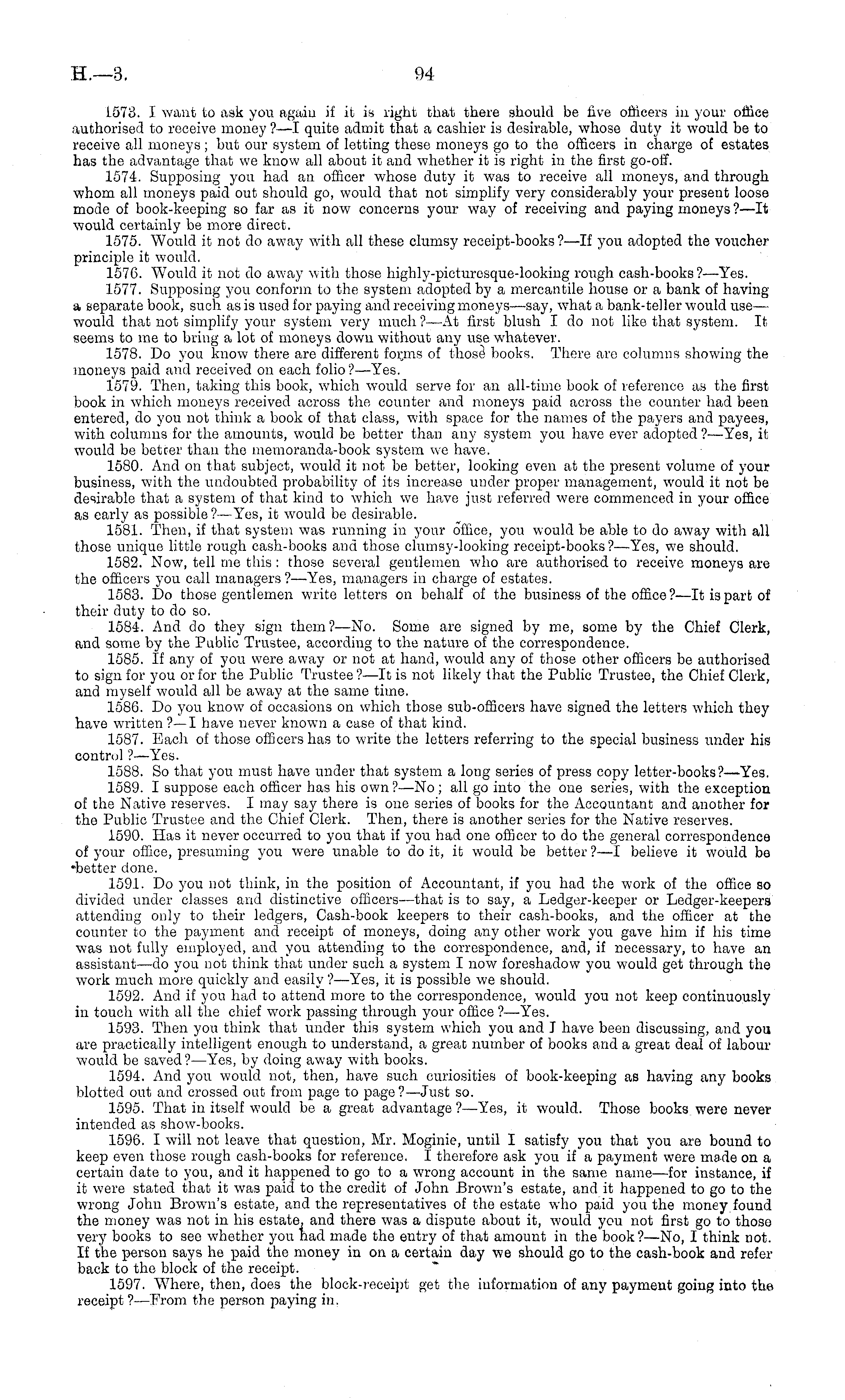 1573. I want to ask you again if it is right that there should be five officers in your office authorised to receive money ?—I quite admit that a cashier is desirable, whose duty it would be to receive all moneys; but our system of letting these moneys go to the officers in charge of estates has the advantage that we know all about it and whether it is right in the first go-off. 1574. Supposing you had an officer whose duty it was to receive all moneys, and through whom all moneys paid out should go, would that not simplify very considerably your present loose mode of book-keeping so far as it now concerns your way of receiving and paying moneys ? —lt would certainly be more direct. 1575. Would it not do away with all these clumsy receipt-books ? —lf you adopted the voucher principle it would. 1576. Would it not do away with those highly-picturesque-looking rough cash-books?—-Yes. 1577. Supposing you conform to the system adopted by a mercantile house or a bank of having a separate book, such as is used for paying and receiving moneys—say, what a bank-teller would use— would that not simplify your system very much ?—At first blush I do not like that system. It seems to me to bring a lot of moneys down without any use whatever. 1578. Do you know there are different forms of those books. There are columns showing the moneys paid and received on each folio ?—Yes. 1579. Then, taking this book, which would serve for an all-time book of reference as the first book in which moneys received across the counter and moneys paid across the counter had been entered, do you not think a book of that class, with space for the names of the payers and payees, with columns for the amounts, would be better than any system you have ever adopted ?—Yes, it would be better than the memoranda-book system wo have. 1580. And on that subject, would it not be better, looking even at the present volume of your business, with the undoubted probability of its increase under proper management, would it not be desirable that a system of that kind to which wo have just referred were commenced in your office as early as possible?— Yes, it would be desirable. 1581. Then, if that system was running in your office, you would be able to do away with all those unique little rough cash-books and those clumsy-looking receipt-books?— Yes, we should. 1582. Now, tell me this: those several gentlemen who are authorised to receive moneys are the officers you call managers ?—Yes, managers in charge of estates. 1583. Do those gentlemen write letters on behalf of the business of the office ?—lt is part of their duty to do so. 1584. And do they sign them?—No, Some are signed by me, some by the Chief Clerk, and some by the Public Trustee, according to the nature of the correspondence. 1585. If any of you were away or not at hand, would any of those other officers be authorised to sign for you or for the Public Trustee ? —lt is not likely that the Public Trustee, the Chief Clerk, and myself would all be away at the same time. 1586. Do you know of occasions on which those sub-officers have signed the letters which they have written ?—I have never known a case of that kind. 1587. Each of those officers has to write the letters referring to the special business under his contrul ?—Yes. 1588. So that you must have under that system a long series of press copy letter-books?— Yes. 1589. I suppose each officer has his own ?—No ; all go into the one series, with the exception of the Native reserves. I may say there is one series of books for the Accountant and another for the Public Trustee and the Chief Clerk. Then, there is another series for the Native reserves. 1590. Has it never occurred to you that if you had one officer to do the general correspondence of your office, presuming you were unable to doit, it would be better?—l believe it would be -better done. 1591. Do you not think, in the position of Accountant, if you had the work of the office so divided under classes and distinctive officers—that is to say, a Ledger-keeper or Ledger-keepers attending only to their ledgers, Cash-book keepers to their cash-books, and the officer at the counter to the payment and receipt of moneys, doing any other work you gave him if his time was not fully employed, and you attending to the correspondence, and, if necessary, to have an assistant —do you not think that under such a system I now foreshadow you would get through the work much more quickly and easily ? —Yes, it is possible we should. 1592. And if you had to attend more to the correspondence, would you not keep continuously in touch with all the chief work passing through your office ? —Yes. 1593. Then you think that under this system which you and I have been discussing, and you are practically intelligent enough to understand, a great number of books and a great deal of labour would be saved? —Yes, by doing away with books. 1594. And you would not, then, have such curiosities of book-keeping as having any books blotted out and crossed out from page to page?— Just so. 1595. That in itself would be a great advantage ?—Yes, it would. Those books were never intended as show-books. 1596. I will not leave that question, Mr. Moginie, until I satisfy you that you are bound to keep even those rough cash-books for reference. I therefore ask you if a payment were made on a certain date to you, and it happened to go to a wrong account in the same name—for instance, if it were stated that it was paid to the credit of John Brown's estate, and it happened to go to the wrong John Brown's estate, and the representatives of the estate who paid you the money found the money was not in his estate, and there was a dispute about it, would you not first go to those very books to see whether you had made the entry of that amount in the book?—No, I think not. If the person says he paid the money in on a certain day we should go to the cash-book and refer back to