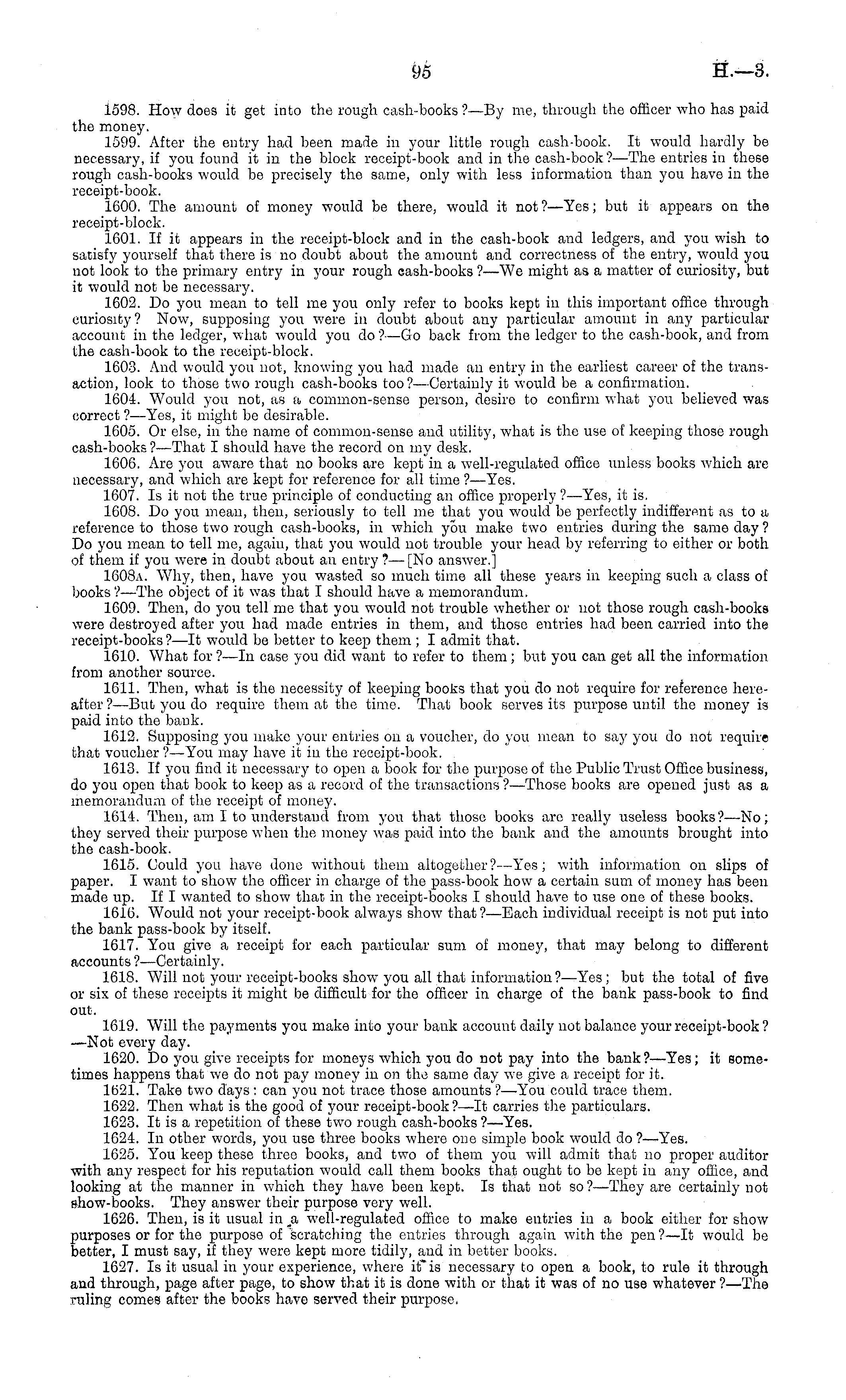 1598. How does it get into the rough cash-books ?—By me, through the officer who has paid the money. 1599. After the entry had been made in your little rough cash-book. It would hardly be necessary, if you found it in the block receipt-book and in the cash-book ? —The entries in these rough cash-books would be precisely the same, only with less information than you have in the receipt-book. 1600. The amount of money would be there, would it not?— Yes; but it appears on the receipt-block. 1601. If it appears in the receipt-block and in the cash-book and ledgers, and you wish to satisfy yourself that there is no doubt about the amount and correctness of the entry, would you not look to the primary entry in your rough cash-books ? —We might as a matter of curiosity, but it would not be necessary. 1602. Do you mean to tell me you only refer to books kept in this important office through curiosity? Now, supposing you were in doubt about any particular amount in any particular account in the ledger, what would you do ? —Go back from the ledger to the cash-book, and from the cash-book to the receipt-block. 1603. And would you not, knowing you had made an entry in the earliest career of the transaction, look to those two rough cash-books too?— Certainly it would be a confirmation. 1604. Would you not, as a common-sense person, desire to confirm what you believed was correct ?—Yes, it might be desirable. 1605. Or else, in the name of common-sense and utility, what is the use of keeping those rough cash-books ?—That I should have the record on my desk. 1606. Are you aware that no books are kept in a well-regulated office unless books which are necessary, and which are kept for reference for all time ?—Yes. 1607. Is it not the true principle of conducting an office properly ?—Yes, it is. 1608. Do you mean, then, seriously to tell me that you would bo perfectly indifferent as to a reference to those two rough cash-books, in which you make two entries during the same day ? Do you mean to tell me, again, that you would not trouble your head by referring to either or both of them if you w _ere in doubt about an entry ? — [No answer.] 1608 a. Why, then, have you wasted so much time all these years in keeping such a class of books?— The object of it was that I should have a memorandum. 1609. Then, do you tell mo that you would not trouble whether or not those rough cash-books were destroyed after you had made entries in them, and those entries had been carried into the receipt-books ? —lt would be better to keep them ; I admit that. 1610. What for ?—ln case you did want to refer to them; but you can get all the information from another source. 1611. Then, what is the necessity of keeping books that you do not require for reference hereafter? —But you do require them at the time. That book serves its purpose until the money is paid into the bank. 1612. Supposing you make your entries on a voucher, do you mean to say you do not require that voucher?— You may have it in the receipt-book. 1613. If you find it necessary to open a book for the purpose of the Public Trust Office business, do you open that book to keep as a record of the transactions ?—Those books are opened just as a memorandum of the receipt of money. 1614. Then, am I to understand from you that those books are really useless books?—No; they served their purpose when the money was paid into the bank and the amounts brought into the cash-book. 1615. Could you have done without them altogether?— Yes; with information on slips of paper. I want to show the officer in charge of the pass-book how a certain sum of money has been made up. If I wanted to show that in the receipt-books I should have to use one of these books. 1616. Would not your receipt-book always show that?— Each individual receipt is not put into the bank pass-book by itself. 1617. You give a receipt for each particular sum of money, that may belong to different accounts ?—Certainly. 1618. Will not your receipt-books show you all that information ?—Yes ; but the total of five or six of these receipts it might be difficult for the officer in charge of the bank pass-book to find out. 1619. Will the payments you make into your bank account daily not balance your receipt-book ? —Not every day. 1620. Do you give receipts for moneys which you do not pay into the bank?— Yes; it sometimes happens that we do not pay money in on the same day we give a receipt for it. 1621. Take two days : can you not trace those amounts ? —You could trace them. 1622. Then what is the good of your receipt-book?—lt carries the particulars. 1623. It is a repetition of these two rough cash-books ?—Yes. 1624. In other words, you use three books where one simple book would do ?—Yes. 1625. You keep these three books, and two of them you will admit that no proper auditor with any respect for his reputation would call them books that ought to be kept in any office, and looking at the manner in which they have been kept. Is that not so?— They are certainly not show-books. They answer their purpose very well. 1626. Then, is it usual in a, well-regulated office to make entries in a book either for show purposes or for the purpose of scratching the entries through again with the pen?—lt would be better, I must say, if they were kept more tidily, and in better books. 1627. Is it usual in your experience, where it"is necessary to open a book, to rule it through and through, page after page, to show that it is done with or that it was of no use whatever ?—The ruling comes after the books have served their purpose.