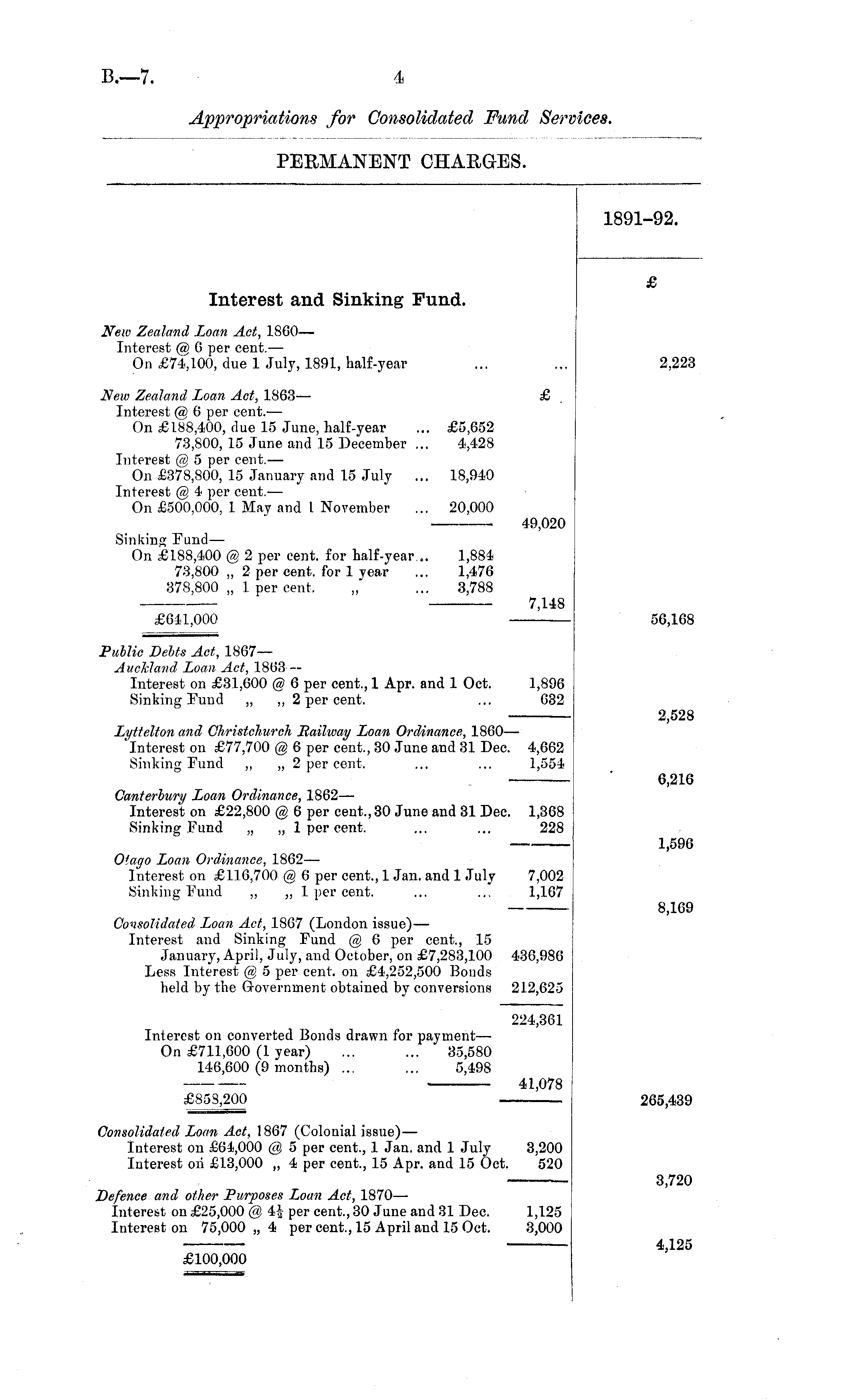 1891-92. Interest and Sinking Fund. £ New Zealand Loan Act, 1860— Interest @ G per cent. —■ On £74,100, due 1 July, 1891, half-year 2,223 New Zealand Loan Act, 1863 — £ Interest @ 6 per cent. — On £188,400, due 15 June, half-year ... £5,652 73,800, 15 June and 15 December ... 4,428 Interest @ 5 per cent.— On £378,800, 15 January and 15 July ... 18,940 Interest @ 4 per cent.— On £500,000, 1 May and L November ... 20,000 49,020 Sinking Fund — On £188,400 @ 2 per cent, for half-year... 1,884 73,800 „ 2 per cent, for 1 year ... 1,476 378,800 „ 1 per cent, „ ... 3,788 56,168 7,148 £641,000 Public Debts Act, 1867— Auckland Loan Act, 1863— Interest on £31,600 @ 6 per cent., 1 Apr. and 1 Oct. 1,896 Sinking Fund ,, ,, 2 per cent. ... 632 2,528 Lyttelton and Ohristchurch Railway Loan Ordinance, 1860 — on £77,700 @ 6 per cent., 30 June and 31 Dec. 4,662 Sinking Fund ,, „ 2 per cent. ... ... 1,554 Canterbury Loan Ordinance, 1862 — Interest on £22,800 @ 6 per cent.,30 June and 31 Dec. 1,368 Sinking Fund „ „ 1 per cent. ... ... 228 6,216 1,596 Otago Loan Ordinance, 1862— Interest on £116,700 @ 6 per cent., 1 Jan. and 1 July 7,002 Sinking Fund „ „ 1 per cent. ... ... 1,167 Consolidated Loan Act, 1867 (London issue) — Interest and Sinking Fund @ 6 per cent., 15 January, April, July, and October, on £7,283,100 436,986 Less Interest @ 5 per cent, on £4,252,500 Bonds held by the Government obtained by conversions 212,625 8,169 224,361 Interest on converted Bonds drawn for payment — On £711,600 (1 year) ... ... 35,580 146,600 (9 months) ... ... 5,498 265,439 41,078 £858,200 Consolidated Loan Act, 1867 (Colonial issue) — Interest on £64,000 @ 5 per cent., 1 Jan. and 1 July 3,200 Interest oil £13,000 „ 4 per cent., 15 Apr. and 15 Oct. 520 3,720 Defence and other Purposes Loan Act, 1870 — Interest on £25,000 @ 44 per cent., 30 June and 31 Dec. 1,125 Interest on 75,000 „ 4 per cent., 15 April and 15 Oct. 3,000 4,125 £100,000