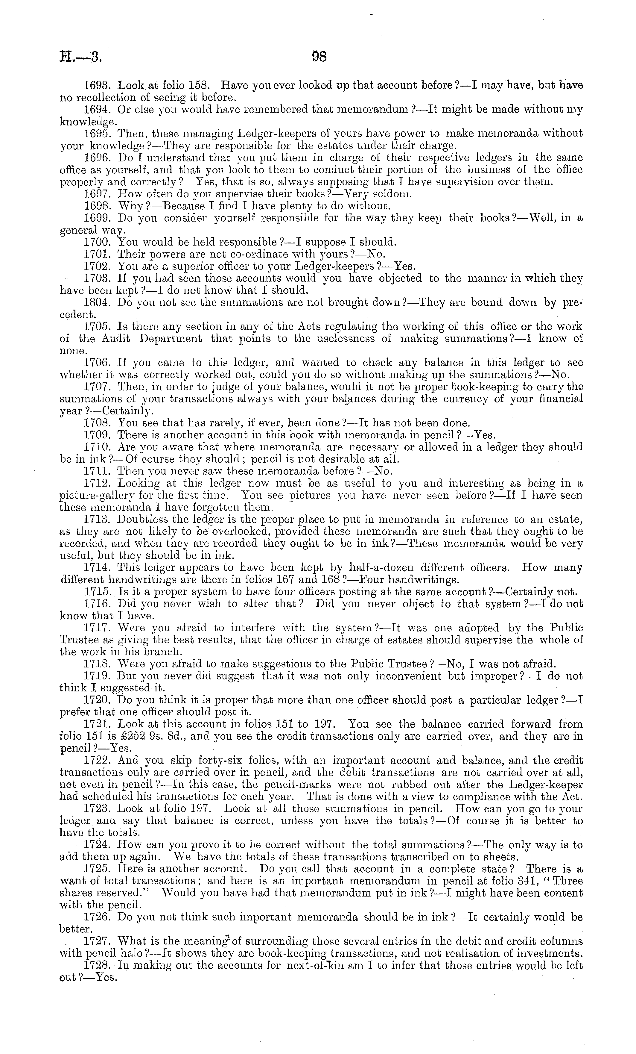 1693. Look at folio 158. Have you ever looked up that account before ?—I may have, but have no recollection of seeing it before. 1694. Or else you would have remembered that memorandum ? —lt might be made without my knowledge. 1695. Then, these managing Ledger-keepers of yours have power to make memoranda without your knowledge ? —They are responsible for the estates under their charge. 1696. Do I understand that you put them in charge of their respective ledgers in the same office as yourself, and that you look to them to conduct their portion of the business of the office properly and correctly?— Yes, that is so, always supposing that I have supervision over them. 1697. How often do you supervise their books?— Very seldom. 1698. Why? —Because I find I have plenty to do without. 1699. Do you consider yourself responsible for the way they keep their books? —Well, in a general way. 1700. You would be held responsible ?—I suppose I should. 1701. Their powers are not co-ordinate with yours?— No. 1702. You are a superior officer to your Ledger-keepers ?—Yes. 1703. If you had seen those accounts would you have objected to the manner in which they have been kept ? —I do not know that I should. 1804. Do you not see the summations are not brought down?— They are bound down by precedent. 1705. Is there any section in any of the Acts regulating the working of this office or the work of the Audit Department that points to the uselessness of making summations?—l know of none. 1706. If you came to this ledger, and wanted to check any balance in this ledger to see whether it was correctly worked out, could you do so without making up the summations ?—No. 1707. Then, in order to judge of your balance, would it not be proper book-keeping to carry the summations of your transactions always with your balances during the currency of your financial year ?—Certainly. 1708. You see that has rarely, if ever, been done?—lt has not been done. 1709. There is another account in this book with memoranda in pencil?— Yes. 1710. Are you aware that where memoranda are necessary or allowed in a ledger they should be in ink ? —Of course they should ; pencil is not desirable at all. 1711. Then you never saw these memoranda before ?—No. 1712. Looking at this ledger now must be as useful to you and interesting as being in a picture-gallery for the first time. You see pictures you have never seen before?—-If I have seen these memoranda I have forgotten them. 1713. Doubtless the ledger is the proper place to put in memoranda in reference to an estate, as they are not likely to be overlooked, provided these memoranda are such that they ought to be recorded, and when they are recorded they ought to be in ink ?—These memoranda would be very useful, but they should be in ink. 1714. This ledger appears to have been kept by half-a-dozen different officers. How many different handwritings are there in folios 167 and 168 ? —Four handwritings. 1715. Is it a proper system to have four officers posting at the same account ?—Certainly not. 1716. Did you never wish to alter that? Did you never object to that system?—l do not know that I have. 1717. Were you afraid to interfere with the system? —It was one adopted by the Public Trustee as giving the best results, that the officer in charge of estates should supervise the whole of the work in his branch. 1718. Were you afraid to make suggestions to the Public Trustee?—No, I was not afraid. 1719. But you never did suggest that it was not only inconvenient but improper?—l do not think I suggested it. 1720. Do you think it is proper that more than one officer should post a particular ledger ?—I prefer that one officer should post it. 1721. Look at this account in folios 151 to 197. You see the balance carried forward from folio 151 is £252 9s. Bd., and you see the credit transactions only are carried over, and they are in pencil ? —Yes. 1722. And you skip forty-six folios, with an important account and balance, and the credit transactions only are carried over in pencil, and the debit transactions are not carried over at all, not even in pencil ? —ln this case, the pencil-marks were not rubbed out after the Ledger-keeper had scheduled his transactions for each year. That is clone with a view to compliance with the Act. 1723. Look at folio 197. Look at all those summations in pencil. How can you go to your ledger and say that balance is correct, unless you have the totals ?—Of course it is better to have the totals. 1724. How can you prove it to be correct without the total summations?— The only way is to add them up again. We have the totals of these transactions transcribed on to sheets. 1725. Here is another account. Do you call that account in a complete state? There is a want of total transactions; and here is an important memorandum in pencil at folio 341, " Three shares reserved." Would you have had that memorandum put in ink?—l might have been content with the pencil. 1726. Do you not think such important memoranda should be in ink ?—lt certainly would be better. 1727. What is the meaning of surrounding those several entries in the debit and credit columns with pencil halo?—lt shows they are book-keeping transactions, and not realisation of investments. 1728. In making out the accounts for next-of-kin am I to infer that those entries would be left out ?—Yes.