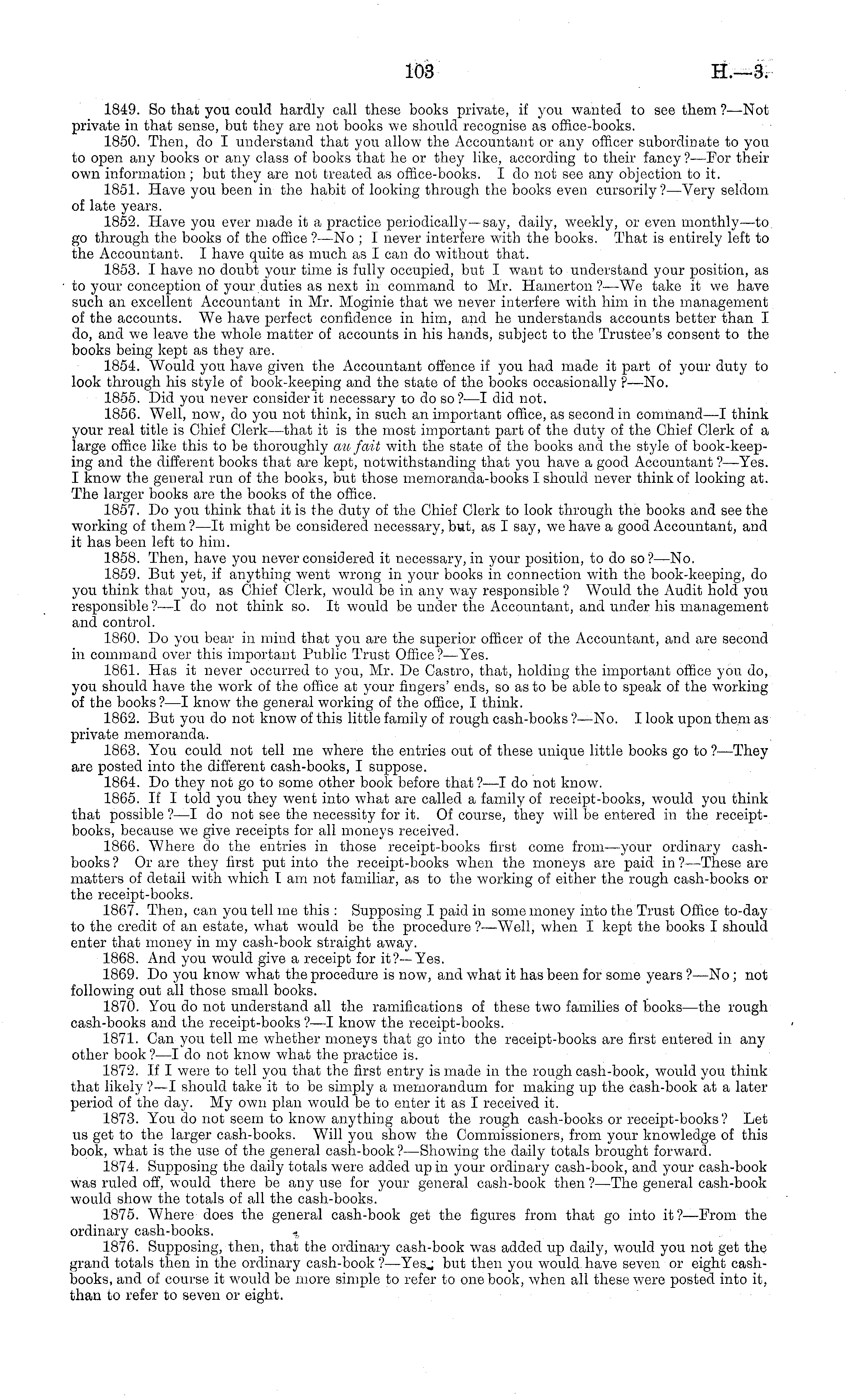 1849. So that you could hardly call these books private, if you wanted to see them ?—Not private in that sense, but they are not books we should recognise as office-books. 1850. Then, do I understand that you allow the Accountant or any officer subordinate to you to open any books or any class of books that he or they like, according to their fancy ? —For their own information; but they are not treated as office-books. I do not see any objection to it. 1851. Have you been in the habit of looking through the books even cursorily?— Very seldom of late years. 1852. Have you ever made it a practice periodically—say, daily, weekly, or even monthly—to go through the books of the office ?—No ; I never interfere with the books. That is entirely left to the Accountant. I have quite as much as I can do without that. 1853. I have no doubt your time is fully occupied, but I want to understand your position, as to your conception of your duties as next in command to Mr. Hainerton ?—We take it we have such an excellent Accountant in Mr. Moginie that we never interfere with him in the management of the accounts. We have perfect confidence in him, and he understands accounts better than I do, and we leave the whole matter of accounts in his hands, subject to the Trustee's consent to the books being kept as they are. 1854. Would you have given the Accountant offence if you had made it part of your duty to look through his style of book-keeping and the state of the books occasionally ? —No. 1855. Did you never consider it necessary to do so? —I did not. 1856. Well, now, do you not think, in such an important office, as second in command—l think your real title is Chief Clerk—that it is the most important part of the duty of the Chief Clerk of a large office like this to be thoroughly au fait with the state of the books and the style of book-keep-ing and the different books that are kept, notwithstanding that you have a good Accountant ?—Yes. I know the general run of the books, but those memoranda-books I should never think of looking at. The larger books are the books of the office. 1857. Do you think that it is the duty of the Chief Clerk to look through the books and see the working of them?—lt might be considered necessary, but, as I say, we have a good Accountant, and it has been left to him. 1858. Then, have you never considered it necessary, in your position, to do so?— No. 1859. But yet, if anything went wrong in your books in connection with the book-keeping, do you think that you, as Chief Clerk, would be in any way responsible ? Would the Audit hold you responsible ?—I do not think so. It would be under the Accountant, and under his management and control. 1860. Do you bear in mind that you are the superior officer of the Accountant, and are second in command over this important Public Trust Office? —Yes. 1861. Has it never occurred to you, Mr. De Castro, that, holding the important office you do, you should have the work of the office at your fingers' ends, so as to be able to speak of the w rorking of the books?—l know the general working of the office, I think. 1862. But you do not know of this little family of rough cash-books ?—No. I look upon them as private memoranda. 1863. You could not tell me where the entries out of these unique little books go to ? —They are posted into the different cash-books, I suppose. 1864. Do they not go to some other book before that ?—I do not know. 1865. If I told you they went into what are called a family of receipt-books, would you think that possible ? —I do not see the necessity for it. Of course, they will be entered in the receiptbooks, because we give receipts for all moneys received. 1866. Where do the entries in those receipt-books first come from—your ordinary cashbooks? Or are they first put into the receipt-books when the moneys are paid in?— These are matters of detail with which I am not familiar, as to the working of either the rough cash-books or the receipt-books. 1867. Then, can you tell me this : Supposing I paid in some money into the Trust Office to-day to the credit of an estate, what would be the procedure ?—Well, when I kept the books I should enter that money in my cash-book straight away. 1868. And you would give a receipt for it?— Yes. 1869. Do you know what the procedure is now, and what it has been for some years ?—No; not following out all those small books. 1870. You do not understand all the ramifications of these two families of books—the rough cash-books and the receipt-books ?—I know the receipt-books. 1871. Can you tell me whether moneys that go into the receipt-books are first entered in any other book?—I do not know what the practice is. 1872. If I were to tell you that the first entry is made in the rough cash-book, would you think that likely ?—I should take it to be simply a memorandum for making up the cash-book at a later period of the day. My own plan would be to enter it as I received it. 1873. You do not seem to know anything about the rough cash-books or receipt-books ? Let us get to the larger cash-books. Will you show the Commissioners, from your knowledge of this book, what is the use of the general cash-book?— Showing the daily totals brought forward. 1874. Supposing the daily totals were added up in your ordinary cash-book, and your cash-book was ruled off, would there be any use for your general cash-book then ?—The general cash-book would show the totals of all the cash-books. 1875. Where does the general cash-book get the figures from that go into it? —From the ordinary cash-books. -. 1876. Supposing, then, that the ordinary cash-book was added up daily, would you not get the grand totals then in the ordinary cash-book ?—Yesj but then you would have seven or eight cashbooks, and of course it would be more simple to refer to one book, when all these were posted into it, than to refer to seven or eight.