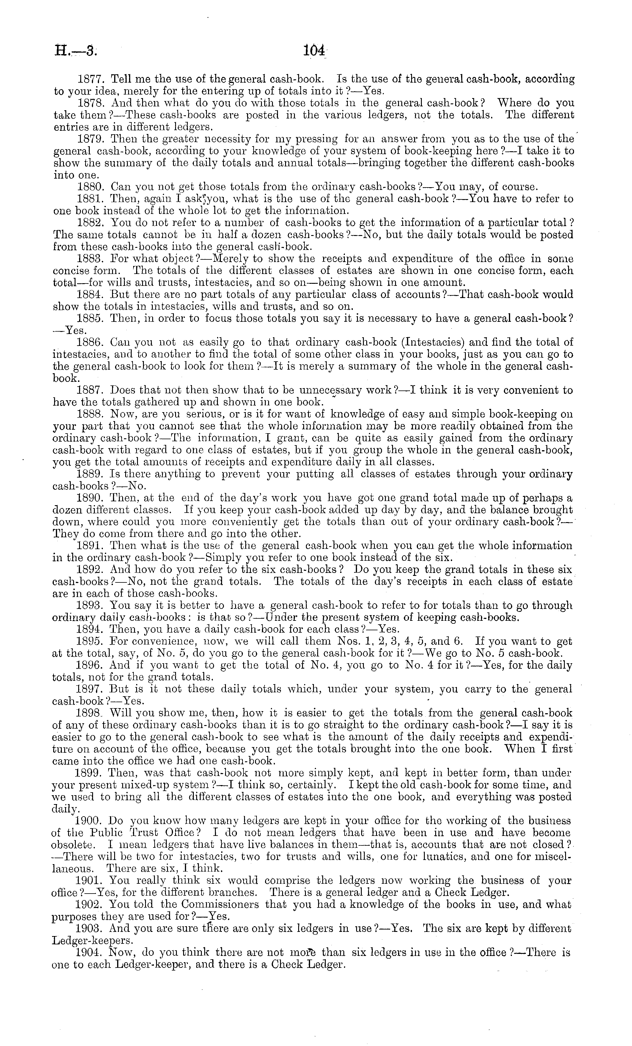 1877. Tell me the use of the general cash-book. Is the use of the general cash-book, according to your idea, merely for the entering up of totals into it ?—Yes. 1878. And then what do you do with those totals in the general cash-book ? Where do you take them ?—These cash-books are posted in the various ledgers, not the totals. The different entries are in different ledgers. 1879. Then the greater necessity for my pressing for an answer from you as to the use of the general cash-book, according to your knowledge of your system of book-keeping here ?—I take it to show the summary of the daily totals and annual totals—bringing together the different cash-books into one. 1880. Can you not get those totals from the ordinary cash-books?— You may, of course. 1881. Then, again I ask'you, what is the use of the general cash-book?— You have to refer to one book instead of the whole lot to get the information. 1882. You do not refer to a number of cash-books to get the information of a particular total ? The same totals cannot be in half a dozen cash-books ?—No, but the daily totals would be posted from these cash-books into the general casli-book. 1883. For what object?— Merely to show the receipts and expenditure of the office in some concise form. The totals of the different classes of estates are shown in one concise form, each total—for wills and trusts, intestacies, and so on —being shown in one amount. 1884. But there are no part totals of any particular class of accounts ?—That cash-book would show the totals in intestacies, wills and trusts, and so on. 1885. Then, in order to focus those totals you say it is necessary to have a general cash-book? —Yes. 1886. Can you not as easily go to that ordinary cash-book (Intestacies) and find the total of intestacies, and to another to find the total of some other class in your books, just as you can go to the general cash-book to look for them ? —lt is merely a summary of the whole in the general cashbook. 1887. Does that not then show that to be unnecessary work?—l think it is very convenient to have the totals gathered up and shown in one book. 1888. Now, are you serious, or is it for want of knowledge of easy and simple book-keeping on your part that you cannot see that the whole information may be more readily obtained from the ordinary cash-book ? —The information, I grant, can be quite as easily gained from the ordinary cash-book with regard to one class of estates, but if you group the whole in the general cash-book, you get the total amounts of receipts and expenditure daily in all classes. 1889. Is there anything to prevent your putting all classes of estates through your ordinary cash-books ?—No. 1890. Then, at the end of the day's work you have got one grand total made up of perhaps a dozen different classes. If you keep your cash-book added up day by day, and the balance brought down, where could you more conveniently get the totals than out of your ordinary cash-book ?— They do come from there and go into the other. 1891. Then what is the use of the general cash-book when you can get the whole information in the ordinary cash-book ? —Simply you refer to one book instead of the six. 1892. And how do you refer to the six cash-books ? Do you keep the grand totals in these six cash-books? —No, not the grand totals. The totals of the day's receipts in each class of estate are in each of those cash-books. 1893. You say it is better to have a general cash-book to refer to for totals than to go through ordinary daily cash-books : is that so? —Under the present system of keeping cash-books. 1894. Then, you have a daily cash-book for each class?— Yes. 1895. For convenience, now, we will call them Nos. 1, 2, 3, 4, 5, and 6. If you want to get at the total, say, of No. 5, do you go to the general cash-book for it ? —We go to No. 5 cash-book. 1896. And if you want to get the total of No. 4, you go to No. 4 for it ?—Yes, for the daily totals, not for the grand totals. 1897. But is it not these daily totals which, under your system, you carry to the general cash-book ? —Yes. 1898. Will you show me, then, how it is easier to get the totals from the general cash-book of any of these ordinary cash-books than it is to go straight to the ordinary cash-book ?—I say it is easier to go to the general cash-book to see what is the amount of the daily receipts and expenditure on account of the office, because you get the totals brought into the one book. When I first came into the office we had one cash-book. 1899. Then, was that cash-book not more simply kept, and kept in better form, than under your present mixed-up system ? —I think so, certainly. I kept the old cash-book for some time, and we used to bring all the different classes of estates into the one book, and everything was posted daily. 1900. Do you know how many ledgers are kept in your office for the working of the business of the Public Trust Office? I do not mean ledgers that have been in use and have become obsolete. I mean ledgers that have live balances in them—that is, accounts that are not closed? —There will be two for intestacies, two for trusts and wills, one for lunatics, and one for miscellaneous. There are six, I think. 1901. You really think six would comprise the ledgers now working the business of your office ? —Yes, for the different branches. There is a general ledger and a Check Ledger. 1902. You told the Commissioners that you had a knowledge of the books in use, and what purposes they are used for?— Yes. 1903. And you are sure there are only six ledgers in use?— Yes. The six are kept by different Ledger-keepers. 1901. Now, do you think there are not mofe than six ledgers in use in the office ?—There is one to each Ledger-keeper, and there is a Check Ledger.
