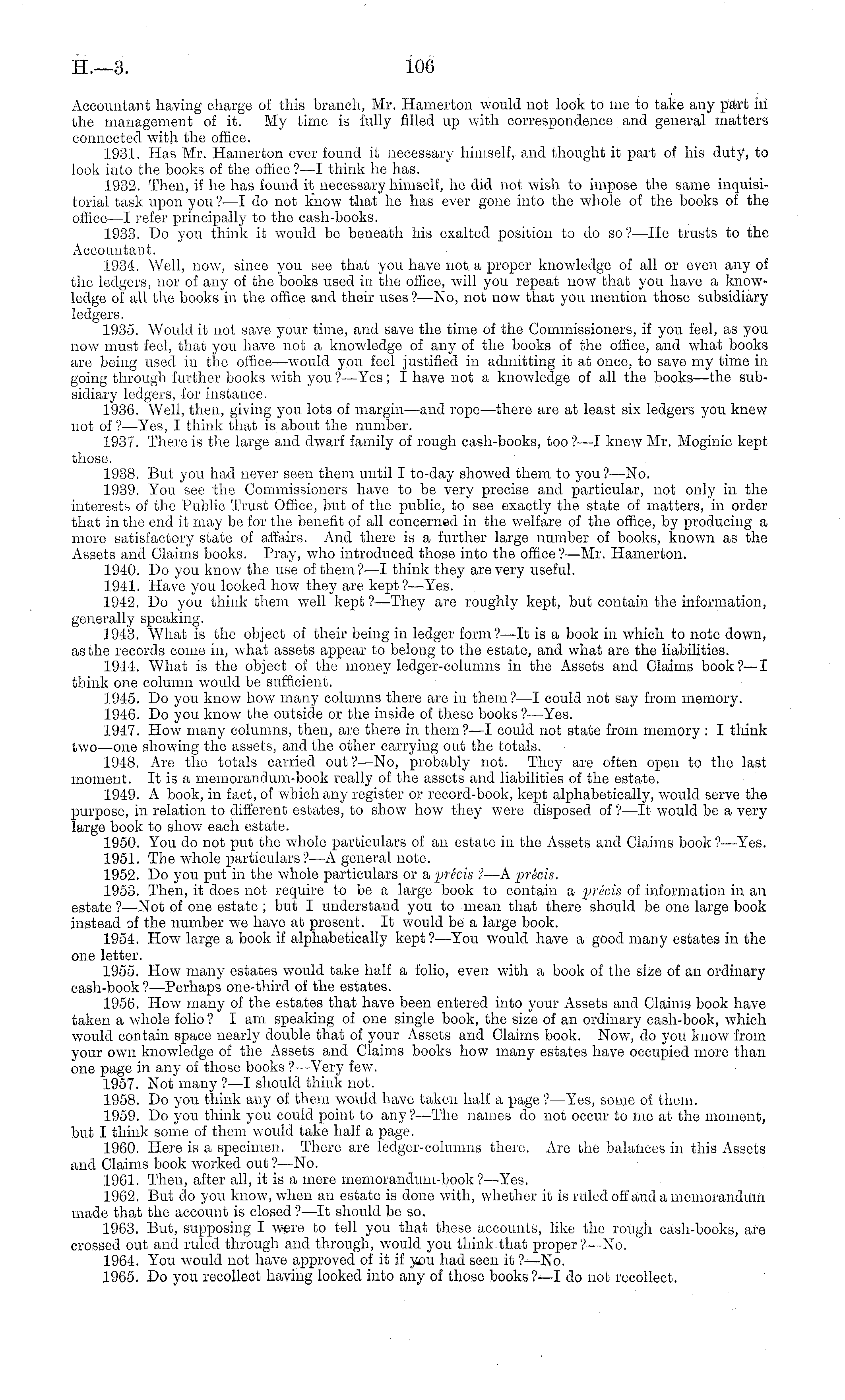 Accountant having charge of this branch, Mr. Hamerton would not look to me to take any part ill the management of it. My time is fully filled up with correspondence and general matters connected with the office. 1931. Has Mr. Hamerton ever found it necessary himself, and thought it part of his duty, to look into the books of the office ?—I think he has. 1932. Then, if he has found it necessary himself, he did not wish to impose the same inquisitorial task upon you ?—I do not know that he has ever gone into the whole of the books of the office—l refer principally to the cash-books, 1933. Do you think it would be beneath his exalted position to do so?—He trusts to the Accountant. 1934. Well, now, since you see that you have not. a proper knowledge of all or even any of the ledgers, nor of any of the books used in the office, will you repeat now that you have a knowledge of all the books in the office and their uses ? —No, not now that you mention those subsidiary ledgers. 1935. Would it not save your time, and save the time of the Commissioners, if you feel, as you now must feel, that you have not a knowledge of any of the books of the office, and what books are being used in the office —would you feel justified in admitting it at once, to save my time in going through further books with you ?—Yes; I have not a knowledge of all the books—the subsidiary ledgers, for instance. 1936. Well, then, giving you lots of margin—and rope—there are at least six ledgers you knew not of ?—Yes, I think that is about the number. 1937. There is the large and dwarf family of rough cash-books, too ?—I knew Mr. Moginic kept those. 1938. But you had never seen them until I to-day showed them to you ? —No. 1939. You see the Commissioners have to be very precise and particular, not only in the interests of the Public Trust Office, but of the public, to see exactly the state of matters, in order that in the end it may be for the benefit of all concerned in the welfare of the office, by producing a more satisfactory state of affairs. And there is a further large number of books, known as the Assets and Claims books. Bray, who introduced those into the office? —Mr. Hamerton. 1940. Do you know the use of them?—l think they are very useful. 1941. Have you looked how they are kept?— Yes. 1942. Do you think them well kept ? —They are roughly kept, but contain the information, generally speaking. 1943. What is the object of their being in ledger form?—lt is a book in which to note down, as the records come in, what assets appear to belong to the estate, and what are the liabilities. 1944. What is the object of the money ledger-columns in the Assets and Claims book?—I think one column would be sufficient. 1945. Do you know how many columns there are in them?—l could not say from memory. 1946. Do you know the outside or the inside of these books ?—Yes. 1947. Flow many columns, then, are there in them?—l could not state from memory : I think two—one showing the assets, and the other carrying out the totals. 1948. Are the totals carried out ?—No, probably not. They are often open to the last moment. It is a memorandum-book really of the assets and liabilities of the estate. 1949. A book, in fact, of which any register or record-book, kept alphabetically, would serve the purpose, in relation to different estates, to show how they were disposed of ?—lt would bo a very large book to show each estate. 1950. You do not put the whole particulars of an estate in the Assets and Claims book ? —Yes. 1951. The whole particulars?—A general note. 1952. Do you put in the whole particulars or a precis I —A precis. 1953. Then, it does not require to be a large book to contain a precis of information in an estate ? —Not of one estate ; but I understand you to mean that there should be one large book instead of the number we have at present. It would bo a large book. 1954. How large a book if alphabetically kept?— You would have a good many estates in the one letter. 1955. How many estates would take half a folio, even with a book of the size of an ordinary cash-book ? —Perhaps one-third of the estates. 1956. How many of the estates that have been entered into your Assets and Claims book have taken a whole folio ? I am speaking of one single book, the size of an ordinary cash-book, which would contain space nearly double that of your Assets and Claims book. Now, do you know from your own knowledge of the Assets and Claims books how many estates have occupied more than one page in any of those books ?—Very few. 1957. Not many ? —I should think not. 1958. Do you think any of them would have taken half a page ? —Yes, some of them. 1959. Do you think you could point to any?— The names do not occur to me at the moment, but I think some of them would take half a page. 1960. Here is a specimen. There are ledger-columns there. Are the balances in this Assets and Claims book worked out? —No. 1961. Then, after all, it is a mere memorandum-book?— Yes. 1962. But do you know, when an estate is done with, whether it is ruled off and a memorandum made that the account is closed ? —lt should be so. 1963. But, supposing I were to tell you that these accounts, like the rough cash-books, are crossed out and ruled through and through, would you think that proper?— No. 1964. You would not have approved of it if you had seen it ?—No. 1965. Do you recollect having looked into any of those books?—l do not recollect.