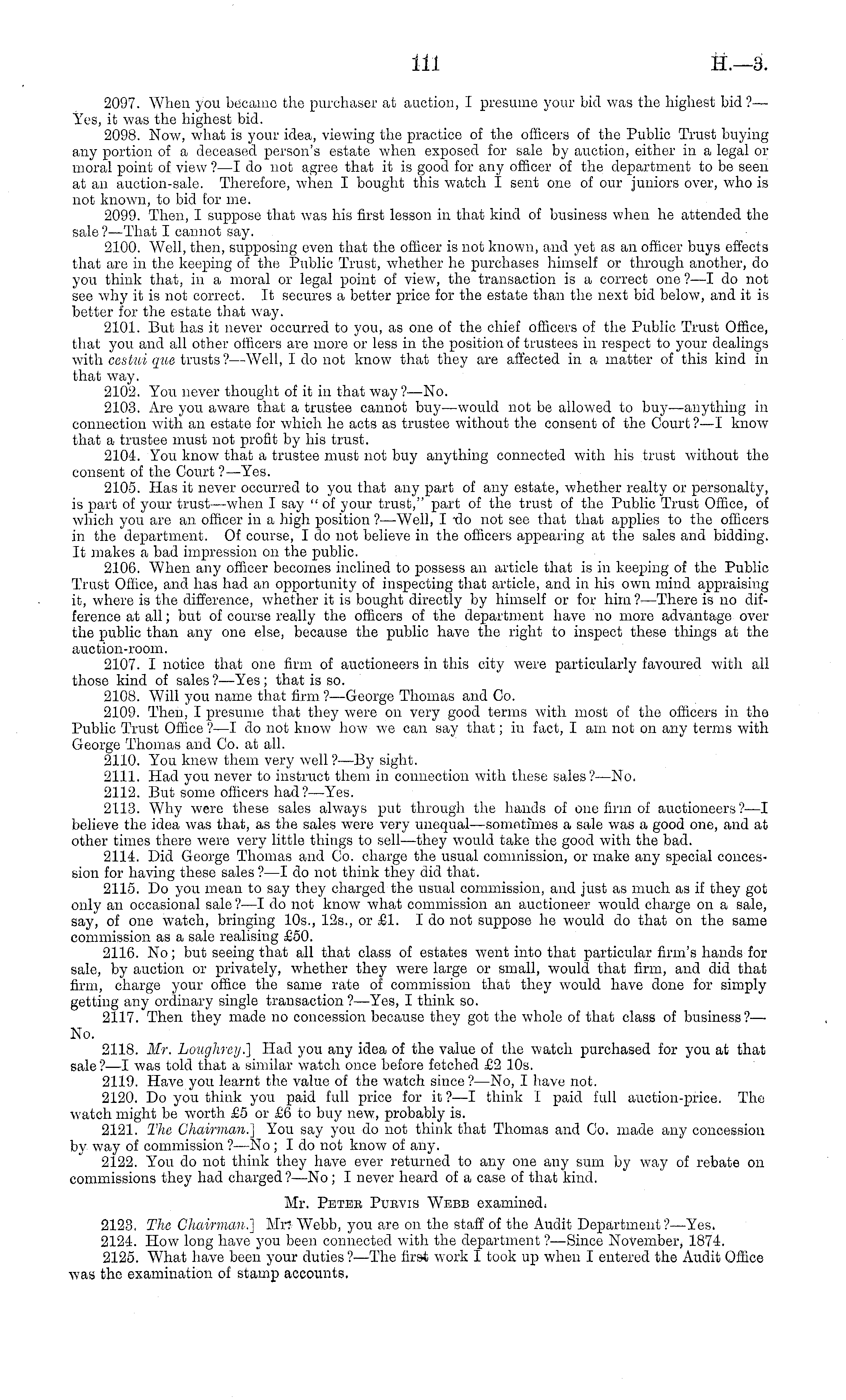 2097. When you became the purchaser at auction, I presume your bid was the highest bid ?— Yes, it was the highest bid. 2098. Now, what is your idea, viewing the practice of the officers of the Public Trust buying any portion of a deceased person's estate when exposed for sale by auction, either in a legal or moral point of view ?—I do not agree that it is good for any officer of the department to be seen at an auction-sale. Therefore, when I bought this watch I sent one of our juniors over, who is not known, to bid for inc. 2099. Then, I suppose that was his first lesson in that kind of business when he attended the sale ? —That I cannot say. 2100. Well, then, supposing even that the officer is not known, and yet as an officer buys effects that are in the keeping of the Public Trust, whether he purchases himself or through another, do you think that, in a moral or legal point of view, the transaction is a correct one?—l do not see why it is not correct. It secures a better price for the estate than the next bid below, and it is better for the estate that way. 2101. But has it never occurred to you, as one of the chief officers of the Public Trust Office, that you and all other officers are more or less in the position of trustees in respect to your dealings with cestui que trusts ?—Well, I do not know that they are affected in a matter of this kind in that way. 2102. You never thought of it in that way?— No. 2103. Are you aware that a trustee cannot buy—would not be allowed to buy—anything in connection with an estate for which he acts as trustee without the consent of the Court ?—I know that a trustee must not profit by his trust. 2104. You know that a trustee must not buy anything connected with his trust without the consent of the Court ?—Yes. 2105. Has it never occurred to you that any part of any estate, whether realty or personalty, is part of your trust —when I say " of your trust," part of the trust of the Public Trust Office, of which you are an officer in a high position ?—Well, I do not see that that applies to the officers in the department. Of course, Ido not believe in the officers appearing at the sales and bidding. It makes a bad impression on the public. 2106. When any officer becomes inclined to possess an article that is in keeping of the Public Trust Office, and has had an opportunity of inspecting that article, and in his own mind appraising it, where is the difference, whether it is bought directly by himself or for him ? —There is no difference at all; but of course really the officers of the department have no more advantage over the public than any one else, because the public have the right to inspect these things at the auction-room. 2107. I notice that one firm of auctioneers in this city were particularly favoured with all those kind of sales ? —Yes ; that is so. 2108. Will you name that firm ?—George Thomas and Co. 2109. Then, I presume that they were on very good terms with most of the officers in the Public Trust Office ?—I do not know how we can say that; in fact, I am not on any terms with George Thomas and Co. at all. 2110. You knew them very well ? —By sight. 2111. Had you never to instruct them in connection with these sales?— No. 2112. But some officers had?— Yes. 2113. Why were these sales always put through the hands of one firm of auctioneers?—l believe the idea was that, as the sales were very unequal—sometimes a sale was a good one, and at other times there were very little things to sell—they would take the good with the bad. 2114. Did George Thomas and Co. charge the usual commission, or make any special concession for having these sales ?—I do not think they did that. 2115. Do you mean to say they charged the usual commission, and just as much as if they got only an occasional sale ?—I do not know what commission an auctioneer would charge on a sale, say, of one watch, bringing 10s., 125., or £1. Ido not suppose he would do that on the same commission as a sale realising £50. 2116. No; but seeing that all that class of estates went into that particular firm's hands for sale, by auction or privately, whether they were large or small, would that firm, and did that firm, charge your office the same rate of commission that they would have done for simply getting any ordinary single transaction?— Yes, I think so. 2117. Then they made no concession because they got the whole of that class of business?— No. 2118. Mr. Loughrey.] Had you any idea of the value of the watch purchased for you at that sale ?—I was told that a similar watch once before fetched £2 10s. 2119. Have you learnt the value of the watch since?—No, I have not. 2120. Do you think you paid full price for it ? —I think I paid full auction-price. The watch might be worth £5 or £6 to buy new, probably is. 2121. The Chairman.] You say you do not think that Thomas and Co. made any concession by way of commission ?—No; I do not know of any. 2122. You do not think they have ever returned to any one any sum by way of rebate on commissions they had charged?—No ; I never heard of a case of that kind. Mr. Petee Pubvis Webb examined* 2123. The Chairman.] Mr. Webb, you are on the staff of the Audit Department?— Yes. 2124. How long have you been connected with the department ?—Since November, 1874. 2125. What have been your duties ? —The first work I took up when I entered the Audit Office was the examination of stamp accounts.