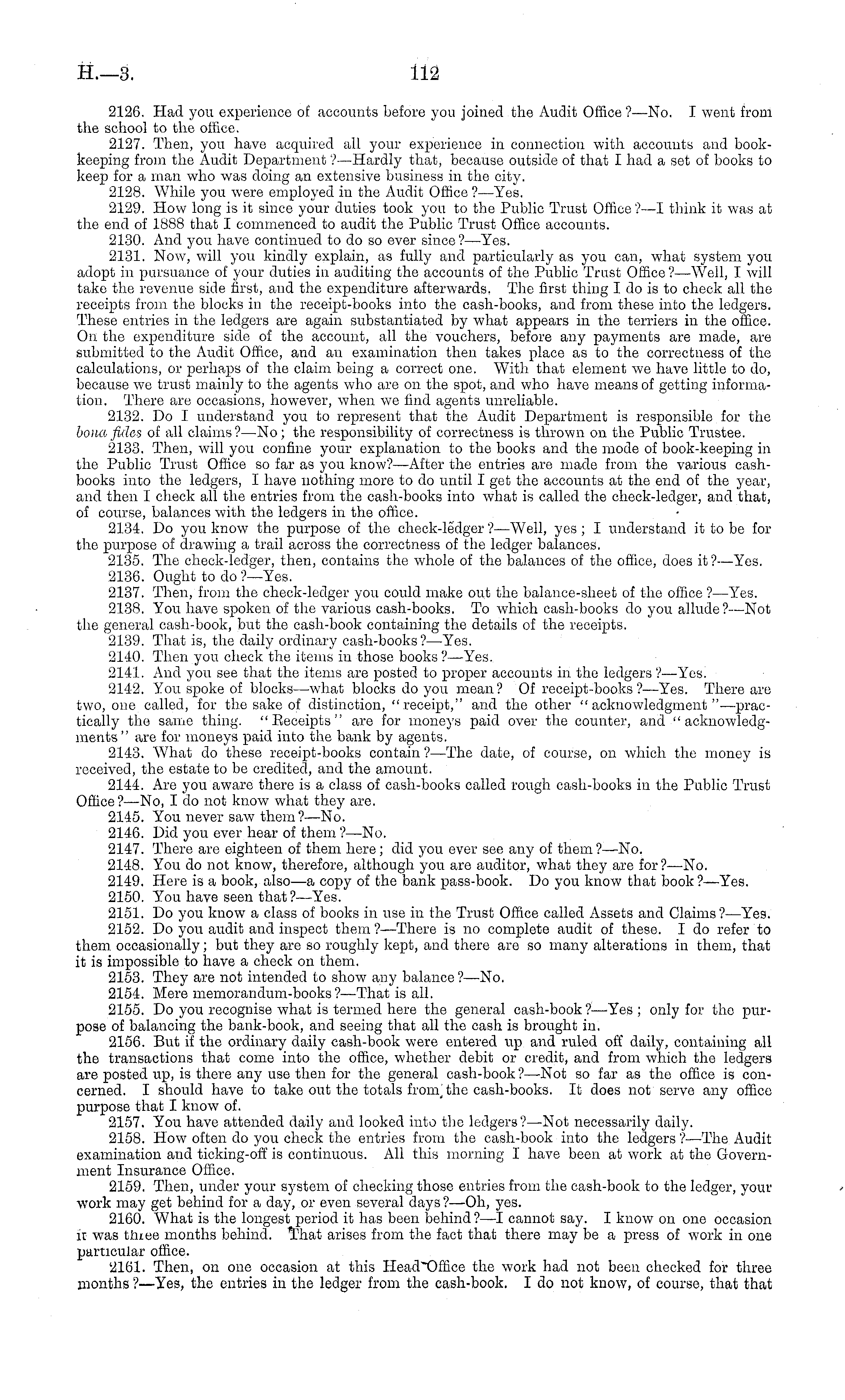 2126. Had you experience of accounts before you joined the Audit Office ?—No. I went from the school to the office. 2127. Then, you have acquired all your experience in connection with accounts and bookkeeping from the Audit Department ?—Hardly that, because outside of that I had a set of books to keep for a man who was doing an extensive business in the city. 2128. While you were employed in the Audit Office ? —Yes. 2129. How long is it since your duties took you to the Public Trust Office ?—I think it was at the end of 1888 that I commenced to audit the Public Trust Office accounts. 2130. And you have continued to do so ever since ?—Yes. 2131. Now, will you kindly explain, as fully and particularly as you can, what system you adopt in pursuance of your duties in auditing the accounts of the Public Trust Office ?—Well, I will take the revenue side first, and the expenditure afterwards. The first thing Idois to check all the receipts from the blocks in the receipt-books into the cash-books, and from these into the ledgers. These entries in the ledgers are again substantiated by what appears in the terriers in the office. On the expenditure side of the account, all the vouchers, before any payments are made, are submitted to the Audit Office, and an examination then takes place as to the correctness of the calculations, or perhaps of the claim being a correct one. With that element we have little to do, because we trust mainly to the agents who are on the spot, and who have means of getting information. There are occasions, however, when we find agents unreliable. 2132. Do I understand you to represent that the Audit Department is responsible for the bona fides of all claims?—No; the responsibility of correctness is thrown on the Public Trustee. 2133. Then, will you confine your explanation to the books and the mode of book-keeping in the Public Trust Office so far as you know?— After the entries are made from the various cashbooks into the ledgers, I have nothing more to do until I get the accounts at the end of the year, and then I check all the entries from the cash-books into what is called the check-ledger, and that, of course, balances with the ledgers in the office. 2134. Do you know the purpose of the check-ledger ? —Well, yes ; I understand it to be for the purpose of drawing a trail across the correctness of the ledger balances. 2135. The check-ledger, then, contains the whole of the balances of the office, does it ?—Yes. 2136. Ought to do ?—Yes. 2137. Then, from the check-ledger you could make out the balance-sheet of the office ?—Yes. 2138. You have spoken of the various cash-books. To which cash-books do you allude?— Not the general cash-book, but the cash-book containing the details of the receipts. 2139. That is, the daily ordinary cash-books?— Yes. 2140. Then you check the items in those books ?—Yes. 2141. And you see that the items are posted to proper accounts in the ledgers ?—Yes. 2142. You spoke of blocks —what blocks do you mean? Of receipt-books?— Yes. There are two, one called, for the sake of distinction, "receipt," and the other "acknowledgment"—practically the same thing. " Eeceipts" are for moneys paid over the counter, and "acknowledgments " are for moneys paid into the bank by agents. 2143. What do these receipt-books contain ?—The date, of course, on which the money is received, the estate to be credited, and the amount. 2144. Are you aware there is a class of cash-books called rough cash-books in the Public Trust Office? —No, I do not know what they are. 2145. You never saw them?— No. 2146. Did you ever hear of them ?—No. 2147. There are eighteen of them here; did you ever see any of them?— No. 2148. You do not know, therefore, although you are auditor, what they are for? —No. 2149. Here is a book, also—a copy of the bank pass-book. Do you know that book ?—Yes. 2150. You have seen that ?—Yes. 2151. Do you know a class of books in use in the Trust Office called Assets and Claims?— Yes. 2152. Do you audit and inspect them ? —There is no complete audit of these. I do refer to them occasionally; but they are so roughly kept, and there are so many alterations in them, that it is impossible to have a check on them. 2153. They are not intended to show any balance ? —No. 2154. Mere memorandum-books?— That is all. 2155. Do you recognise what is termed here the general cash-book?— Yes; only for the purpose of balancing the bank-book, and seeing that all the cash is brought in. 2156. But if the ordinary daily cash-book were entered up and ruled off daily, containing all the transactions that come into the office, whether debit or credit, and from which the ledgers are posted up, is there any use then for the general cash-book ?—Not so far as the office is concerned. I should have to take out the totals froin^ the cash-books. It does not serve any office purpose that I know of. 2157. You have attended daily and looked into the ledgers? —Not necessarily daily. 2158. How often do you chock the entries from the cash-book into the ledgers ?—The Audit examination and ticking-off is continuous. All this morning I have been at work at the Government Insurance Office. 2159. Then, under your system of checking those entries from the cash-book to the ledger, your work may get behind for a day, or even several clays ?—Oh, yes. 2160. What is the longest period it has been behind? —I cannot say. I know on one occasion it was thiee months behind. That arises from the fact that there may be a press of work in one particular office. 2161. Then, on one occasion at this Head~Offico the work had not been checked for three months ?—Yes, the entries in the ledger from the cash-book. Ido not know, of course, that that