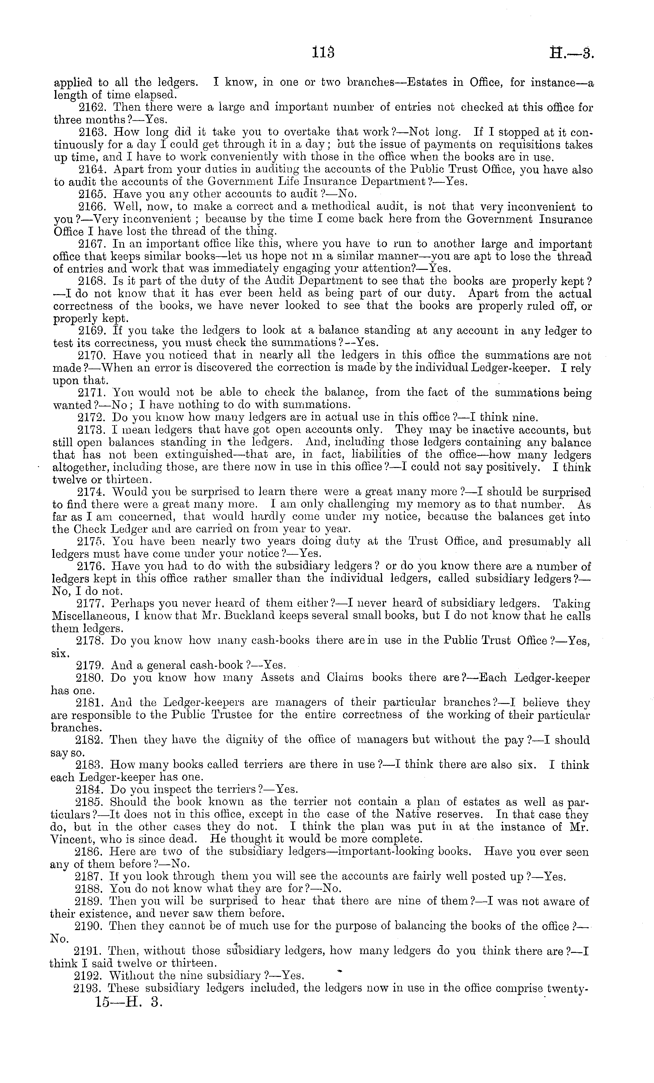 applied to all the ledgers. I know, in one or two branches—Estates in Office, for instance—a length of time elapsed. 2162. Then there were a large and important number of entries not checked at this office for three months?— Yes. 2163. How long did it take you to overtake that work ?—Not long. If I stopped at it continuously for a day I could get through it in a day; but the issue of payments on requisitions takes up time, and I have to work conveniently with those in the office when the books are in use. 2164. Apart from your duties in auditing the accounts of the Public Trust Office, you have also to audit the accounts of the Government Life Insurance Department?— Yes. 2165. Have you any other accounts to audit ?—No. 2166. Well, now, to make a correct and a methodical audit, is not that very inconvenient to you ?—Very inconvenient ; because by the time I come back here from the Government Insurance Office I have lost the thread of the thing. 2167. In an important office like this, where you have to run to another large and important office that keeps similar books—let us hope not in a similar manner—you are apt to lose the thread of entries and work that was immediately engaging your attention?— Yes. 2168. Is it part of the duty of the Audit Department to see that the books are properly kept ? —I do not know that it has ever been held as being part of our duty. Apart from the actual correctness of the books, we have never looked to see that the books are properly ruled off, or properly kept. 2169. If you take the ledgers to look at a balance standing at any account in any ledger to test its correctness, you must check the summations?— Yes. 2170. Have you noticed that in nearly all the ledgers in this office the summations are not made ?—When an error is discovered the correction is made by the individual Ledger-keeper. I rely upon that. 2171. You would not be able to cheek the balance, from the fact of the summations being wanted?—No; I have nothing to do with summations. 2172. Do you know how many ledgers are in actual use in this office ?—I think nine. 2173. I mean ledgers that have got open accounts only. They may be inactive accounts, but still open balances standing in "the ledgers. And, including those ledgers containing any balance that has not been extinguished—that are, in fact, liabilities of the office—how many ledgers altogether, including those, are there now in use in this office?—l could not say positively. I think twelve or thirteen. 2174. Would you. bo surprised to learn there were a great many more ?—I should be surprised to find there were a great many more. lam only challenging my memory as to that number. As far as I am concerned, that would hardly come under my notice, because the balances get into the Check Ledger and are carried on from year to year. 2175. You have been nearly two years doing duty at the Trust Office, and presumably all ledgers must have come under your notice?— Yes. 2176. Have you had to do with the subsidiary ledgers ? or do you know there are a number of ledgers kept in this office rather smaller than the individual ledgers, called subsidiary ledgers ?— No, I do not. 2177. Perhaps you never heard of them either?—l never heard of subsidiary ledgers. Taking Miscellaneous, I know that Mr. Buckland keeps several small books, but I do not know that he calls them ledgers. 2178. Do you know how many cash-books there are in use in the Public Trust Office ?—Yes, six. 2179. And a general cash-book ?—Yes. 2180. Do you know how many Assets and Claims books there are?— Each Ledger-keeper has one. 2181. And the Ledger-keepers are managers of their particular branches?—l believe they are responsible to the Public Trustee for the entire correctness of the working of their particular branches. 2182. Then they have the dignity of the office of managers but without the pay ?—I should say so. 2183. How many books called terriers are there in use ?—I think there are also six. I think each Ledger-keeper has one. 2184. Do you inspect the terriers?— Yes. 2185. Should the book known as the terrier not contain a plan of estates as well as particulars? —It does not in this office, except in the case of the Native reserves. In that case they do, but in the other cases they do not. I think the plan was put in at the instance of Mr. Vincent, who is since dead. He thought it would be more complete. 2186. Here are two of the subsidiary ledgers—important-looking books. Have you ever seen any of them before ?—No. 2187. If you look through them you will see the accounts are fairly well posted up ?—Yes. 2188. You do not know what they are for?— No. 2189. Then you will be surprised to hear that there are nine of them ?—I was not aware of their existence, and never saw them before. 2190. Then they cannot be of much use for the purpose of balancing the books of the office ? — No. 2191. Then, without those subsidiary ledgers, how many ledgers do you think there are?—l think I said twelve or thirteen. 2192. Without the nine subsidiary ?—Yes. 2193. These subsidiary ledgers included, the ledgers now in use in the office comprise twenty15—H. 3.