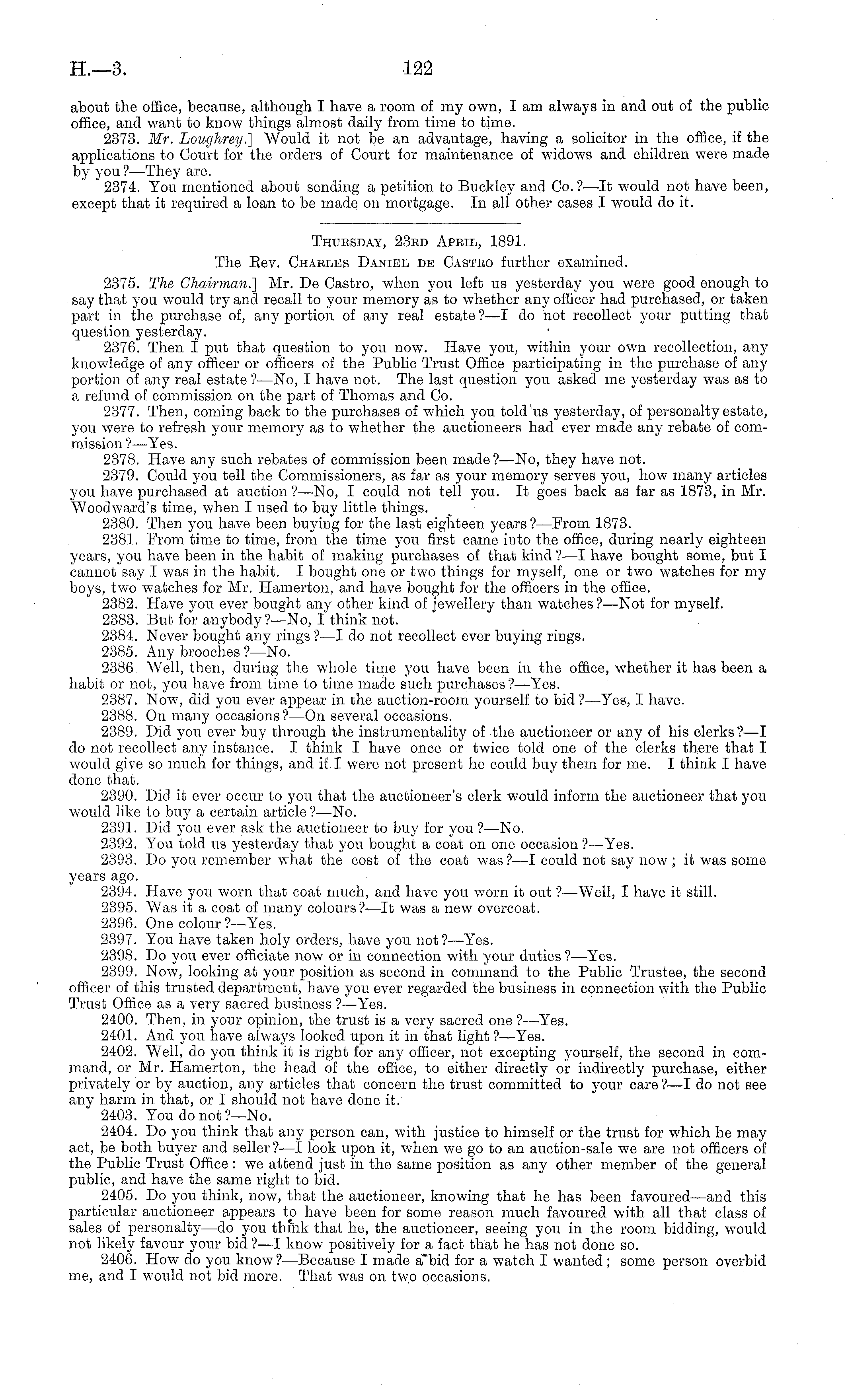 Thuesday, 23ed April, 1891. The Eev. Chaeles Daniel de Casteo further examined. 2375. The Chairman.] Mr. De Castro, when you left us yesterday you were good enough to say that you would try and recall to your memory as to whether any officer had purchased, or taken part in the purchase of, any portion of any real estate?—l do not recollect your putting that question yesterday. 2376. Then I put that question to you now. Have you, within your own recollection, any knowledge of any officer or officers of the Public Trust Office participating in the purchase of any portion of any real estate ?—No, I have not. The last question you asked me yesterday was as to a refund of commission on the part of Thomas and Co. 2377. Then, coming back to the purchases of which you told'us yesterday, of personalty estate, you were to refresh your memory as to whether the auctioneers had ever made any rebate of commission? —Yes. 2378. Have any such rebates of commission been made ?—No, they have not. 2379. Could you tell the Commissioners, as far as your memory serves you, how many articles you have purchased at auction ?—No, I could not tell you. It goes back as far as 1873, in Mr. Woodward's time, when I used to buy little things. 2380. Then you have been buying for the last eighteen years ? —Prom 1873. 2381. From time to time, from the time you first came into the office, during nearly eighteen years, you have been in the habit of making purchases of that kind ?—I have bought some, but I cannot say I was in the habit. I bought one or two things for myself, one or two watches for my boys, two watches for Mr. Hamerton, and have bought for the officers in the office. 2382. Have you ever bought any other kind of jewellery than watches?— Not for myself. 2383. But for anybody?—No, I think not. 2384. Never bought any rings ? —I do not recollect ever buying rings. 2385. Any brooches ?—No. 2386. Well, then, during the whole time you have been in the office, whether it has been a habit or not, you have from time to time made such purchases?— Yes. 2387. Now, did you ever appear in the auction-room yourself to bid ?—Yes, I have. 2388. On many occasions?—On several occasions. 2389. Did you ever buy through the instrumentality of the auctioneer or any of his clerks ?—I do not recollect any instance. I think I have once or twice told one of the clerks there that I would give so much for things, and if I were not present he could buy them for me. I think I have done that. 2390. Did it ever occur to you that the auctioneer's clerk would inform the auctioneer that you would like to buy a certain article ?—No. 2391. Did you ever ask the auctioneer to buy for you ?—No. 2392. You told us yesterday that you bought a coat on one occasion ? —Yes. 2393. Do you remember what the cost of the coat was?—l could not say now ;it was some years ago. 2394. Have you worn that coat much, and have you worn it out ? —Well, I have it still. 2395. Was it a coat of many colours? —It was a new overcoat. 2396. One colour ?—Yes. 2397. You have taken holy orders, have you not? —Yes. 2398. Do you ever officiate now or in connection with your duties ?—Yes. 2399. Now, looking at your position as second in command to the Public Trustee, the second officer of this trusted department, have you ever regarded the business in connection with the Public Trust Office as a very sacred business ? —Yes. 2400. Then, in your opinion, the trust is a very sacred one ? —Yes. 2401. And you have always looked upon it in that light ?—Yes. 2402. Well, do you think it is right for any officer, not excepting yourself, the second in command, or Mr. Hamerton, the head of the office, to either directly or indirectly purchase, either privately or by auction, any articles that concern the trust committed to your care ?—I do not see any harm in that, or I should not have done it. 2403. You do not?— No. 2404. Do you think that any person can, with justice to himself or the trust for which he may act, be both buyer and seller?—l look upon it, when we go to an auction-sale we are not officers of the Public Trust Office : we attend just in the same position as any other member of the general public, and have the same right to bid. 2405. Do you think, now, that the auctioneer, knowing that he has been favoured —and this particular auctioneer appears to have been for some reason much favoured with all that class of sales of personalty—do you think that he, the auctioneer, seeing you in the room bidding, would not likely favour your bid ?—I know positively for a fact that he has not done so. 2406. How do you know?— Because I made a"bid for a watch I wanted; some person overbid me, and I would not bid more. That was on two occasions.