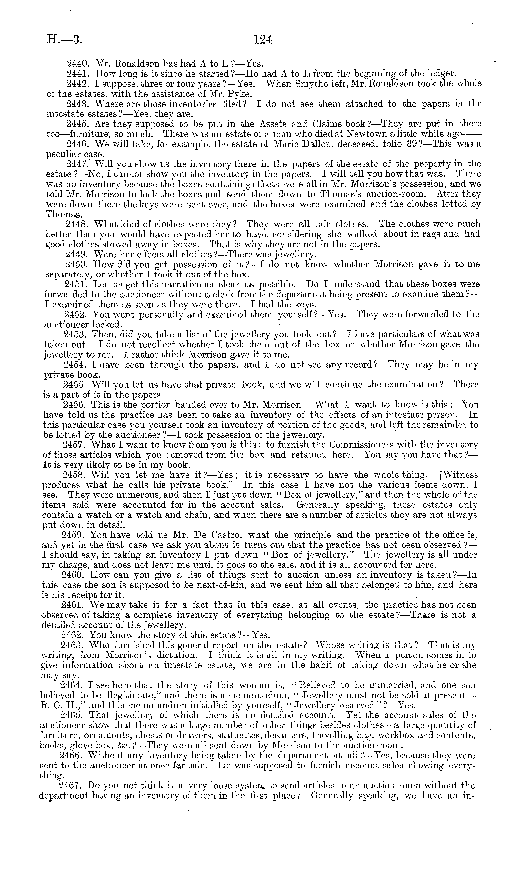 2440. Mr. Eonaldson has had A to L ?—Yes. 2441. How long is it since he started? —He had A to L from the beginning of the ledger. 2442. I suppose, three or four years? —Yes. When Smythe left, Mr. Eonaldson took the whole of the estates, with the assistance of Mr. Pyke. 2443. Where are those inventories filed? I do not see them attached to the papers in the intestate estates?— Yes, they are. 2445. Are they supposed to be put in the Assets and Claims book ?—They are put in there too —furniture, so much. There was an estate of a man who died at Newtown a little while ago 2446. We will take, for example, the estate of Marie Dallon, deceased, folio 39 ? —This was a peculiar case. 2447. Will you show us the inventory there in the papers of the estate of the property in the estate ? —No, I cannot show you the inventory in the papers. I will tell you how that was. There was no inventory because the boxes containing effects w 7ere all in Mr. Morrison's possession, and we told Mr. Morrison to lock the boxes and send them down to Thomas's auction-room. After they were down there the keys were sent over, and the boxes were examined and the clothes lotted by Thomas. 2448. What kind of clothes were they?— They were all fair clothes. The clothes were much better than you would have expected her to have, considering she walked about in rags and had good clothes stowed away in boxes. That is why they are not in the papers. 2449. Were her effects all clothes?— There was jewellery. 2450. How did you get possession of it ? —I do not know whether Morrison gave it to me separately, or whether I took it out of the box. 2451. Let us get this narrative as clear as possible. Do I understand that these boxes were forwarded to the auctioneer without a clerk from the department being present to examine them ?— I examined them as soon as they were there. I had the keys. 2452. You went personally and examined them yourself?— Yes. They were forwarded to the auctioneer locked. 2453. Then, did you take a list of the jewellery you took out ?—I have particulars of what was taken out. Ido not recollect whether I took them out of the box or whether Morrison gave the jewellery to me. I rather think Morrison gave it to me. 2454. I have been through the papers, and I do not see any record ? —They may be in my private book. 2455. Will you let us have that private book, and we will continue the examination ?—There is a part of it in the papers. 2456. This is the portion handed over to Mr. Morrison. What I want to know is this : You have told us the practice has been to take an inventory of the effects of an intestate person. In this particular case you yourself took an inventory of portion of the goods, and left the remainder to be lotted by the auctioneer? —I took possession of the jewellery. 2457. What I want to know from you is this : to furnish the Commissioners with the inventory of those articles which you removed from the box and retained here. You say you have that?— It is very likely to be in my book. 2458. Will you let me have it ? —Yes; it is necessary to have the whole thing. [Witness produces what he calls his private book.] In this case I have not the various items down, I see. They were numerous, and then I just put down " Box of jewellery," and then the whole of the items sold were accounted for in the account sales. Generally speaking, these estates only contain a watch or a watch and chain, and when there are a number of articles they are not always put down in detail. 2459. You have told us Mr. De Castro, what the principle and the practice of the office is, and yet in the first case we ask you about it turns out that the practice has not been observed ?— I shoidd say, in taking an inventory I put down " Box of jewellery." The jewellery is all under my charge, and does not leave me until it goes to the sale, and it is all accounted for here. 2460. How can you give a list of things sent to auction unless an inventory is taken ? —ln this case the son is supposed to be next-of-kin, and we sent him all that belonged to him, and here is his receipt for it. 2461. We may take it for a fact that in this case, at all events, the practice has not been observed of taking a complete inventory of everything belonging to the estate ? —There is not a detailed account of the jewellery. 2462. You know the story of this estate?— Yes. 2463. Who furnished this general report on the estate? Whose writing is that?— That is my writing, from Morrison's dictation. I think it is all in my writing. When a person comes in to give information about an intestate estate, we are in the habit of taking down what he or she may say. 2464. I see here that the story of this woman is, "Believed to be unmarried, and one son believed to be illegitimate," and there is a memorandum, " Jewellery must not be sold at present— E. C. H.," and this memorandum initialled by yourself, "Jewellery reserved"? —Yes. 2465. That jewellery of which there is no detailed account. Yet the account sales of the auctioneer show that there was a large number of other things besides clothes —a large quantity of furniture, ornaments, chests of drawers, statuettes, decanters, travelling-bag, workbox and contents, books, glove-box, &c. ?—They were all sent down by Morrison to the auction-room. 2466. Without any inventory being taken by the department at all?— Yes, because they were sent to the auctioneer at once far sale. He was supposed to furnish account sales showing everything. 2467. Do you not think it a very loose system to send articles to an auction-room without the department having an inventory of them in the first place ?—Generally speaking, we have an in-