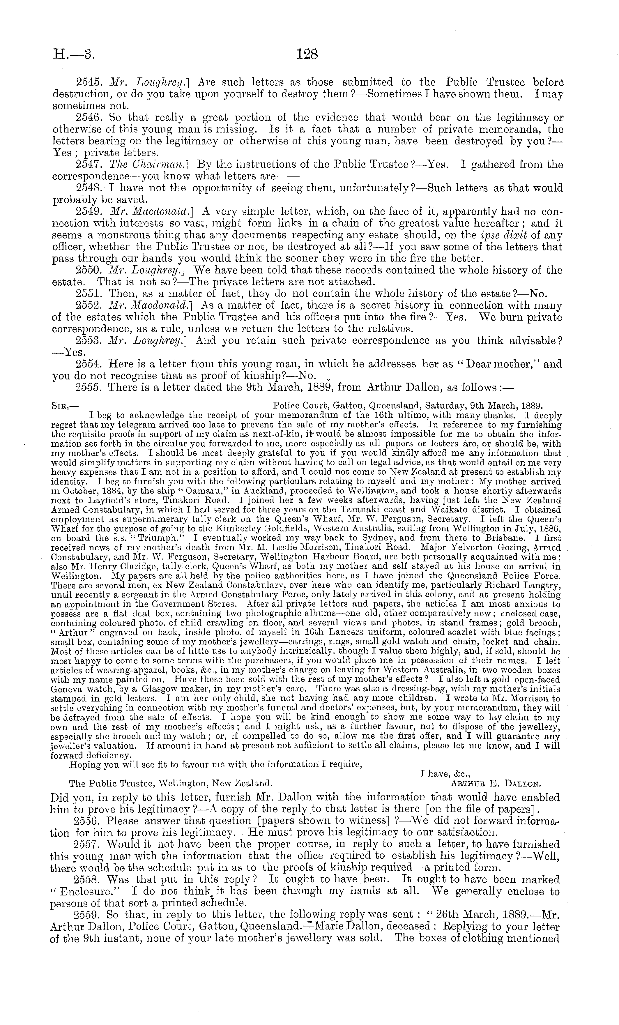2545. Mr. Loughrey.] Are such letters as those submitted to the Public Trustee before destruction, or do you take upon yourself to destroy them ?—Sometimes I have shown them. I may sometimes not. 2546. So that really a great portion of the evidence that would bear on the legitimacy or otherwise of this young man is missing. Is it a fact that a number of private memoranda, the letters bearing on the legitimacy or otherwise of this young man, have been destroyed by you? — Yes ; private letters. 2547. The Chairman.] By the instructions of the Public Trustee?— Yes. I gathered from the correspondence—you know what letters are 2548. I have not the opportunity of seeing them, unfortunately ?—Such letters as that would probably be saved. 2549. Mr. Macdonald.} A very simple letter, which, on the face of it, apparently had no connection with interests so vast, might form links in a chain of the greatest value hereafter ; and it seems a monstrous thing that any documents respecting any estate should, on the ipse dixit of any officer, whether the Public Trustee or not, be destroyed at all ?—lf you saw some of the letters that pass through our hands you would think the sooner they were in the fire the better. 2550. Mr. Loughrey.] We have been told that these records contained the whole history of the estate. That is not so ? —The private letters are not attached. 2551. Then, as a matter of fact, they do not contain the whole history of the estate? —No. 2552. Mr. Macdonald.] As a matter of fact, there is a secret history in connection with many of the estates which the Public Trustee and his officers put into the fire ?—Yes. We burn private correspondence, as a rule, unless we return the letters to the relatives. 2553. Mr. Loughrey.] And you retain such private correspondence as you think advisable? —Yes. 2554. Here is a letter from this young man, in which he addresses her as " Dear mother," and you do not recognise that as proof of kinship?— No. _ 2555. There is a letter dated the 9th March, 1889, from Arthur Dallon, as follows :— Sib, — Police Court, Gatton, Queensland, Saturday, 9th March, 1889. I beg to acknowledge the receipt of your memorandum of the 16th ultimo, with many thanks. 1 deeply regret that my telegram arrived too late to prevent the sale of my mother's effects. In reference to my furnishing the requisite proofs in support of my claim as next-of-kin, it would be almost impossible for me to obtain the information set forth in the circular you forwarded to me, more especially as all papers or letters are, or should be, with my mother's effects. I should be most deeply grateful to you if you would kindly afford me any information that would simplify matters in supporting my claim without having to call on legal advice, as that would entail on me very heavy expenses that I am not in a position to afford, and I could not come to New Zealand at present to establish my identity. I beg to furnish you with the following particulars relating to myself and my mother :My mother arrived in October, 1884, by the ship " Oamaru," in Auckland, proceeded to Wellington, and took a house shortly afterwards next to Layfield's store, Tinakori Boad. I joined her a few weeks afterwards, having just left the New Zealand Armed Constabulary, in which I had served for three years on the Taranaki coast and Waikato district. I obtained employment as supernumerary tally-clerk on the Queen's Wharf, Mr. W. Ferguson, Secretary. I left the Queen's Wharf for the purpose of going to the Kimbcrley Goldflelds, Western Australia, sailing from Wellington in July, 1886, on board the s.s. " Triumph." I eventually worked my way back to Sydney, and from there to Brisbane. I first received news of my mother's death from Mr. M. Leslie Morrison, Tinakori Boad. Major Yelverton Goring, Armed Constabulary, and Mr. W. Ferguson, Secretary, Wellington Harbour Board, are both personally acquainted with me ; also Mr. Henry Claridge, tally-clerk, Queen's Wharf, as both my mother and self stayed at his house on arrival in Wellington. My papers are all held by the police authorities here, as I have joined the Queensland Police Force. There are several men, ex New Zealand Constabulary, over here who can identify me, particularly Biehard Langtry, until recently a sergeant in the Armed Constabulary Force, only lately arrived in this colony, and at present holding an appointment in the Government Stores. After all private letters and papers, the articles I am most anxious to possess are a flat deal box, containing two photographic albums —one old, other comparatively new; enclosed case, containing coloured photo, of child crawling on floor, and several views and photos, in stand frames ; gold brooch, " Arthur " engraved on back, inside photo, of myself in 16th Lancers uniform, coloured scarlet with blue facings; small box, containing some of my mother's jewellery—earrings, rings, small gold watch and chain, locket and chain. Most of these articles can be of little use to anybody intrinsically, though I value them highly, and, if sold, should be most happy to come to some terms with the purchasers, if you would place me in possession of their names. I left articles of wearing-apparel, books, &c, in my mother's charge on leaving for Western Australia, in two wooden boxes with my name painted on. Have these been sold with the rest of my mother's effects ? I also left a gold open-faced Geneva watch, by a Glasgow maker, in my mother's care. There was also a dressing-bag, with my mother's initials stamped in gold letters. I am her only child, she not having had any more children. I wrote to Mr. Morrison to settle everything in connection with my mother's funeral and doctors' expenses, but, by your memorandum, they will be defrayed from the sale of effects. I hope you will be kind enough to show me some way to lay claim to my own and the rest of my mother's effects ; and I might ask, as a further favour, not to dispose of 