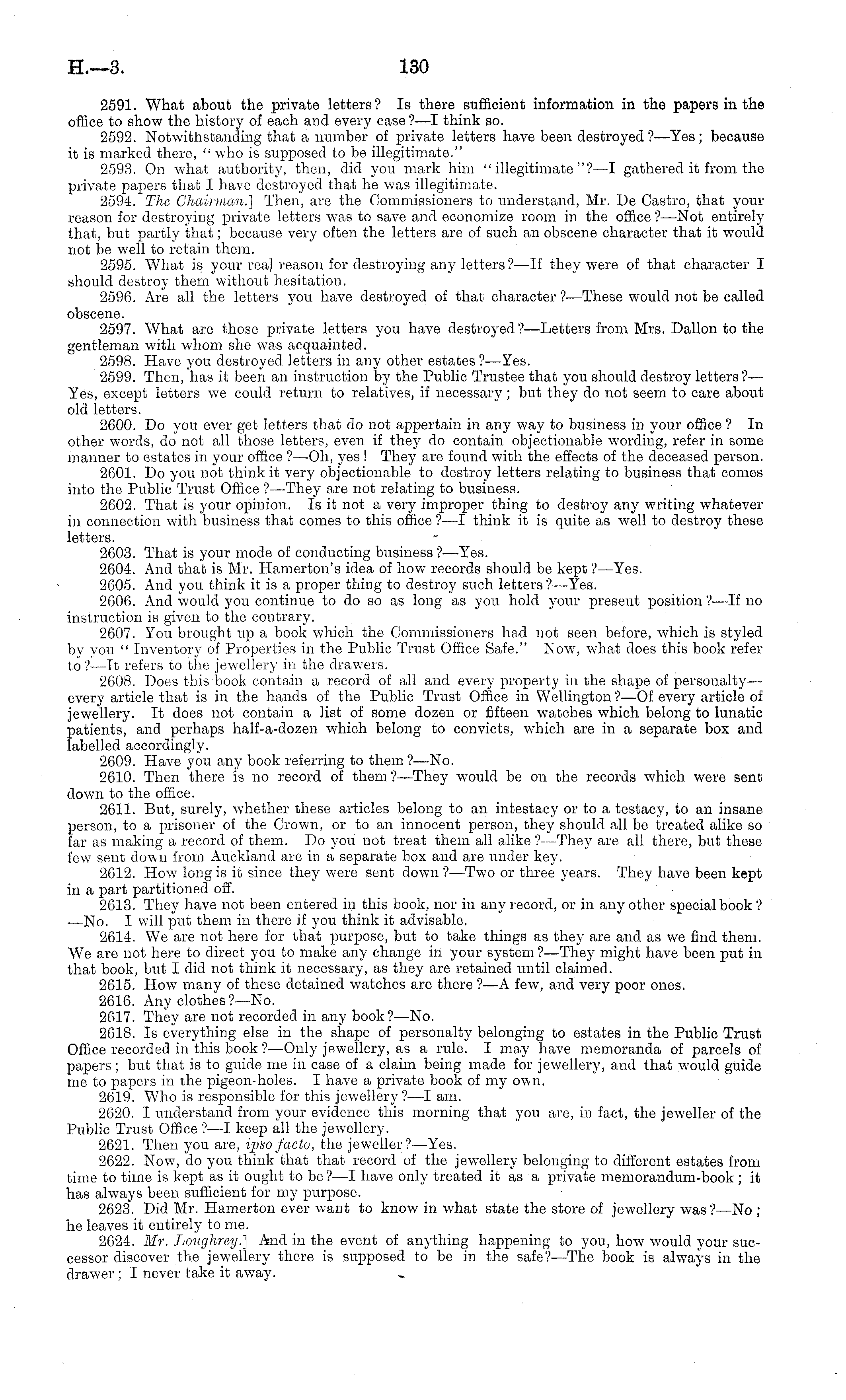 2591. What about the private letters? Is there sufficient information in the papers in the office to show the history of each and every case ? —I think so. 2592. Notwithstanding that a number of private letters have been destroyed?— Yes; because it is marked there, " who is supposed to be illegitimate." 2593. On what authority, then, did you mark him "illegitimate"?—l gathered it from the private papers that I have destroyed that he was illegitimate. 2594. The Chairman.} Then, are the Commissioners to understand, Mr. De Castro, that your reason for destroying private letters was to save and economize room in the office ? —Not entirely that, but partly that; because very often the letters are of such an obscene character that it would not be well to retain them. 2595. What is your real reason for destroying any letters ? —lf they were of that character I should destroy them without hesitation. 2596. Are all the letters you have destroyed of that character ?—These would not be called obscene. 2597. What are those private letters you have destroyed?— Letters from Mrs. Dallon to the gentleman with whom she was acquainted. 2598. Have you destroyed letters in any other estates ? —Yes. 2599. Then, has it been an instruction by the Public Trustee that you should destroy letters ?— Yes, except letters we could return to relatives, if necessary; but they do not seem to care about old letters. 2600. Do you ever get letters that do not appertain in any way to business in your office ? In other words, do not all those letters, even if they do contain objectionable wording, refer in some manner to estates in your office ?—Oh, yes ! They are found with the effects of the deceased person. 2601. Do you not think it very objectionable to destroy letters relating to business that comes into the Public Trust Office ?—They are not relating to business. 2602. That is your opinion. Is it not a very improper thing to destroy any writing whatever in connection with business that comes to this office ?—I think it is quite as well to destroy these letters. 2603. That is your mode of conducting business ?—Yes. 2604. And that is Mr. Hamerton's idea of how records should be kept ?—Yes. 2605. And you think it is a proper thing to destroy such letters?— Yes. 2606. And would you continue to do so as long as you hold your present position ?—lf no instruction is given to the contrary. 2607. You brought up a book which the Commissioners had not seen before, which is styled by you " Inventory of Properties in the Public Trust Office Safe." Now, what does this book refer to ?—lt refers to the jewellery in the drawers. 2608. Does this book contain a record of all and every property in the shape of personalty — every article that is in the hands of the Public Trust Office in Wellington?—Of every article of jewellery. It does not contain a list of some dozen or fifteen watches which belong to lunatic patients, and perhaps half-a-dozen which belong to convicts, which are in a separate box and labelled accordingly. 2609. Have you any book referring to them ?—No. 2610. Then there is no record of them ? —They would be on the records which were sent down to the office. 2611. But, surely, whether these articles belong to an intestacy or to a testacy, to an insane person, to a prisoner of the Crown, or to an innocent person, they should all be treated alike so far as making a record of them. Do you not treat them all alike ? —They are all there, but these few sent down from Auckland are in a separate box and are under key. 2612. How long is it since they were sent down ?—Two or three years. They have been kept in a part partitioned off. 2613. They have not been entered in this book, nor in any record, or in any other special book? —No. I will put them in there if you think it advisable. 2614. We are not here for that purpose, but to take things as they are and as we find them. We are not here to direct you to make any change in your system ?—They might have been put in that book, but I did not think it necessary, as they are retained until claimed. 2615. How many of these detained watches are there ?—A few, and very poor ones. 2616. Any clothes?— No. 2617. They are not recorded in any book?— No. 2618. Is everything else in the shape of personalty belonging to estates in the Public Trust Office recorded in this book ?—Only jewellery, as a rule. I may have memoranda of parcels of papers; but that is to guide me in case of a claim being made for jewellery, and that would guide me to papers in the pigeon-holes. I have a private book of my own. 2619. Who is responsible for this jewellery ? —I am. 2620. I understand from your evidence this morning that you are, in fact, the jeweller of the Public Trust Office ?—I. keep all the jewellery. 2621. Then you are, ipso facto, the jeweller?— Yes. 2622. Now, do you think that that record of the jewellery belonging to different estates from time to time is kept as it ought to be?—l have only treated it as a private memorandum-book ;it has always been sufficient for my purpose. 2623. Did Mr. Hamerton ever want to know in what state the store of jewellery was?—No ; he leaves it entirely to me. 2624. Mr. Loughrey.] And in the event of anything happening to you, how would your successor discover the jewellery there is supposed to be in the safe?— The book is always in the drawer; I never take it away.