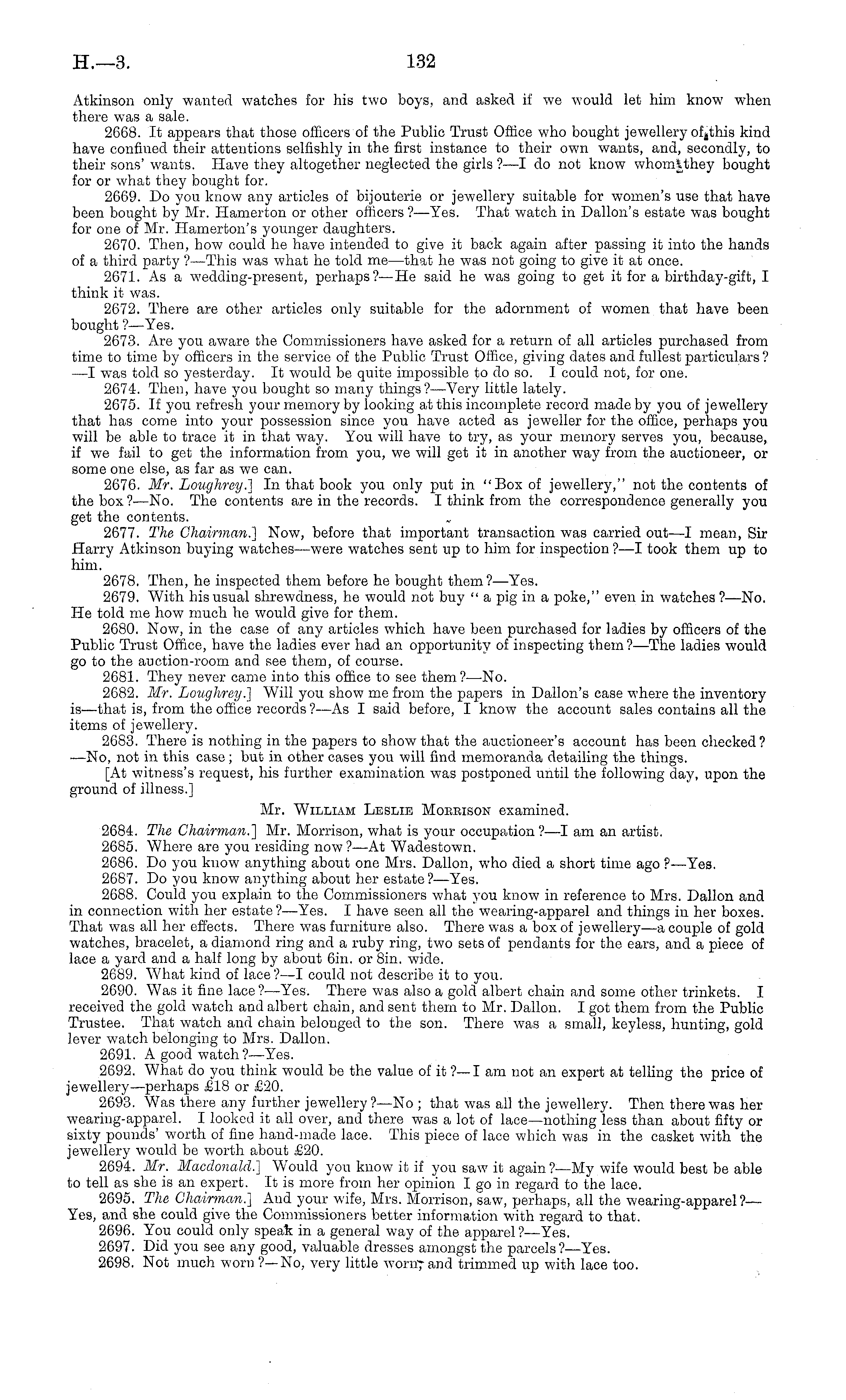Atkinson only wanted watches for his two boys, and asked if we would let him know when there was a sale. 2668. It appears that those officers of the Public Trust Office who bought jewellery of^this kind have confined their attentions selfishly in the first instance to their own wants, and, secondly, to their sons' wants. Have they altogether neglected the girls ? —I do not know whomlthey bought for or what they bought for. 2669. Do you know any articles of bijouterie or jewellery suitable for women's use that have been bought by Mr. Hamerton or other officers? —Yes. That watch in Dallon's estate was bought for one of Mr. Hamerton's younger daughters. 2670. Then, how could he have intended to give it back again after passing it into the hands of a third party ?—This was what he told me—that he was not going to give it at once. 2671. As a wedding-present, perhaps? —He said he was going to get it for a birthday-gift, I think it was. 2672. There are other articles only suitable for the adornment of women that have been bought ?—Yes. 2673. Are you aware the Commissioners have asked for a return of all articles purchased from time to time by officers in the service of the Public Trust Office, giving dates and fullest particulars ? —I was told so yesterday. It would be quite impossible to do so. I could not, for one. 2674. Then, have you bought so many things? —Very little lately. 2675. If you refresh your memory by looking at this incomplete record made by you of jewellery that has come into your possession since you have acted as jeweller for the office, perhaps you will be able to trace it in that way. You will have to try, as your memory serves you, because, if we fail to get the information from you, we will get it in another way from the auctioneer, or some one else, as far as we can. 2676. Mr. Loughrey.] In that book you only put in "Box of jewellery," not the contents of the box ? —No. The contents are in the records. I think from the correspondence generally you get the contents. 2677. The Chairman.] Now, before that important transaction was carried out—l mean, Sir Harry Atkinson buying watches—were watches sent up to him for inspection ? —I took them up to him. 2678. Then, he inspected them before he bought them?— Yes. 2679. With his usual shrewdness, he would not buy " a pig in a poke," even in watches ? —No. He told me how much he would give for them. 2680. Now, in the case of any articles which have been purchased for ladies by officers of the Public Trust Office, have the ladies ever had an opportunity of inspecting them?— The ladies would go to the anction-room and see them, of course. 2681. They never came into this office to see them?— No. 2682. Mr. Loughrey.] Will you show me from the papers in Dallon's ease where the inventory is—that is, from the office records ? —As I said before, I know the account sales contains all the items of jewellery. 2683. There is nothing in the papers to show that the auctioneer's account has been checked? —No, not in this case ; but in other cases you will find memoranda detailing the things. [At witness's request, his further examination was postponed until the following day, upon the ground of illness.] Mr. William Leslie Moeeison examined. 2684. The Chairman.] Mr. Morrison, what is your occupation?—l am an artist. 2685. Where are you residing now?—At Wadestown. 2686. Do you know anything about one Mrs. Dallon, who died a short time ago ?—Yes. 2687. Do you know anything about her estate?— Yes. 2688. Could you explain to the Commissioners what you know in reference to Mrs. Dallon and in connection with her estate ? —Yes. I have seen all the wearing-apparel and things in her boxes. That was all her effects. There was furniture also. There was a box of jewellery—a couple of gold watches, bracelet, a diamond ring and a ruby ring, two sets of pendants for the ears, and a piece of lace a yard and a half long by about 6in. or Sin. wide. 2689. What kind of lace ?—I could not describe it to you. 2690. Was it fine lace ?—Yes. There was also a gold albert chain and some other trinkets. I received the gold watch and albert chain, and sent them to Mr. Dallon. I got them from the Public Trustee. That watch and chain belonged to the son. There was a small, keyless, hunting, gold lever w Tatch belonging to Mrs. Dallon. 2691. A good watch?— Yes. 2692. What do you think would be the value of it ?—I am not an expert at telling the price of jewellery —perhaps £18 or £20. 2693. Was there any further jewellery?—No ; that was all the jewellery. Then there was her wearing-apparel. I looked it all over, and there was a lot of lace —nothing less than about fifty or sixty pounds' worth of fine hand-made lace. This piece of lace which was in the casket with the jewellery would be worth about £20. 2694. Mr. Macdonald.} Would you know it if you saw it again ?—My wife would best be able to tell as she is an expert. It is more from her opinion Igo in regard to the lace. 2695. The Chairman.] And your wife, Mrs. Morrison, saw, perhaps, all the wearing-apparel?— Yes, and she could give the Commissioners better information with regard to that. 2696. You could only spea.__ in a general way of the apparel ? —Yes. 2697. Did you see any good, valuable dresses amongst the parcels?— Yes. 2698. Not much worn ?—No, very little worurand trimmed up with lace too.