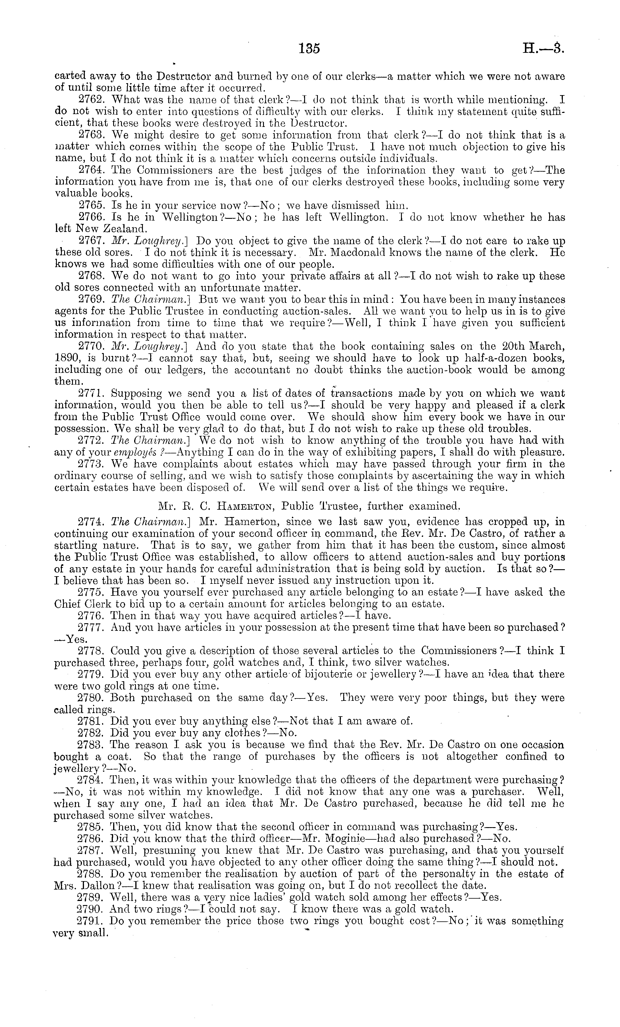 carted away to the Destructor and burned by one of our clerks—a matter which we were not aware of until some little time after it occurred. 2762. What was the name of that clerk?—l do not think that is worth while mentioning. I do not wish to enter into questions of difficulty with our clerks. I think my statement quite sufficient, that these books were destroyed in the Destructor. 2763. We might desire to get some information from that clerk?—l do not think that is a matter which comes within the scope of the Public Trust. 1 have not much objection to give his name, but I do not think it is a matter which concerns outside individuals. 2764. The Commissioners are the best judges of the information they want to get?— The information you have from me is, that one of our clerks destroyed these books, including some very valuable books. 2765. Is he in your service now? —No; we have dismissed him. 2766. Is he in Wellington ?—No; he has left Wellington. I do not know whether he has left New Zealand. 2767. Mr. Loughrey.] Do you object to give the name of the clerk?—l do not care to rake up these old sores. Ido not think it is necessary. Mr. Macdonald knows the name of the clerk. He knows we had some difficulties with one of our people. 2768. We do not want to go into your private affairs at all ?—I do not wish to rake up these old sores connected with an unfortunate matter. 2769. The Chairman.] But we want you to bear this in mind : You have been in mauy instances agents for the Public Trustee in conducting auction-sales. All we want you to help us in is to give us information from time to time that we require ?—Well, I think I have given you sufficient information in respect to that matter. 2770. Mr. Loughrey.} And do you state that the book containing sales on the 20th March, 1890, is burnt ?—I cannot say that, but, seeing we should have to look up half-a-dozen books, including one of our ledgers, the accountant no doubt thinks the auction-book would be among them. 2771. Supposing we send you a list of dates of transactions made by you on which we want information, would you then be able to tell us?—l should be very happy and pleased if a clerk from the Public Trust Office would come over. We should show him every book we have in our possession. We shall be very glad to do that, but I do not wish to rake up these old troubles. 2772. The Chairman.] We do not wish to know anything of the trouble you have had with any of your employes ? —Anything I can do in the way of exhibiting papers, I shall do with pleasure. 2773. We have complaints about estates which may have passed through your firm in the ordinary course of selling, and we wish to satisfy those complaints by ascertaining the way in which certain estates have been disposed of. We will send over a list of the things we require. Mr. E. C. Hamerton, Public Trustee, further examined. 2774. The Chairman.] Mr. Hamerton, since w re last saw you, evidence has cropped up, in continuing our examination of your second officer in command, the Eev. Mr. De Castro, of rather a startling nature. That is to say, we gather from him that it has been the custom, since almost the Public Trust Office was established, to allow officers to attend auction-sales and buy portions of any estate in your hands for careful administration that is being sold by auction. Is that so? — I believe that has been so. I myself never issued any instruction upon it. 2775. Have you yourself ever purchased any article belonging to an estate ? —I have asked the Chief Clerk to bid up to a certain amount for articles belonging to an estate. 2776. Then in that way you have acquired articles?—l have. 2777. And you have articles in your possession at the present time that have been so purchased ? —Yes. 2778. Could you give a description of those several articles to the Commissioners ?—I think I purchased three, perhaps four, gold watches and, I think, two silver watches. 2779. Did you ever buy any other article of bijouterie or jewellery? —I have an idea that there were two gold rings at one time. 2780. Both purchased on the same day?— Yes. They were very poor things, but they were called rings. 2781. Did you ever buy anything else? —Not that I am aware of. 2782. Did you ever buy any clothes ?—No. 2783. The reason I ask you is because we find that the Eev. Mr. De Castro on one occasion bought a coat. So that the range of purchases by the officers is not altogether confined to jewellery ?—No. 2784. Then, it was within your knowledge that the officers of the department were purchasing? —No, it was not within my knowledge. I did not know that any one was a purchaser. Well, when I say any one, I had an idea that Mr. De Castro purchased, because he did tell me he purchased some silver watches. 2785. Then, you did know that the second officer in command was purchasing?— Yes. 2786. Did you know that the third officer —Mr. Moginie—had also purchased?— No. 2787. Well, presuming you knew that Mr. De Castro w Tas purchasing, and that you yourself had purchased, would you have objected to any other officer doing the same thing?—l should not. 2788. Do you remember the realisation by auction of part of the personalty in the estate of Mrs. Dallon ? —I knew that realisation was going on, but Ido not recollect the date. 2789. Well, there was a very nice ladies' gold watch sold among her effects?— Yes. 2790. And two rings ?—I could not say. I know there was a gold watch. 2791. Do you remember the price those two rings you bought cost?—No; it was something very small.