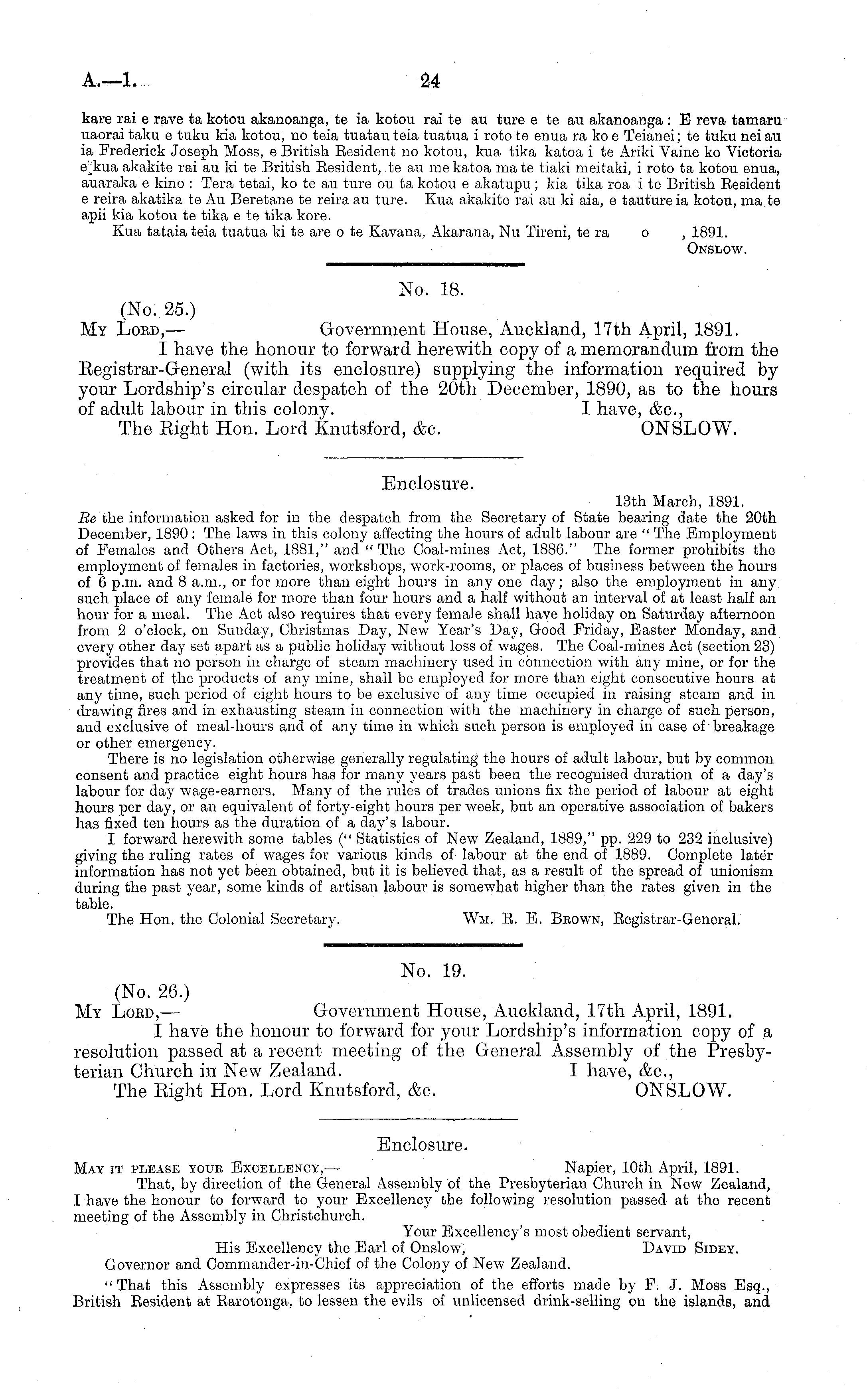 Enclosure. 13th March, 1891. Be the information asked for in the despatch from the Secretary of State bearing date the 20th December, 1890: The laws in this colony affecting the hours of adult labour are " The Employment of Females and Others Act, 1881," and " The Coal-mines Act, 1886." The former prohibits the employment of females in factories, workshops, work-rooms, or places of business between the hours of 6 p.m. and 8 a.m., or for more than eight hours in any one day; also the employment in any such place of any female for more than four hours and a half without au interval of at least half an hour for a meal. The Act also requires that every female shall have holiday on Saturday afternoon from 2 o'clock, on Sunday, Christmas Day, New Year's Day, Good Friday, Easter Monday, and every other day set apart as a public holiday without loss of wages. The Coal-mines Act (section 23) provides that no person in charge of steam machinery used in connection with any mine, or for the treatment of the products of any mine, shall be employed for more than eight consecutive hours at any time, such period of eight hours to be exclusive of any time occupied in raising steam and in drawing fires and in exhausting steam in connection with the machinery in charge of such person, and exclusive of meal-hours and of any time in which such person is employed in case of breakage or other emergency. There is no legislation otherwise generally regulating the hours of adult labour, but by common consent and practice eight hours has for many years past been the recognised duration of a day's labour for day wage-earners. Many of the rules of trades unions fix the period of labour at eight hours per day, or an equivalent of forty-eight hours per week, but an operative association of bakers has fixed ten hours as the duration of a day's labour. I forward herewith some tables (" Statistics of New Zealand, 1889," pp. 229 to 232 inclusive) giving the ruling rates of wages for various kinds of labour at the end of 1889. Complete later information has not yet been obtained, but it is believed that, as a result of the spread of unionism during the past year, some kinds of artisan labour is somewhat higher than the rates given in the table. The Hon. the Colonial Secretary. Wm. R. E. Bbown, Registrar-General.