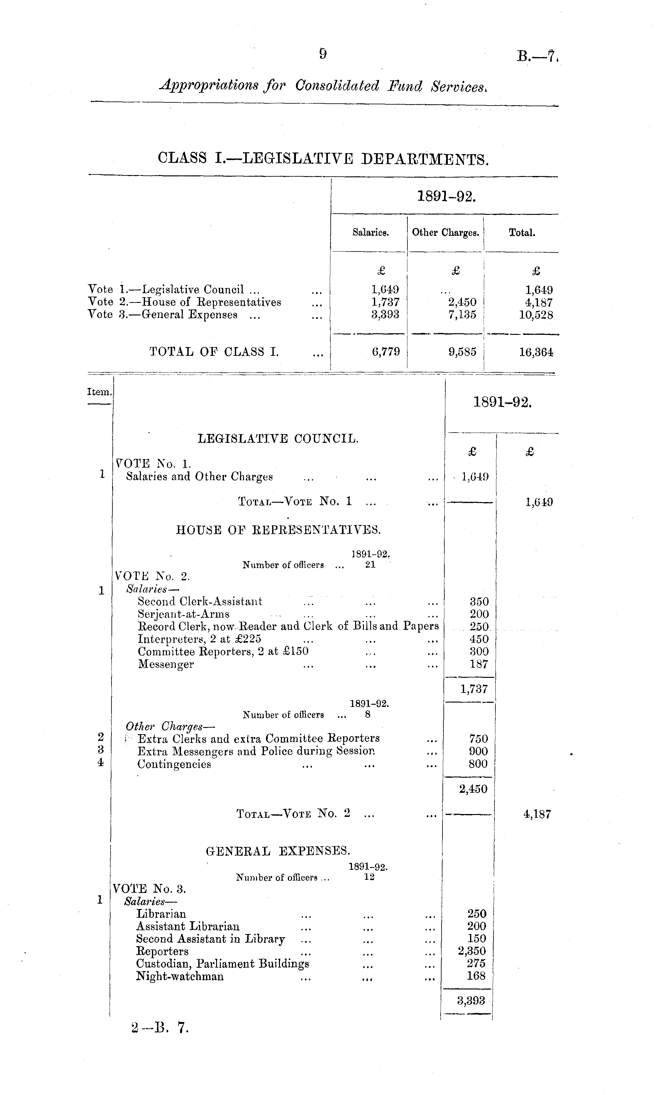 1891-92. Salaries. Other Charges. Total. Vote 1.—-Legislative Council ... Vote 2.—House of Representatives Vote 3. —General Expenses ... £ 1,649 1,737 3,393 £ 2,450 i 7,135 £ 1,649 4,187 10,528 TOTAL OP CLASS I. 6,779 9,585 16,36' Xeva. 1891-92. LEGISLATIVE COUNCIL. £ £ VOTE No. 1. Salaries and Other Charges 1,649 ToTAi,—Vote No. 1 ... 1,649 HOUSE OF REPRESENTATIVES. 1891-92. Number of officers ... 21 VOTE No. 2. Salaries— Second Clerk-Assistant Serjeaiit-at-Arms Record Clerk, now Reader and Clerk of Bills and Papers Interpreters, 2 at £225 Committee Reporters, 2 at £150 Messenger 350 200 .250. 450 300 187 1891-92. Number of officers ... 8 1,737 2 8 4 Other Charges —■ \- Extra Clerks and extra Committee Reporters Extra Messengers and Police during Session Contingencies 750 900 800 i Total—Vote No. 2 ... 2,450 4,187 GENERAL EXPENSES. 1891-92. Number of officers ... 12 VOTE No. 3. Salaries — Librarian Assistant Librarian Second Assistant in Library Reporters Custodian, Parliament Buildings Night-watchman 250 200 150 2,350 275 168 3,393