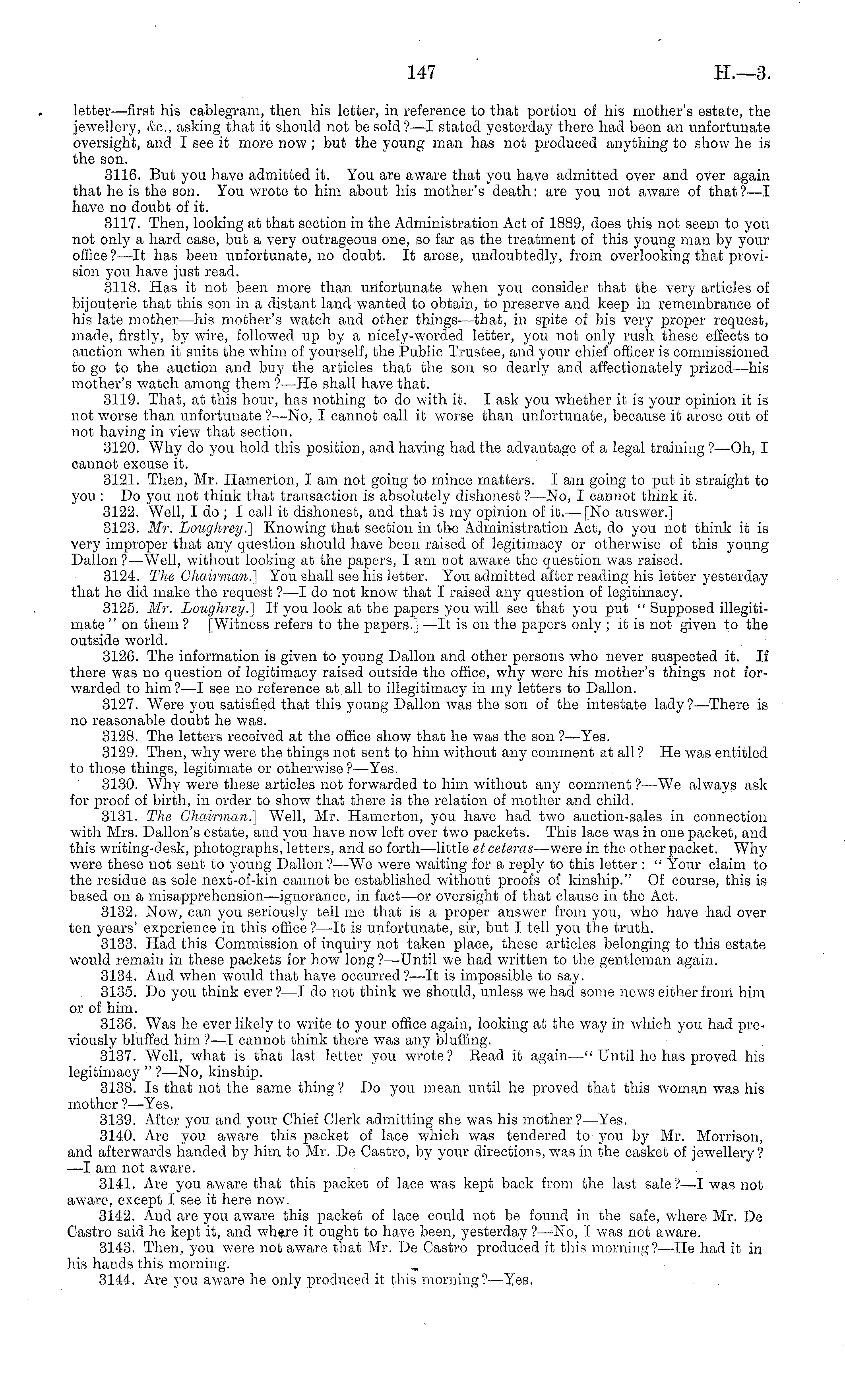 letter—first his cablegram, then his letter, in reference to that portion of his mother's estate, the jewellery, etc., asking that it should not be sold? —I stated yesterday there had been an unfortunate oversight, and I see it more now ; but the young man has not produced anything to show he is the son. 3116. But you have admitted it. You are aware that you have admitted over and over again that he is the son. You wrote to him about his mother's death: are you not aware of that?—l have no doubt of it. 3117. Then, looking at that section in the Administration Act of 1889, does this not seem to you not only a hard case, but a very outrageous one, so far as the treatment of this young man by your office?—lt has been unfortunate, no doubt. It arose, undoubtedly, from overlooking that provision you have just read. 3118. Has it not been more than unfortunate when you consider that the very articles of bijouterie that this son in a distant land wanted to obtain, to preserve and keep in remembrance of his late mother—his mother's watch and other things—that, in spite of his very proper request, made, firstly, by wire, followed up by a nicely-worded letter, you not only rush these effects to auction when it suits the whim of yourself, the Public Trustee, and your chief officer is commissioned to go to the auction and buy the articles that the son so dearly and affectionately prized—his mother's watch among them ? —He shall have that. 3119. That, at this hour, has nothing to do with it. 1 ask you whether it is your opinion it is not worse than unfortunate ? —No, I cannot call it worse than unfortunate, because it arose out of not having in viewT that section. 3120. Why do you hold this position, and having had the advantage of a legal training ?—Oh, I cannot excuse it. 3121. Then, Mr. Hamerton, lam not going to mince matters. lam going to put it straight to you : Do you not think that transaction is absolutely dishonest ?—No, I cannot think it. 3122. Well, Ido ; I call it dishonest, and that is my opinion of it.— [No answer.] 3123. Mr. Loughrey^ Knowing that section in the Administration Act, do you not think it is very improper that any question should have been raised of legitimacy or otherwise of this young Dallon ? —Well, without looking at the papers, I am not aware the question was raised. 3124. The Chairman^] You shall see his letter. You admitted after reading his letter yesterday that he did make the request ?—I do not know that I raised any question of legitimacy. 3125. Mr. Louglirey.] If you look at the papers you will see that you put " Supposed illegitimate "on them ? [Witness refers to the papers.] —It is on the papers only ;it is not given to the outside world. 3126. The information is given to young Dallon and other persons who never suspected it. If there was no question of legitimacy raised outside the office, why were his mother's things not forwarded to him?—l see no reference at all to illegitimacy in my letters to Dallon. 3127. W Tere you satisfied that this young Dallon was the son of the intestate lady?— There is no reasonable doubt he w ras. 3128. The letters received at the office show that he was the son ?—Yes. 3129. Then, why were the things not sent to him without any comment at all ? He was entitled to those things, legitimate or otherwise ? —Yes. 3130. Why were these articles not forwarded to him without any comment ? —We always ask for proof of birth, in order to show that there is the relation of mother and child. 3131. The Chairman.] Well, Mr. Hamerton, you have had two auction-sales in connection with Mrs. Dallon's estate, and you have now left over two packets. This lace was in one packet, and this writing-desk, photographs, letters, and so forth —little et ceteras —were in the other packet. Whywere these not sent to young Dallon ?—We were waiting for a reply to this letter : " Your claim to the residue as sole next-of-kin cannot be established without proofs of kinship." Of course, this is based on a misapprehension—ignorance, in fact —or oversight of that clause in the Act. 3132. Now, can you seriously tell me that is a proper answer from you, who have had over ten years' experience in this office ?—lt is unfortunate, sir, but I tell you the truth. 3133. Had this Commission of inquiry not taken place, these articles belonging to this estate would remain in these packets for how long?— Until we had written to the gentleman again. 3134. And when would that have occurred?—lt is impossible to say. 3135. Do you think ever? —I do not think we should, unless we had some news either from him or of him. 3136. Was he ever likely to write to your office again, looking at the way in which you had previously bluffed him ? —I cannot think there was any bluffing. 3137. Well, what is that last letter you wrote? Bead it again—" Until he has proved his legitimacy " ? —No, kinship. 3138. Is that not the same thing ? Do you mean until he proved that this woman was his mother ?—Yes. 3139. After you and your Chief Clerk admitting she was his mother ?—Yes. 3140. Are you aware this packet of lace which was tendered to you by Mr. Morrison, and afterwards handed by him to Mr. De Castro, by your directions, was in the casket of jewellery ? —I am not aware. 3141. Are you aware that this packet of lace was kept back from the last sale?—l was not aware, except I see it here now. 3142. And are you aware this packet of lace could not be found in the safe, where Mr. De Castro said he kept it, and where it ought to have been, yesterday ?—No, I was not aware. 3143. Then, you were not aware that Mr. De Castro produced it this morning?—He had it in his hands this morning. 3144. Are you aware he only produced it this morning?— Yes,