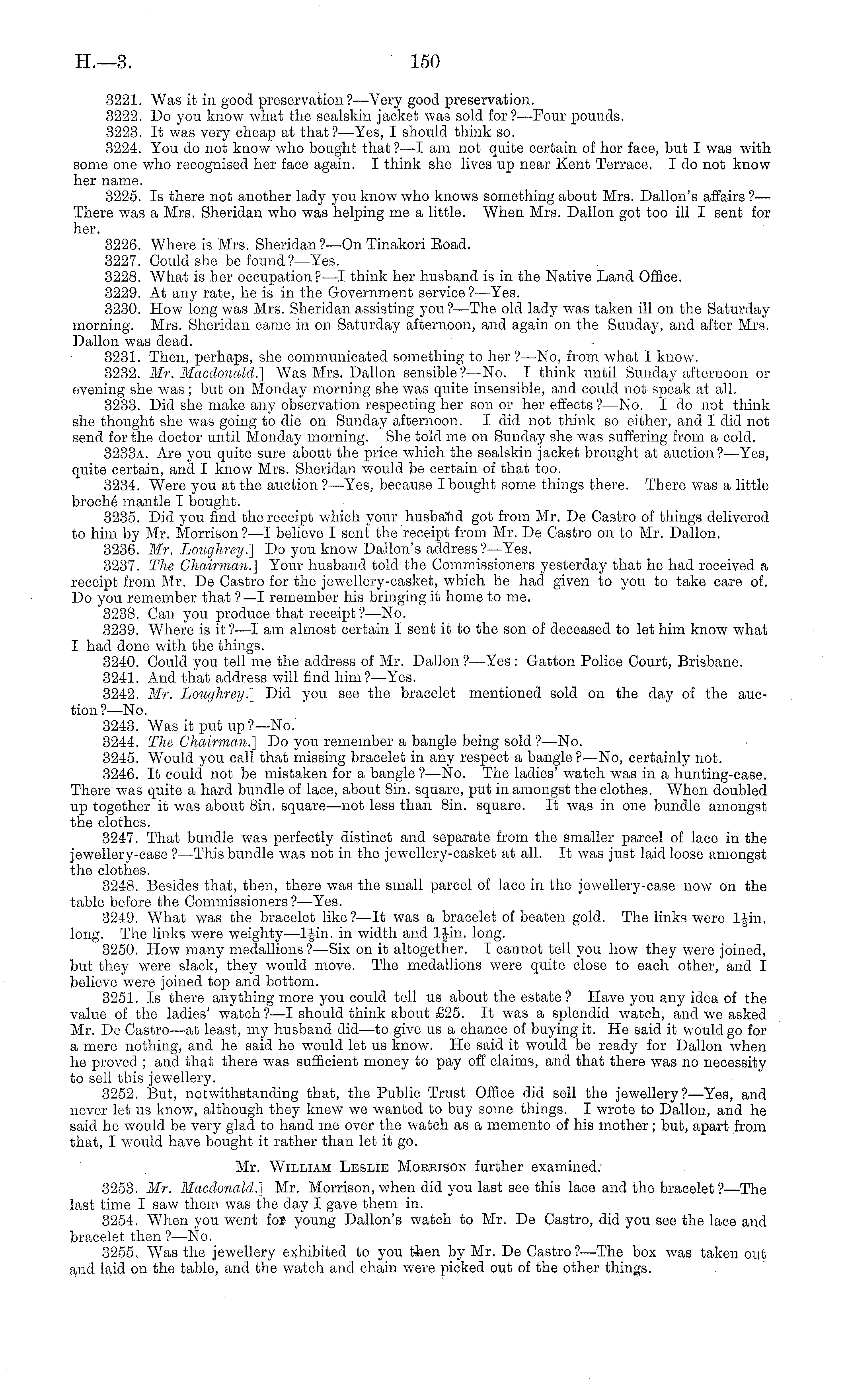 3221. Was it in good preservation?— Very good preservation. 3222. Do you know what the sealskin jacket was sold for?— Four pounds. 3223. It was very cheap at that?— Yes, I should think so. 3224. You do not know who bought that ? —I am not quite certain of her face, but I was with some one who recognised her face again. I think she lives up near Kent Terrace. Ido not know her name. 3225. Is there not another lady you know who knows something about Mrs. Dallon's affairs ?— There was a Mrs. Sheridan who was helping me a little. When Mrs. Dallon got too ill I sent for her. 3226. Where is Mrs. Sheridan ?—On Tinakori Boad. 3227. Could she be found?— Yes. 3228. What is her occupation?—l think her husband is in the Native Land Office. 3229. At any rate, he is in the Government service ?—Yes. 3230. How long was Mrs. Sheridan assisting you ? —The old lady was taken ill on the Saturday morning. Mrs. Sheridan came in on Saturday afternoon, and again on the Sunday, and after Mrs. Dallon was dead. 3231. Then, perhaps, she communicated something to her ?—No, from what I know. 3232. Mr. Macdonald.} Was Mrs. Dallon sensible?— No. I think until Sunday afternoon or evening she was; but on Monday morning she was quite insensible, and could not speak at all. 3233. Did she make any observation respecting her son or her effects ? —No. I do not think she thought she was going to die on Sunday afternoon. I did not think so either, and I did not send for the doctor until Monday morning. She told me on Sunday she was suffering from a cold. 3233 a. Are you quite sure about the price which the sealskin jacket brought at auction? —Yes, quite certain, and I know Mrs. Sheridan would be certain of that too. 3234. Were you at the auction ? —Yes, because I bought some things there. There was a little broche mantle T bought. 3235. Did you find the receipt which your husband got from Mr. De Castro of things delivered to him by Mr. Morrison? —I believe I sent the receipt from Mr. De Castro on to Mr. Dallon. 3236. Mr. Loti.ghrey.] Do you know Dallon's address?— Yes. 3237. The Chairman.] Your husband told the Commissioners yesterday that he had received a receipt from Mr. De Castro for the jewellery-casket, which he hacl given to you to take care of. Do you remember that ?—I remember his bringing it home to me. 3238. Can you produce that receipt ? —No. 3239. Where is it ?—I am almost certain I sent it to the son of deceased to let him know what I had done with the things. 3240. Could you tell me the address of Mr. Dallon? —Yes : Gatton Folice Court, Brisbane. 3241. And that address will find him? —Yes. 3242. Mr. Loughrey.] Did you see the bracelet mentioned sold on the day of the auction?— No. 3243. Was it put up ?—No. 3244. The Chairman.] Do you remember a bangle being sold ?—No. 3245. Would you call that missing bracelet in any respect a bangle?—No, certainly not. 3246. It could not be mistaken for a bangle ? —No. The ladies' watch was in a hunting-case. There was quite a hard bundle of lace, about Bin. square, put in amongst the clothes. When doubled up together it was about Bin. square—not less than Bin. square. It was in one bundle amongst the clothes. 3247. That bundle was perfectly distinct and separate from the smaller parcel of lace in the jewellery-case ? —This bundle was not in the jewellery-casket at all. It was just laid loose amongst the clothes. 3248. Besides that, then, there was the small parcel of lace in the jewellery-case now on the table before the Commissioners?— Yes. 3249. What was the bracelet like? —It was a bracelet of beaten gold. The links were l-§-ii_. long. The links were weighty —l|in, in width and ljin. long. 3250. How many medallions ?—Six on it altogether. I cannot tell you how they were joined, but they were slack, they would move. The medallions were quite close to each other, and I believe were joined top and bottom. 3251. Is there anything more you could tell us about the estate ? Have you any idea of the value of the ladies' watch? —I should think about £25. It was a splendid watch, and we asked Mr. De Castro—at least, my husband did —to give us a chance of buying it. He said it would go for a mere nothing, and he said he would let us know. He said it would be ready for Dallon when he proved ; and that there was sufficient money to pay off claims, and that there was no necessity to sell this jewellery. 3252. But, notwithstanding that, the Public Trust Office did sell the jewellery?— Yes, and never let us know, although they knew we wanted to buy some things. I wrote to Dallon, and he said he would be very glad to hand me over the watch as a memento of his mother; but, apart from that, I would have bought it rather than let it go. Mr. William Leslie Morrison further examined. 3253. Mr. Macdonald.] Mr. Morrison, when did you last see this lace and the bracelet ?—The last time I saw them was the day I gave them in. 3254. When you went fof young Dallon's watch to Mr. De Castro, did you see the lace and bracelet then ?—No. 3255. Was the jewellery exhibited to you then by Mr. De Castro?— The box was taken out and laid on the table, and the watch and chain were picked out of the other things.