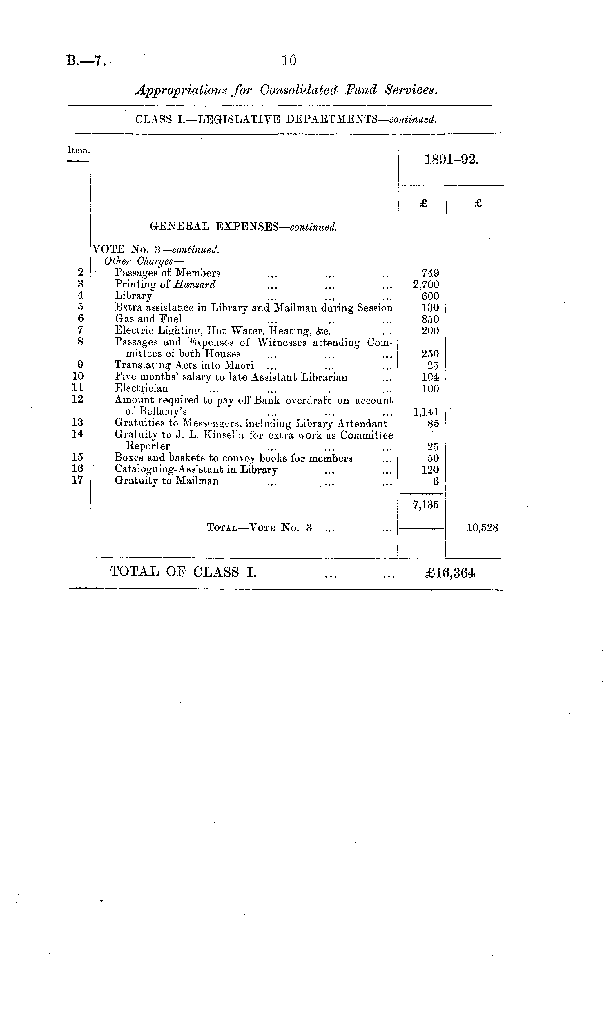 tern. 1891-92. £ GENERAL EXPENSES—continued. 2 3 4 5 G 7 8 9 10 11 12 VOTE No. 3- continued. Other Charges — Passages of Members Printing of Hansard Library Extra assistance in Library and Mailman during Session Gas and Fuel Electric Lighting, Hot Water, Heating, &c. Passages and Expenses of Witnesses attending Committees of both Houses Translating Acts into Maori Five months' salary to late Assistant Librarian Electrician Amount required to pay off Bank overdraft on account of Bellamy's Gratuities to Messengers, including Library Attendant Gratuity to J. L. Kinsella for extra work as Committee lieporter Boxes and baskets to convey books for members Cataloguing-Assistant in Library Gratuity to Mailman ... ... 749 2,700 600 130 850 200 250 25 104 100 13 14 1,141 85 15 Iβ 17 25 50 120 6 7,135 Total—Vote No. 3 ... 10,528 TOTAL OE CLASS I. £1 ,364