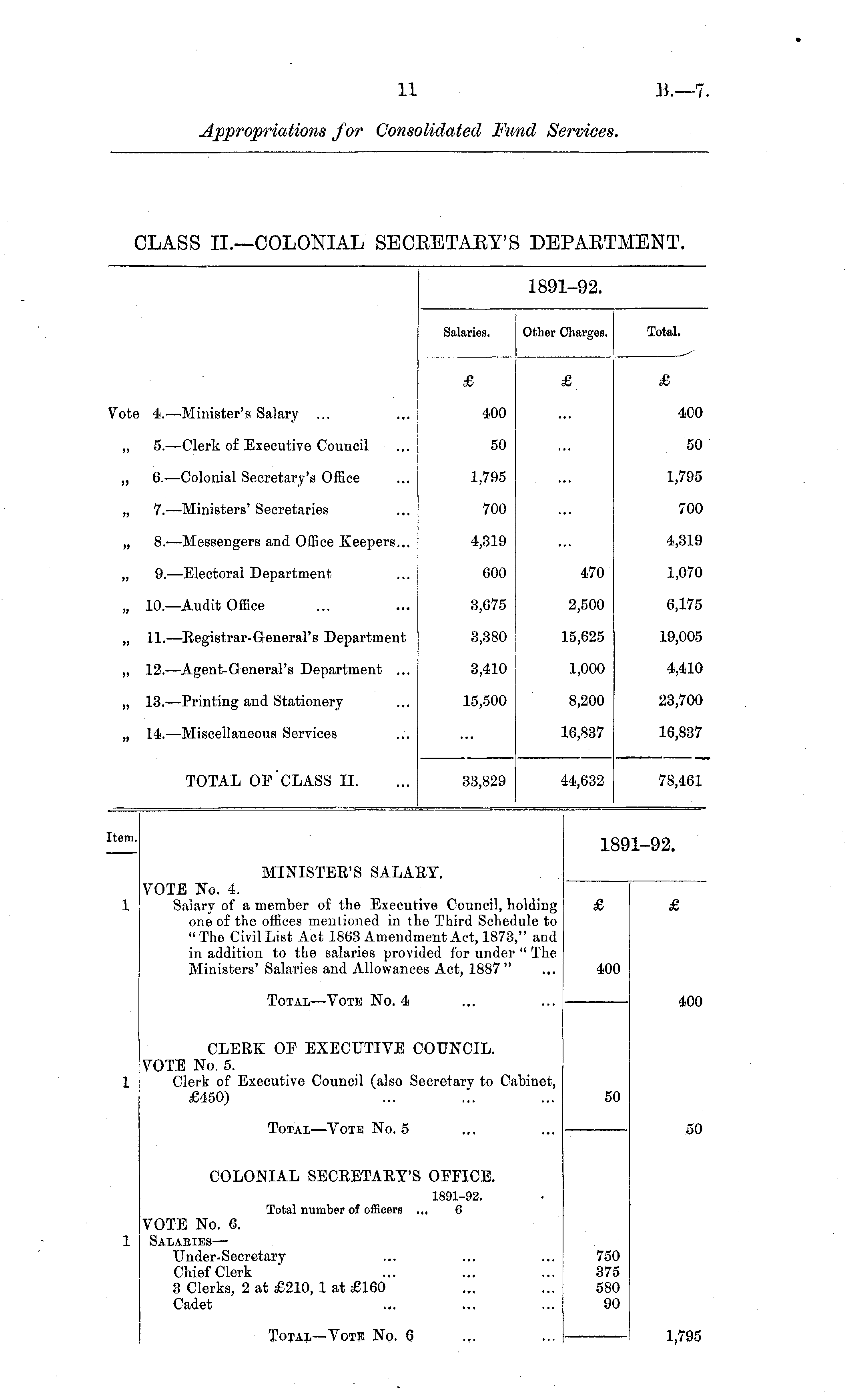 1891-92. Salaries. Other Charges. Total. £ £ £ Vote 4.—Minister's Salary ... 400 400 „ 5.—Clerk of Executive Council 50 50 „ 6.—Colonial Secretary's Office 1,795 1,795 „ 7. —Ministers' Secretaries 700 700 „ 8.—Messengers and Office Keepers... 4,319 4,319 „ 9.—Electoral Department 600 470 1,070 „ 10.—Audit Office 3,675 2,500 6,175 „ 11.—Registrar-General's Department 3,380 15,625 19,005 „ 12.—Agent-General's Department ... 3,410 1,000 4,410 „ 13.—Printing and Stationery 15,500 8,200 23,700 „ 14. —Miscellaneous Services 16,837 16,837 TOTAL OF CLASS II. 33,829 :4,632 78,461 'tern. 91-92. MINISTER'S SALARY. VOTE No. 4. Salary of a member of the Executive Council, holding one of the offices mentioned in the Third Schedule to "The Civil List Act 1863 Amendment Act, 1873," and in addition to the salaries provided for under " The Ministers' Salaries and Allowances Act, 1887 " £ 400 Total—Vote No. 4 401 CLERK OF EXECUTIVE COUNCIL. VOTE No. 5. Clerk of Executive Council (also Secretary to Cabinet, £450) 50 Total—Vote No. 5 COLONIAL SECRETARY'S OFFICE. 1891-92. Total number of officers ... 6 VOTE No. 6. Salabies — Under-Secretary Chief Clerk 3 Clerks, 2 at £210, 1 at £160 Cadet 750 375 580 90 Total—Vote No. 6 . — . — 1,795