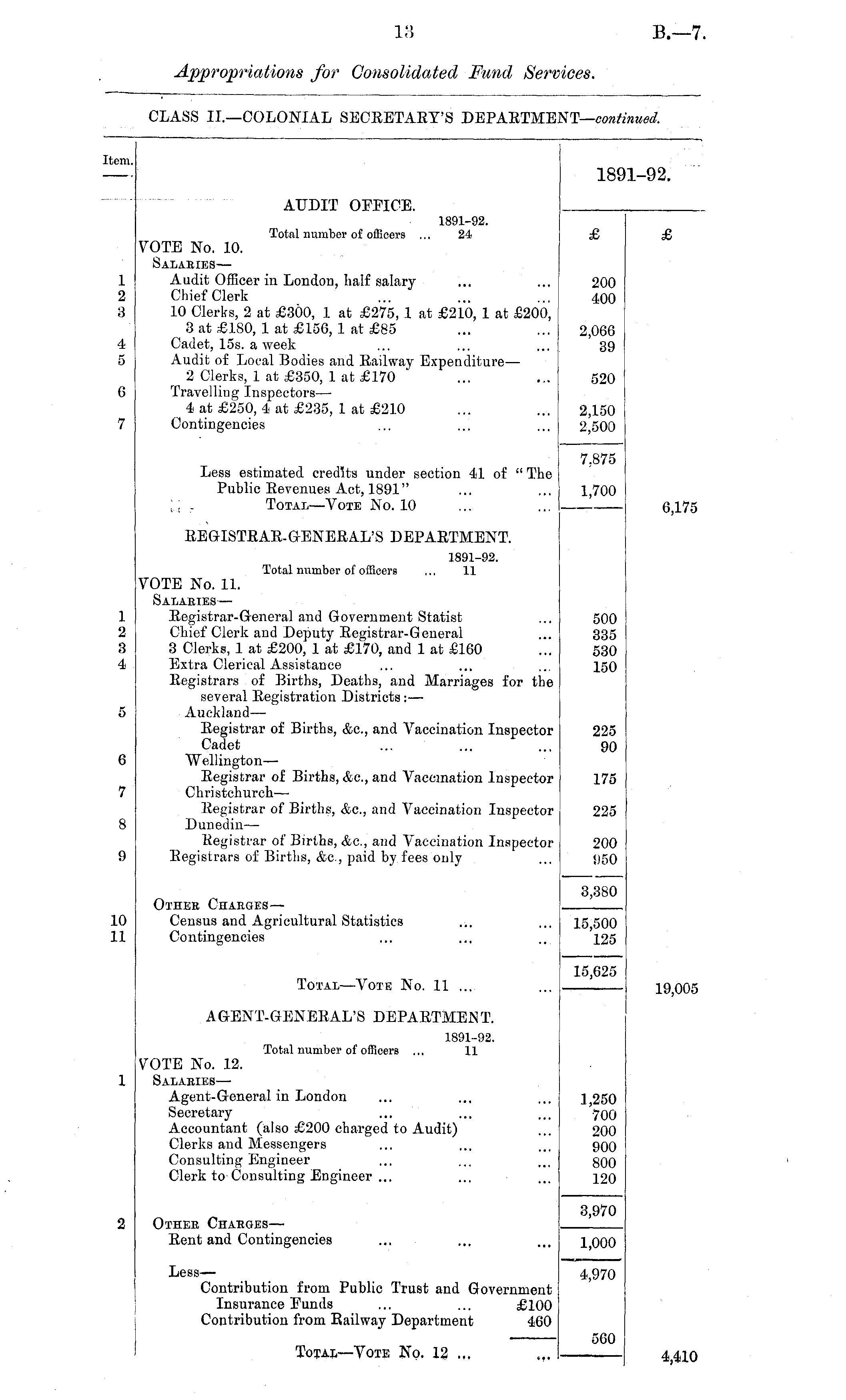 item. 1891-92. AUDIT OFFICE. 1891-92. Total number of officers ... 24 VOTE No. 10. Salaries— Audit Officer in LondoD, half salaryChief Clerk 10 Clerks, 2 at £300, 1 at £275, 1 at £210, 1 at £200, 3 at £180, 1 at £156, 1 at £85 Cadet, 15s. a week Audit of Local Bodies and Railway Expenditure — 2 Clerks, 1 at £350, 1 at £170 Travelling Inspectors— 4 at £250, 4 at £235, 1 at £210 Contingencies £ 1 2 3 200 400 4 5 2,066 39 (i 520 7 2,150 2,500 Less estimated credits under section 41 of " The Public Revenues Act, 1891" ;..; . Total—Vote No. 10 7,875 1,700 REGISTRAR-GENERAL'S DEPARTMENT. 6,175 1891-92. Total number of officers ... 11 1 2 3 4 f> VOTE No. 11. Salaries— Registrar-General and Government Statist Chief Clerk and Deputy Registrar-General 3 Clerks, 1 at £200, 1 at £170, and 1 at £160 Extra Clerical Assistance Registrars of Births, Deaths, and Marriages for the several Registration Districts : — Auckland — Registrar of Births, &c, and Vaccination Inspector Cadet Wellington— Registrar of Births, &c, and Vaccination Inspector Christchurch — Registrar of Births, &c, and Vaccination Inspector Dunedin — Registrar of Births, &c, and Vaccination Inspector Registrars of Births, &c, paid by fees only 500 335 530 150 225 90 6 175 7 8 225 i) 200 !)50 Otheh Charges— Census and Agricultural Statistics Contingencies 3,380 10 11 15,500 125 Total—Vote No. 11 ... 15,625 AGENT-GENERAL'S DEPARTMENT. 1891-92. Total number of officers ... 11 VOTE No. 12. Salaries — Agent-General in London Secretary Accountant (also £200 charged to Audit) Clerks and Messengers Consulting Engineer Clerk to Consulting Engineer ... 19,005 1,250 700 200 900 800 120 Other Charges— Rent and Contingencies Less— Contribution from Public Trust and Government Insurance Funds ... ... £100 Contribution from Railway Department 460 3,970 1,000 4,970 4,410 560 Total —Vote No. 12 ... ...