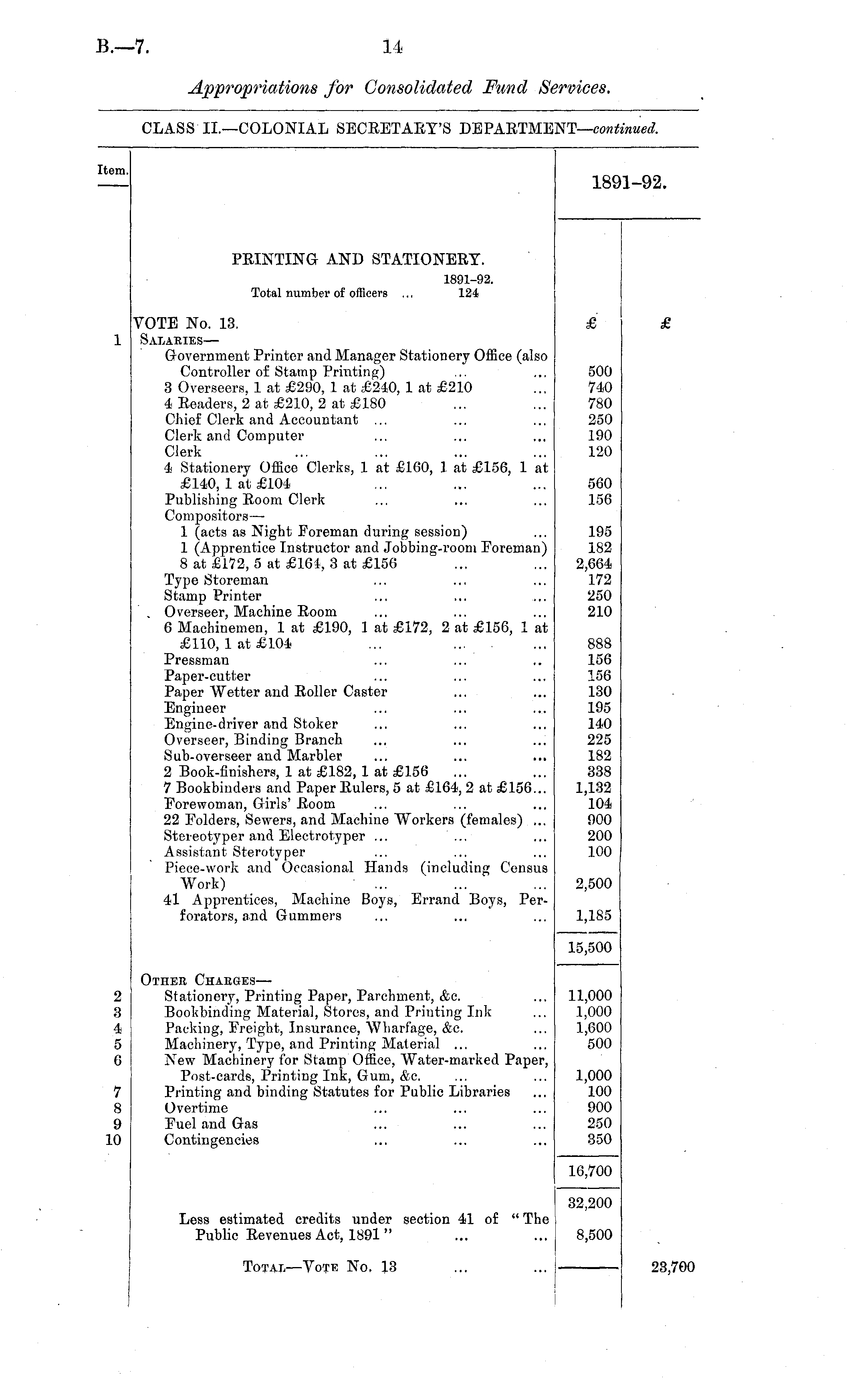 item. 1891-92. PEINTING AND STATIONEEY. 1891-92. Total number of officers ... 124 VOTE No. 13. Salaeies— Government Printer and Manager Stationery Office (also Controller of Stamp Printing) 3 Overseers, 1 at £290, 1 at £240, 1 at £210 4 Readers, 2 at £210, 2 at £180 Chief Clerk and Accountant ... Clerk and Computer Clerk 4 Stationery Office Clerks, 1 at £160, 1 at £156, 1 at £140, 1 at £104 Publishing Boom Clerk Compositors — 1 (acts as Night Foreman during session) 1 (Apprentice Instructor and Jobbing-room Foreman) 8 at £172, 5 at £164, 3 at £156 Type Storeman Stamp Printer . Overseer, Machine Eoom 6 Machinemen, 1 at £190, 1 at £172, 2 at £156, 1 at £110, 1 at £104 ... ... . Pressman Paper-cutter Paper Wetter and Eoller Caster Engineer Engine-driver and Stoker Overseer, Binding Branch Sub-overseer and Marbler 2 Book-finishers, 1 at £182, 1 at £156 7 Bookbinders and Paper Eulers, 5 at £164, 2 at £156... Forewoman, Girls' Eoom 22 Folders, Sewers, and Machine Workers (females) ... Stereotyper and Electrotyper ... ... Assistant Sterotyper Piece-work and Occasional Hands (including Census Work) ' ... 41 Apprentices, Machine Boys, Errand Boys, Perforators, and Gummers £ 500 740 780 250 190 120 560 156 195 182 2,664 172 250 210 888 156 156 130 195 140 225 182 338 1,132 104 900 200 100 2,500 1,185 15,500 2 8 4 5 0 Otheb, Chaeges— Stationerjr, Printing Paper, Parchment, &c. Bookbinding Material, Stores, and Printing Ink Packing, Freight, Insurance, Wharfage, &c. Machinery, Type, and Printing Material ... New Machinery for Stamp Office, Water-marked Paper, Post-cards, Printing Ink, Gum, &c. Printing and binding Statutes for Public Libraries Overtime Fuel and Gas Contingencies 11,000 1,000 1,600 500 7 8 9 10 1,000 100 900 250 350 16,700 Less estimated credits under section 41 of " The Public Eevenues Act, 1891" 32,200 8,500 Total —Vote No, 13 23,700