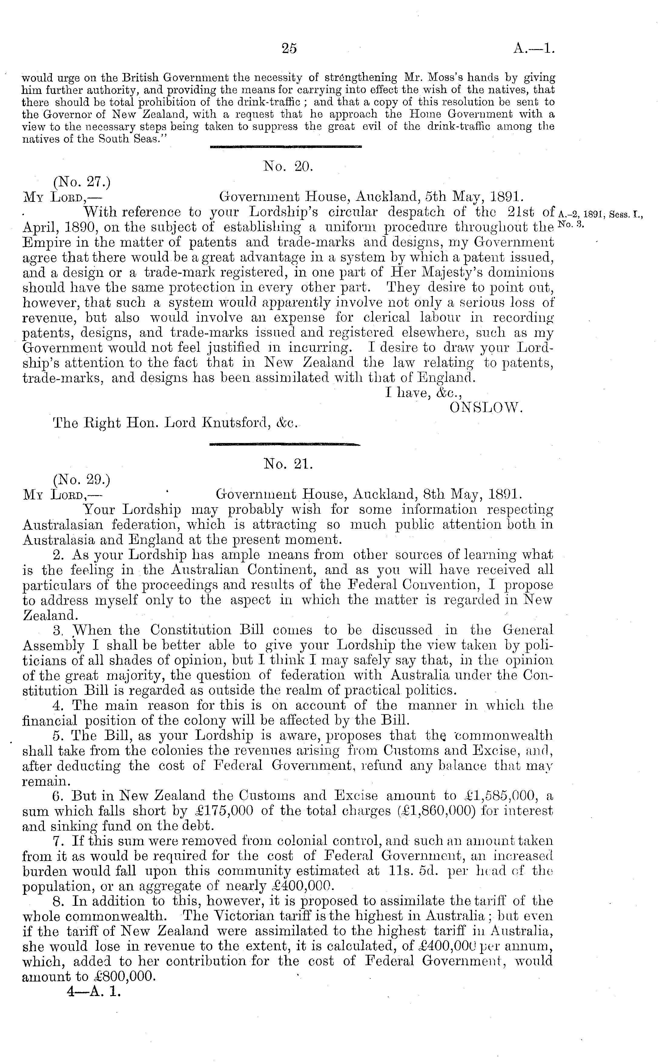 No. 21. (No. 29.) My Lord, — Government House, Auckland, Bth May, 1891. Your Lordship may probably wish for some information respecting Australasian federation, which is attracting so much public attention both in Australasia and England at the present moment. 2. As your Lordship has ample means from other sources of learning what is the feeling in the Australian Continent, and as you will have received all particulars of the proceedings and results of the Federal Convention, I propose to address myself only to the aspect in which the matter is regarded in New Zealand. 3. When the Constitution Bill comes to be discussed in the General Assembly I shall be better able to give your Lordship the view taken by politicians of all shades of opinion, but I think I may safely say that, in the opinion of the great majority, the question of federation with Australia under the Constitution Bill is regarded as outside the realm of practical politics. 4. The main reason for this is on account of the manner in which the financial position of the colony will be affected by the Bill. 5. The Bill, as your Lordship is aware, proposes that the commonwealth shall take from the colonies the revenues arising from Customs and Excise, and, after deducting the cost of Federal Government, refund any balance that may remain. 6. But in New Zealand the Customs and Excise amount to £1, 585,000, a, sum which falls short by £175,000 of the total charges (£1,860,000) for interest and sinking fund on the debt. 7. If this sum were removed from colonial control, and such an amount taken from it as would be required for the cost of Federal Government, an increased burden would fall upon this community estimated at lis. od. per head of the population, or an aggregate of nearly .£400,000. 8. In addition to this, however, it is proposed to assimilate the tariff of the whole commonwealth. The Victorian tariff is the highest in Australia; but even if the tariff of New Zealand were assimilated to the highest tariff in Australia, she would lose in revenue to the extent, it is calculated, of £400,000 per annum, which, added to her contribution for the cost of Federal Government, would amount to £800,000.