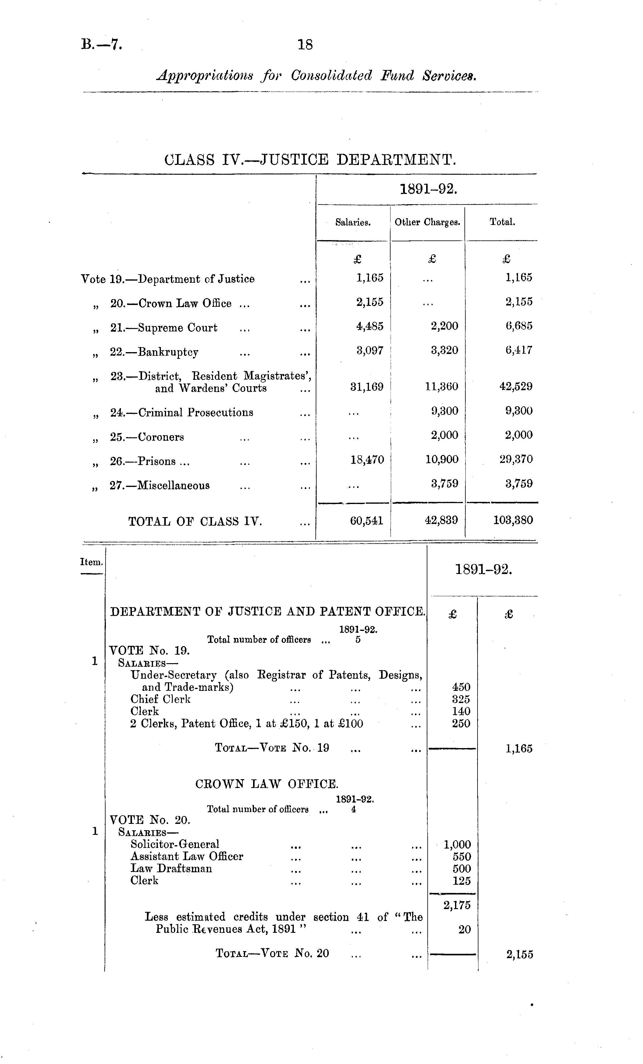 1891-92. Salaries. Otlier Charges. Total. £ £ £ ote 19.—Department of Justice 1,165 1,165 „ 20.—Crown Law Office ... 2,155 2,155 „ 21. —Supreme Court 4,485 2,200 6,685 „ 22.—Bankruptcy 3,097 3,320 6,417 „ 23.—District, Resident Magistrates', and Wardens' Courts 31,169 11,360 42,529 „ 24. —Criminal Prosecutions 9,300 9,300 „ 25. —Coroners ... 2,000 2,000 „ 26. —Prisons ... 18,470 10,900 29,370 „ 27.—Miscellaneous 3,759 3,759 TOTAL OF CLASS IV. 60,541 .2,839 103,380 !tem. 1 -891-92. DEPAETMENT OF JUSTICE AND PATENT OFFICE. £ ;£ 1891-92. Total number of officers ... 5 VOTE No. 19. Salaries — ITnder-Secretary (also Registrar of Patents, Designs, and Trade-marks) Chief Clerk Clerk 2 Clerks, Patent Office, 1 at £150, 1 at £100 450 325 140 250 Total —Vote No. 19 1,165 CROWN LAW OFFICE. 1891-92. Total number of officers ... 4 VOTE No. 20. Salaries— Solicitor-General Assistant Law Officer Law Draftsman Clerk 1,000 550 500 125 Less estimated credits under section 41 of " The Public Revenues Act, 1891 " 2,175 20 Total —Vote No. 20 2,1, •5
