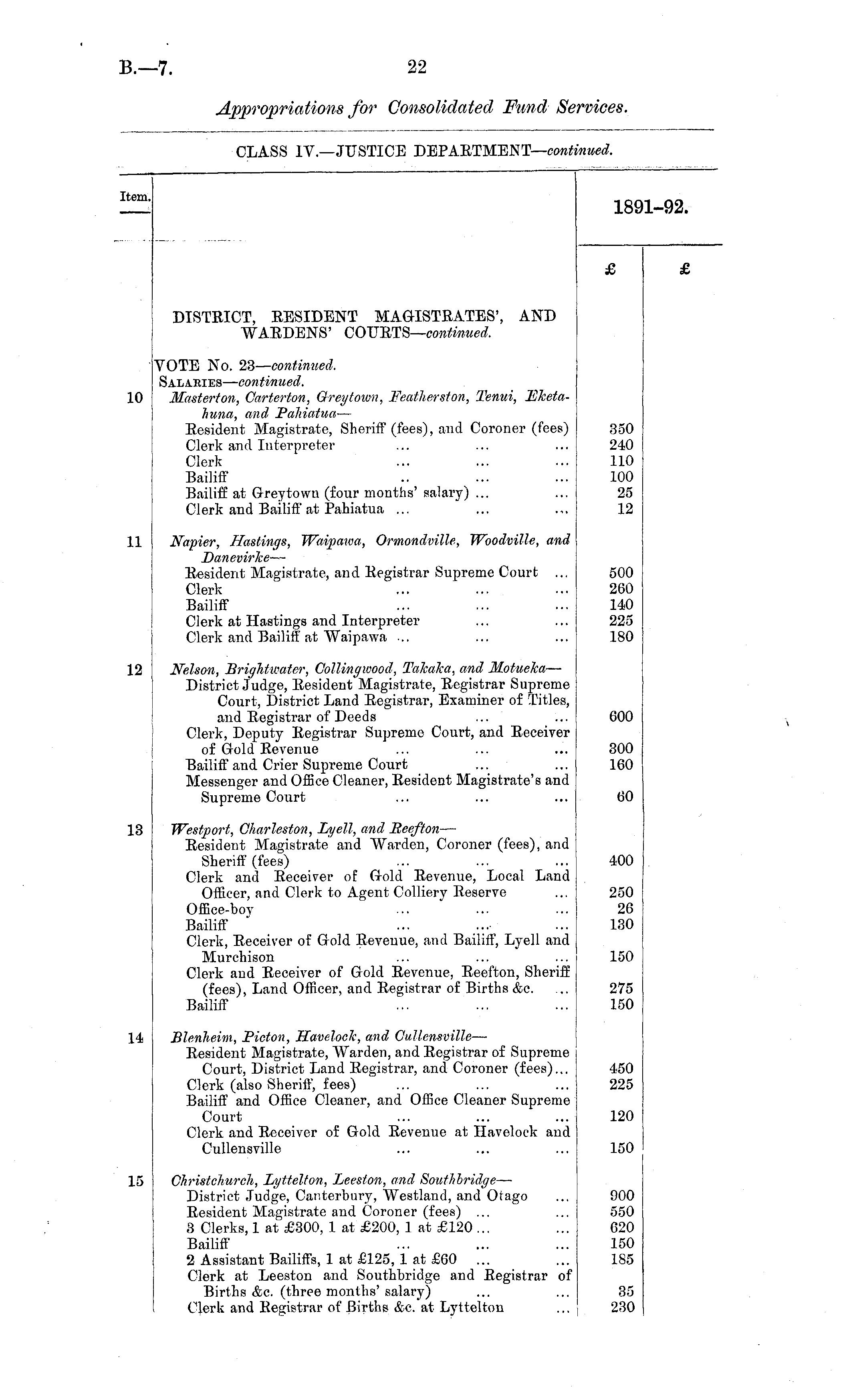 "tern. 18 1-92. DISTRICT, RESIDENT MAGISTRATES', AND WARDENS' COURTS—continued. 10 VOTE No. 23— continued, Salaeies — continued. Masterton, Carterton, Gbeytown, Featherston, Tenui, EhetaJiuna, and Bahiatua — Resident Magistrate, Sheriff (fees), and Coroner (fees) Clerk and Interpreter Clerk Bailiff Bailiff at Greytown (four months' salary) ... Clerk and Bailiff at Pahiatua ... 350 240 110 100 25 12 11 Napier, Hastings, Waipawa, Orinondville, Woodville, and Danevirlce — Resident Magistrate, and Registrar Supreme Court ... Clerk Bailiff Clerk at Hastings and Interpreter Clerk and Bailiff at "Waipawa ■.. 500 260 140 225 180 12 Nelson, Briglitwater, Gollingwood, TaTtaha, and MotueTca — District Judge, Resident'Magistrate, Registrar Supreme Court, District Land Registrar, Examiner of Titles, and Registrar of Deeds Clerk, Deputy Registrar Supreme Court, and Receiver of Gold Revenue Bailiff and Crier Supreme Court Messenger and Office Cleaner, Resident Magistrate's and Supreme Court 600 300 160 60 13 Westport, Charleston, Lyell, and Reefton — Resident Magistrate and Warden, Coroner (fees), and Sheriff (fees) Clerk and Receiver of Gold Revenue, Local Land Officer, and Clerk to Agent Colliery Reserve Office-boy Bailiff Clerk, Receiver of Gold Revenue, and Bailiff, Lyell and Murchison Clerk and Receiver of Gold Revenue, Reefton, Sheriff (fees), Land Officer, and Registrar of Births &c. Bailiff 400 250 26 130 150 275 150 14 Blenheim, Picton, Haveloek, and Cullensville — Resident Magistrate, Warden, and Registrar of Supreme Court, District Land Registrar, and Coroner (fees)... Clerk (also Sheriff, fees) Bailiff and Office Cleaner, and Office Cleaner Supreme Court Clerk and Receiver of Gold Revenue at Haveloek and Cullensville 450 225 120 150 15 Christchurcli, Lyttelton, Leeston, and Soutlibridge — District Judge, Canterbury, Westland, and Otago Resident Magistrate and Coroner (fees) ... 8 Clerks, 1 at £300, 1 at £200, ] at £120 ... Bailiff 2 Assistant Bailiffs, 1 at £125, 1 at £60 ... Clerk at Leeston and Southbridge and Registrar of Births &c. (three months' salary) Clerk and Registrar of Births &c. at Lyttelton 900 550 620 150 185 35 230