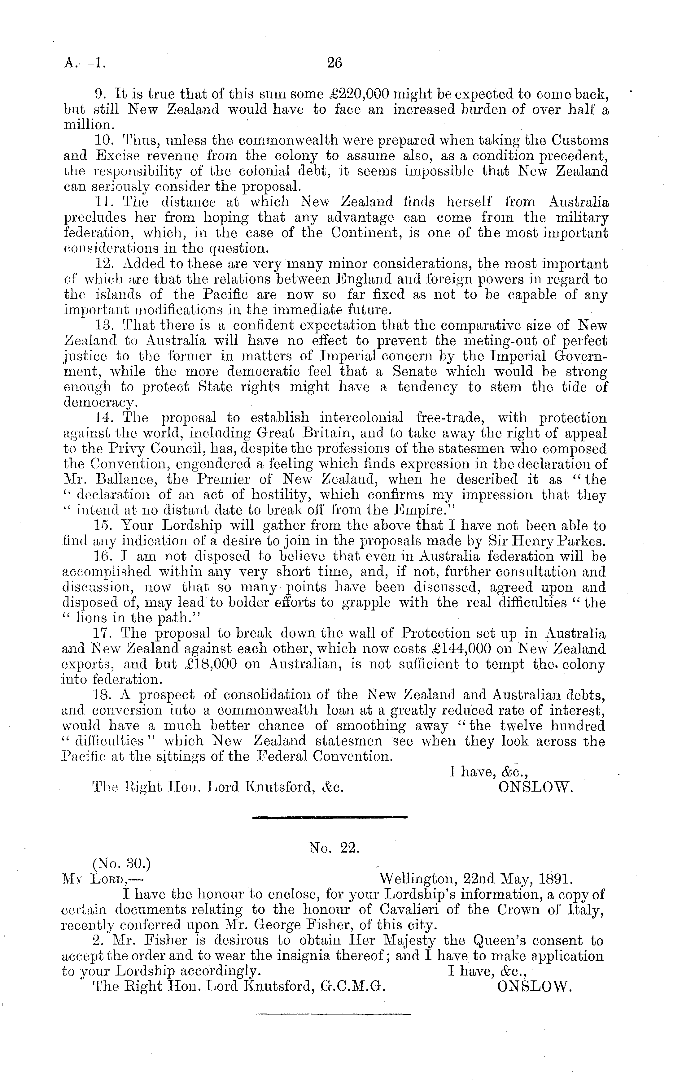 9. It is true that of this sum some £220,000 might be expected to come back, but still New Zealand would have to face an increased burden of over half a million. 10. Thus, unless the commonwealth were prepared when taking the Customs and Excise revenue from the colony to assume also, as a condition precedent, the responsibility of the colonial debt, it seems impossible that New Zealand can seriously consider the proposal. 11. The distance at which New Zealand finds herself from Australia precludes her from hoping that any advantage can come from the military federation, which, in the case of the Continent, is one of the most important considerations in the question. 12. Added to these are very many minor considerations, the most important of which are that the relations between England and foreign powers in regard to the islands of the Pacific are now so far fixed as not to be capable of any important modifications in the immediate future. .13. That there is a confident expectation that the comparative size of New Zealand to Australia will have no effect to prevent the meting-out of perfect justice to the former in matters of Imperial concern by the Imperial Government, while the more democratic feel that a Senate which would be strong enough to protect State rights might have a tendency to stem the tide of democracy. 14. The proposal to establish intercolonial free-trade, with protection against the world, including Great Britain, and to take away the right of appeal to the Privy Council, has, despite the professions of the statesmen who composed the Convention, engendered a feeling which finds expression in the declaration of Mr. Ballance, the Premier of New Zealand, when he described it as " the " declaration of an act of hostility, which confirms my impression that they " intend at no distant date to break off from the Empire." 15. Your Lordship will gather from the above that I have not been able to find any indication of a desire to join in the proposals made by Sir Henry Parkes. 16. I am not disposed to believe that even in Australia federation will be accomplished within any very short time, and, if not, further consultation and discussion, now that so many points have been discussed, agreed upon and disposed of, may lead to bolder efforts to grapple with the real difficulties " the " lions in the path." 17. The proposal to break down the wall of Protection set up in Australia and New Zealand against each other, which now costs £144,000 on New Zealand exports, and but £18,000 on Australian, is not sufficient to tempt the. colony into federation. 18. A prospect of consolidation of the New Zealand and Australian debts, and conversion into a commonwealth loan at a greatly reduced rate of interest, would have a much better chance of smoothing away "the twelve hundred " difficulties " which New Zealand statesmen see when they look across the Pacific at the sittings of the Federal Convention. I have, &c, The Right Hon. Lord Knutsford, &c. ONSLOW.