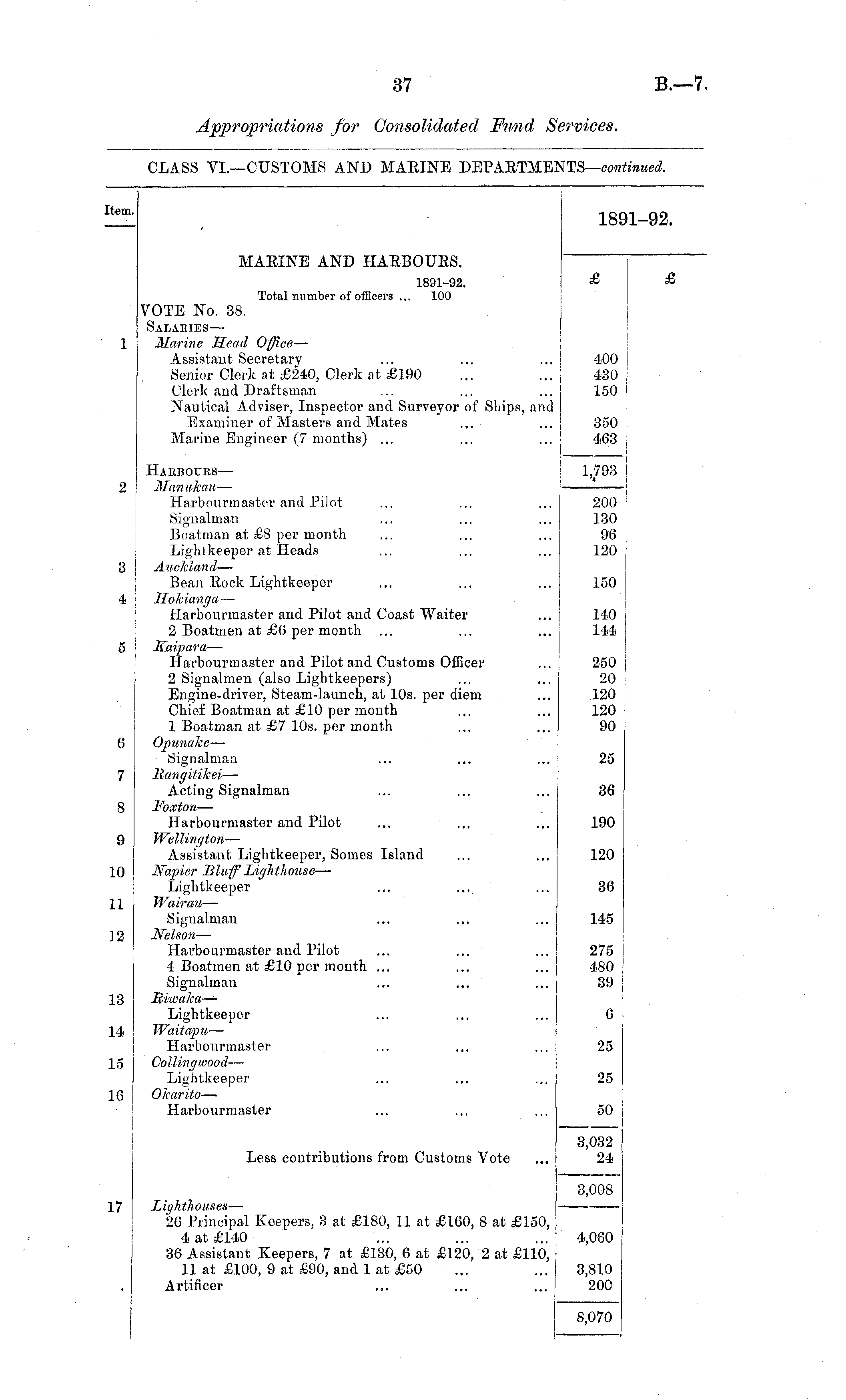 [tern. 1891-92. MAEINE AND HAEBOITES. 1891-92. Total number of officers ... 100 VOTE No. 38. Salahies — Marine Head Office — Assistant Secretary Senior Clerk at £240, Clerk at £190 Clerk and Draftsman Nautical Adviser, Inspector and Surveyor of Ships, and Examiner of Masters and Mates Marine Engineer (7 months) ... 400 430 150 350 463 6 7 8 3 4 Haebouks — Manukau — Harbourmaster and Pilot Signalman Boatman at £8 per month Lightkeeper at Heads Auckland — Bean Eock Lightkeeper Hokianga — Harbourmaster and Pilot and Coast Waiter 2 Boatmen at £0 per month Kaipara — Harbourmaster and Pilot and Customs Officer 2 Signalmen (also Lightkeepers) Engine-driver, Steam-launch, at 10s. per diem Chief Boatman at £10 per month 1 Boatman at £7 10s. per month Opunalce —- Signalman Bang itikei — Acting Signalman JFoxton — Harbourmaster and Pilot Wellington — Assistant Lightkeeper, Somes Island Napier Bluff'Lighthouse — Lightkeeper Wairau — Signalman Nelson — Harbourmaster and Pilot 4 Boatmen at £10 per month ... Signalman Riwaka — Lightkeeper Waitapu — Harbourmaster GoUingwood — Lightkeeper Olcarito — Harbourmaster 1,793 i 200 130 96 120 150 140 144 250 20 120 120 90 25 36 190 9 120 10 36 11 145 12 275 480 39 13 6 14 25 IS 25 10 50 Less contributions from Customs Vote 3,032 24 Lighthouses — 20 Principal Keepers, 3 at £180, 11 at £160, 8 at £150, 4 at £140 36 Assistant Keepers, 7 at £130, 6 at £120, 2 at £110, 11 at £100, 9 at £90, and 1 at £50 Artificer 3,008 17 4,060 3,810 200 8,070