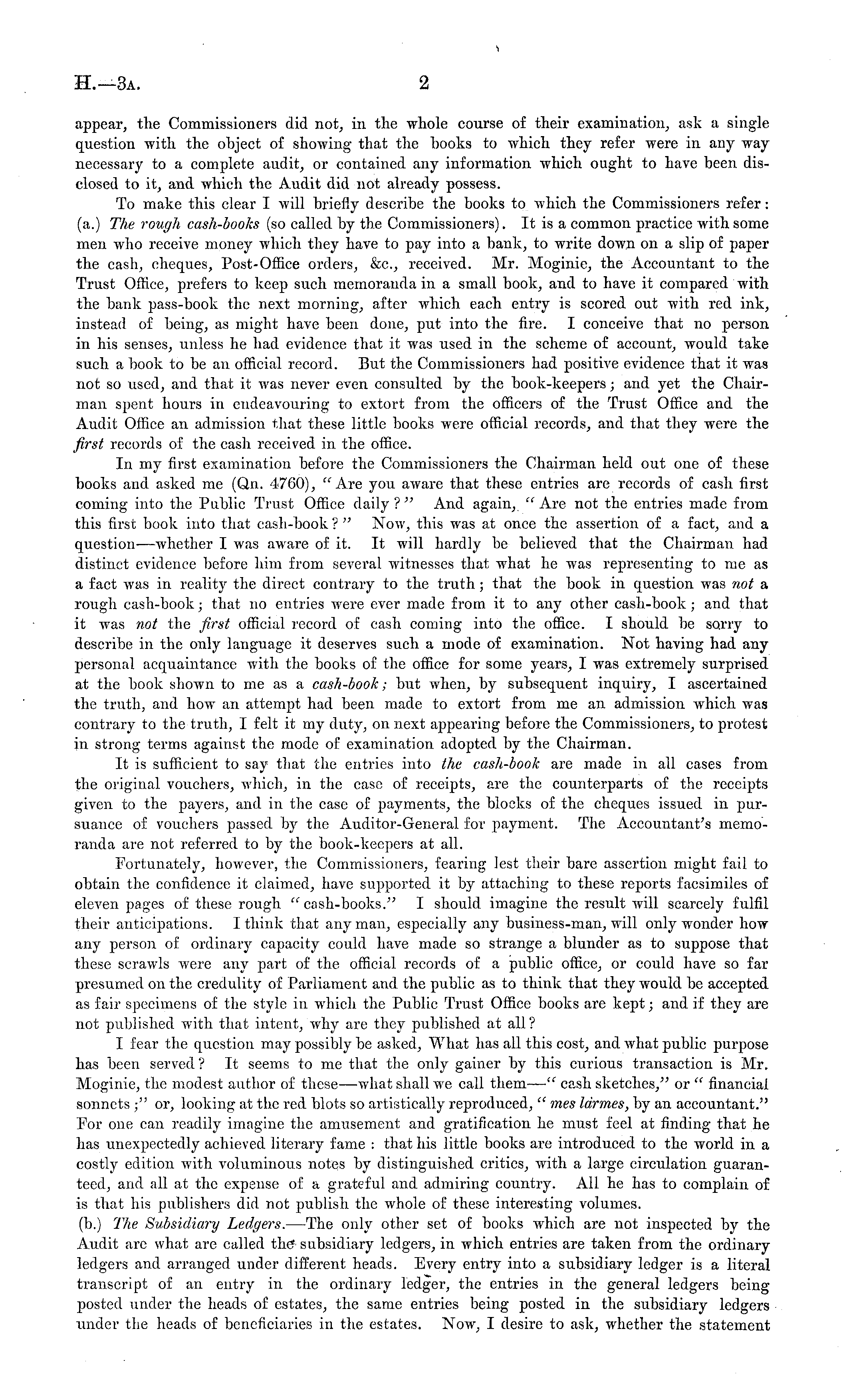 appear, the Commissioners did not, in the whole course of their examination, ask a single question with the object of showing that the books to which they refer were in any way necessary to a complete audit, or contained any information which ought to have been disclosed to it, and which the Audit did not already possess. To make this clear I will briefly describe the books to which the Commissioners refer: (a.) The rough cash-books (so called by the Commissioners). It is a common practice with some men who receive money which they have to pay into a bank, to write down on a slip of paper the cash, cheques, Post-Office orders, &c, received. Mr. Moginie, the Accountant to the Trust Office, prefers to keep such memoranda in a small book, and to have it compared with the bank pass-book the next morning, after which each entry is scored out with red ink, instead of being, as might have been done, put into the fire. I conceive that no person in his senses, unless he had evidence that it was used in the scheme of account, would take such a book to be an official record. But the Commissioners had positive evidence that it was not so used, and that it was never even consulted by the book-keepers; and yet the Chairman spent hours in endeavouring to extort from the officers of the Trust Office and the Audit Office an admission that these little books were official records, and that they were the first records of the cash received in the office. In my first examination before the Commissioners the Chairman held out one of these books and asked me (Qn. 4760), "Are you aware that these entries are records of cash first coming into the Public Trust Office daily ? " And again, " Are not the entries made from this first book into that cash-book ? " Now, this was at once the assertion of a fact, and a question—whether I was aware of it. It will hardly be believed that the Chairman had distinct evidence before him from several witnesses that what he was representing to me as a fact was in reality the direct contrary to the truth; that the book in question was not a rough cash-book; that no entries were ever made from, it to any other cash-book; and that it was not the first official record of cash coming into the office. I should be sorry to describe in the only language it deserves such a mode of examination. Not having had any personal acquaintance with the books of the office for some years, I was extremely surprised at the book shown to me as a cash-book; but when, by subsequent inquiry, I ascertained the truth, and how an attempt had been made to extort from me an admission which was contrary to the truth, I felt it my duty, on next appearing before the Commissioners, to protest in strong terms against the mode of examination adopted by the Chairman. It is sufficient to say that the entries into the cash-book are made in all cases from the original vouchers, which, in the case of receipts, are the counterparts of the receipts given to the payers, and in the case of payments, the blocks of the cheques issued in pursuance of vouchers passed by the Auditor-General for payment. The Accountant's memoranda are not referred to by the book-keepers at all. Fortunately, however, the Commissioners, fearing lest their bare assertion might fail to obtain the confidence it claimed, have supported it by attaching to these reports facsimiles of eleven pages of these rough " cash-books." I should imagine the result will scarcely fulfil their anticipations. I think that any man, especially any business-man, will only wonder how any person of ordinary capacity could have made so strange a blunder as to suppose that these scrawls were any part of the official records of a public office, or could have so far presumed on the credulity of Parliament and the public as to think that they would be accepted as fair specimens of the style in which the Public Trust Office books are kept; and if they are not published with that intent, why are they published at all ? I fear the question may possibly be asked, What has all this cost, and what public purpose has been served ? It seems to me that the only gainer by this curious transaction is Mr. Moginie, the modest author of these—what shall we call them—" cash sketches," or " financial sonnets ;" or, looking at the red blots so artistically reproduced, " mes Idrmes, by an accountant." For one can readily imagine the amusement and gratification he must feel at finding that he has unexpectedly achieved literary fame : that his little books are introduced to the world in a costly edition with voluminous notes by distinguished critics, with a large circulation guaranteed, and all at the expense of a grateful and admiring country. All he has to complain of is that his publishers did not publish the whole of these interesting volumes, (b.) The Subsidiary Ledgers. —The only other set of books which are not inspected by the Audit arc what are called the subsidiary ledgers, in which entries are taken from the ordinary ledgers and arranged under different heads. Every entry into a subsidiary ledger is a literal transcript of an entry in the ordinary ledger, the entries in the general ledgers being posted under the heads of estates, the same entries being posted in the subsidiary ledgers imder the heads of beneficiaries in the estates. Now, I desire to ask, whether the statement