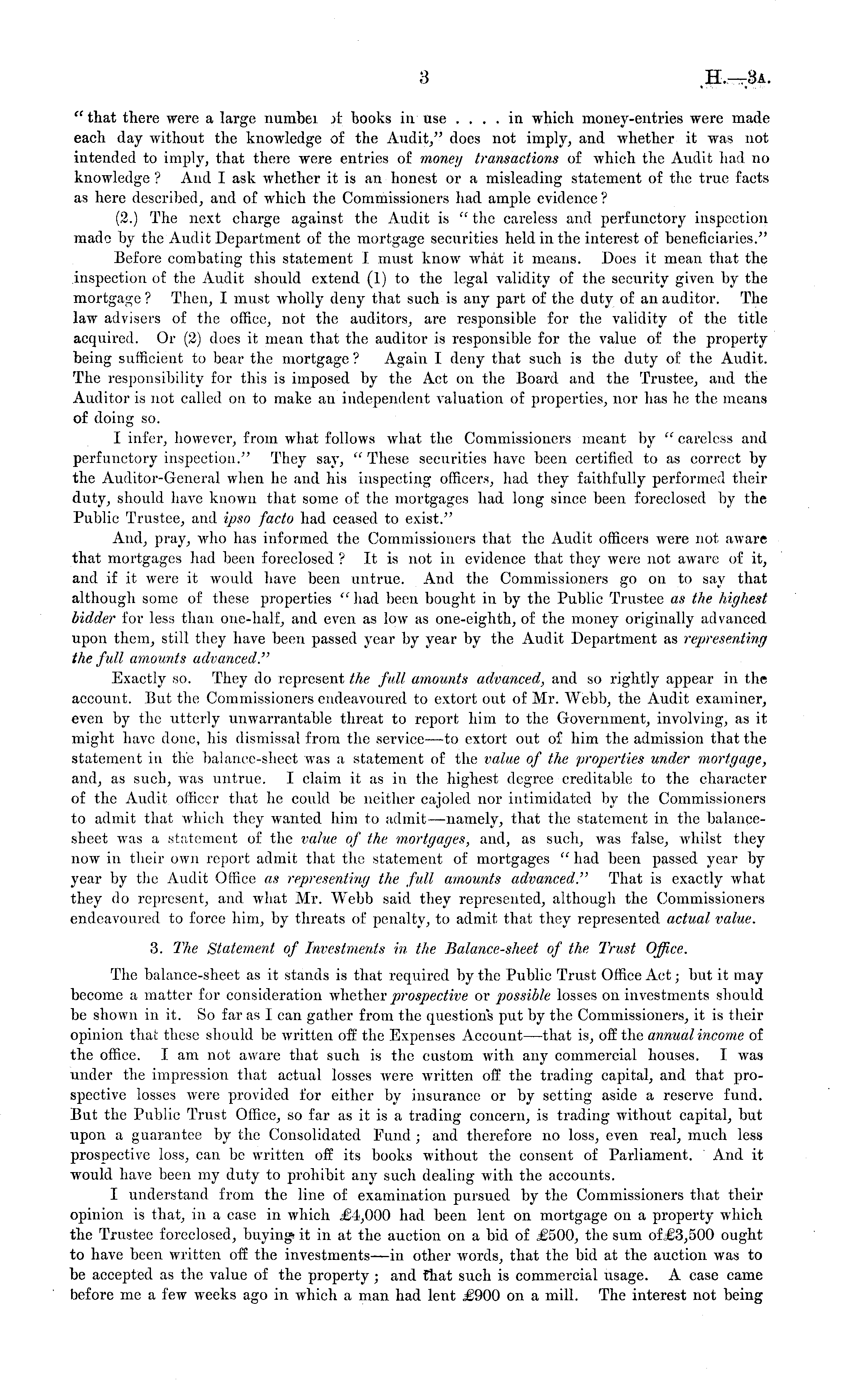 " that there were a large numbei A books in use .... in which money-entries were made each day without the knowledge of the Audit/ does not imply, and whether it was not intended to imply, that there were entries of money transactions of which the Audit had no knowledge ? And I ask whether it is an honest or a misleading statement of the ti-ue facts as here described, and of which the Commissioners had ample evidence ? (2.) The next charge against the Audit is " the careless and perfunctory inspection made by the Audit Department of the mortgage securities held in the interest of beneficiaries." Before combating this statement 1. must know what it means. Does it mean that the inspection of the Audit should extend (1) to the legal validity of the security given by the mortgage ? Then, I must wholly deny that such is any part of the duty of an auditor. The law advisers of the office, not the auditors, are responsible for the validity of the title acquired. Or (2) docs it mean that the auditor is responsible for the value of the property being sufficient to bear the mortgage ? Again I deny that such is the duty of the Audit. The responsibility for this is imposed by the Act on the Board and the Trustee, and the Auditor is not called on to make an independent valuation of properties, nor has he the means of doing so. I infer, however, from what follows what the Commissioners meant by " careless and perfunctory inspection." They say, " These securities have been certified to as correct by the Auditor-General when he and his inspecting officers, had they faithfully performed their duty, should have known that some of the mortgages had long since been foreclosed by the Public Trustee, and ipso facto had ceased to exist." And, pray, who has informed the Commissioners that the Audit officers were not aware that mortgages had been foreclosed ? It is not in evidence that they were not aware of it, and if it were it would have been untrue. And the Commissioners go on to say that although some of these properties " had been bought in by the Public Trustee as the highest bidder for less than one-half, and even as low as one-eighth, of the money originally advanced upon them, still they have been passed year by year by the Audit Department as representing the full amounts advanced." Exactly so. They do represent the full amounts advanced, and so rightly appear in the account. But the Commissioners endeavoured to extort out of Mr. Webb, the Audit examiner, even by the utterly unwarrantable threat to report him to the Government, involving, as it might have done, his dismissal from the service—to extort out of him the admission that the statement in the balance-sheet was a statement of the value of the properties under mortgage, and, as such, was untrue. I claim it as in the highest degree creditable to the character of the Audit officer that he could be neither cajoled nor intimidated by the Commissioners to admit that which they wanted him to admit —namely, that the statement in the balancesheet was a statement of the value of the mortgages, and, as such, was false, whilst they now in their own report admit that the statement of mortgages " had been passed year by year by the Audit Office as representing the full amounts advanced." That is exactly what they do represent, and what Mr. Webb said they represented, although the Commissioners endeavoured to force him, by threats of penalty, to admit that they represented actual value. 3. The Statement of Investments in the Balance-sheet of the Trust Office. The balance-sheet as it stands is that required by the Public Trust Office Act; but it may become a matter for consideration whether prospective or possible losses on investments should be shown in it. So far as I. can gather from the questions put by the Commissioners, it is their opinion that these should be written off the Expenses Account —that is, off the annual income of the office. lam not aware that such is the custom with any commercial houses. 1 was under the impression that actual losses were written off the trading capital, and that prospective losses were provided for either by insurance or by setting aside a reserve fund. But the Public Trust Office, so far as it is a trading concern, is trading without capital, but upon a guarantee by the Consolidated Fund ; and therefore no loss, even real, much less prospective loss, can be written off its books without the consent of Parliament. And it would have been my duty to prohibit any such dealing with the accounts. I understand from the line of examination pursued by the Commissioners that their opinion is that, in a case in which ,£4,000 had been lent on mortgage on a property which the Trustee foreclosed, buying it in at the auction on a bid of JSOO, the sum of £3,500 ought to have been written off the investments—in other words, that the bid at the auction was to be accepted as the value of the property ; and that such is commercial usage. A ease came before me a few weeks ago in which a man had lent £900 on a mill. The interest not being