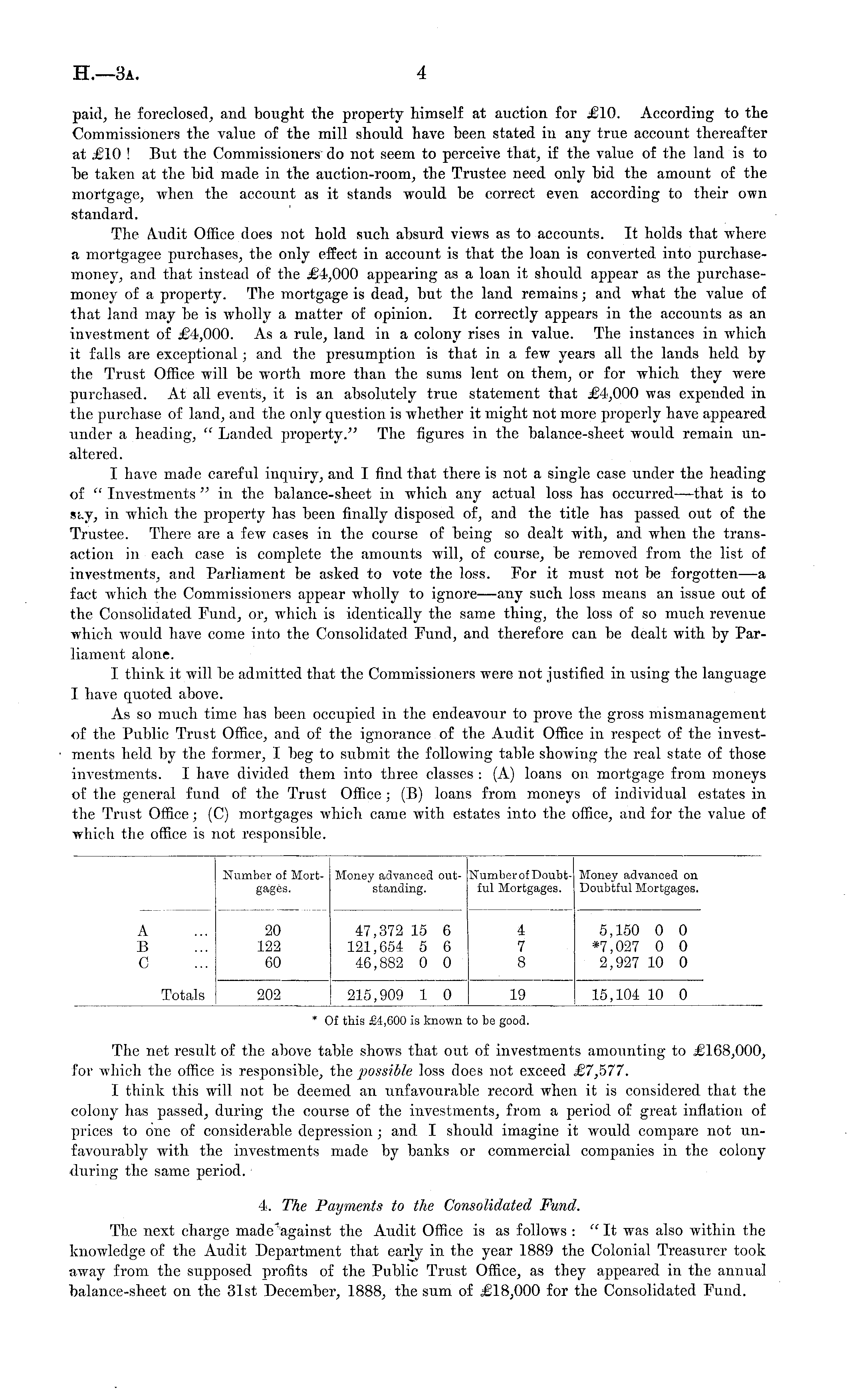 • Of this £4,600 is known to be good. The net result of the above table shows that out of investments amounting to £168,000, for which the office is responsible, the possible loss does not exceed £7,577. I think this will not be deemed an unfavourable record when it is considered that the colony has passed, during the course of the investments, from a period of great inflation of prices to one of considerable depression ; and I should imagine it would compare not unfavourably with the investments made by banks or commercial companies in the colony during the same period. 4. The Payments to the Consolidated Fund. The next charge made'against the Audit Office is as follows : "It was also within the knowledge of the Audit Department that early in the year 1889 the Colonial Treasurer took away from the supposed profits of the Public Trust Office, as they appeared in the annual balance-sheet on the 31st December, 1888, the sum of £18,000 for the Consolidated Fund.