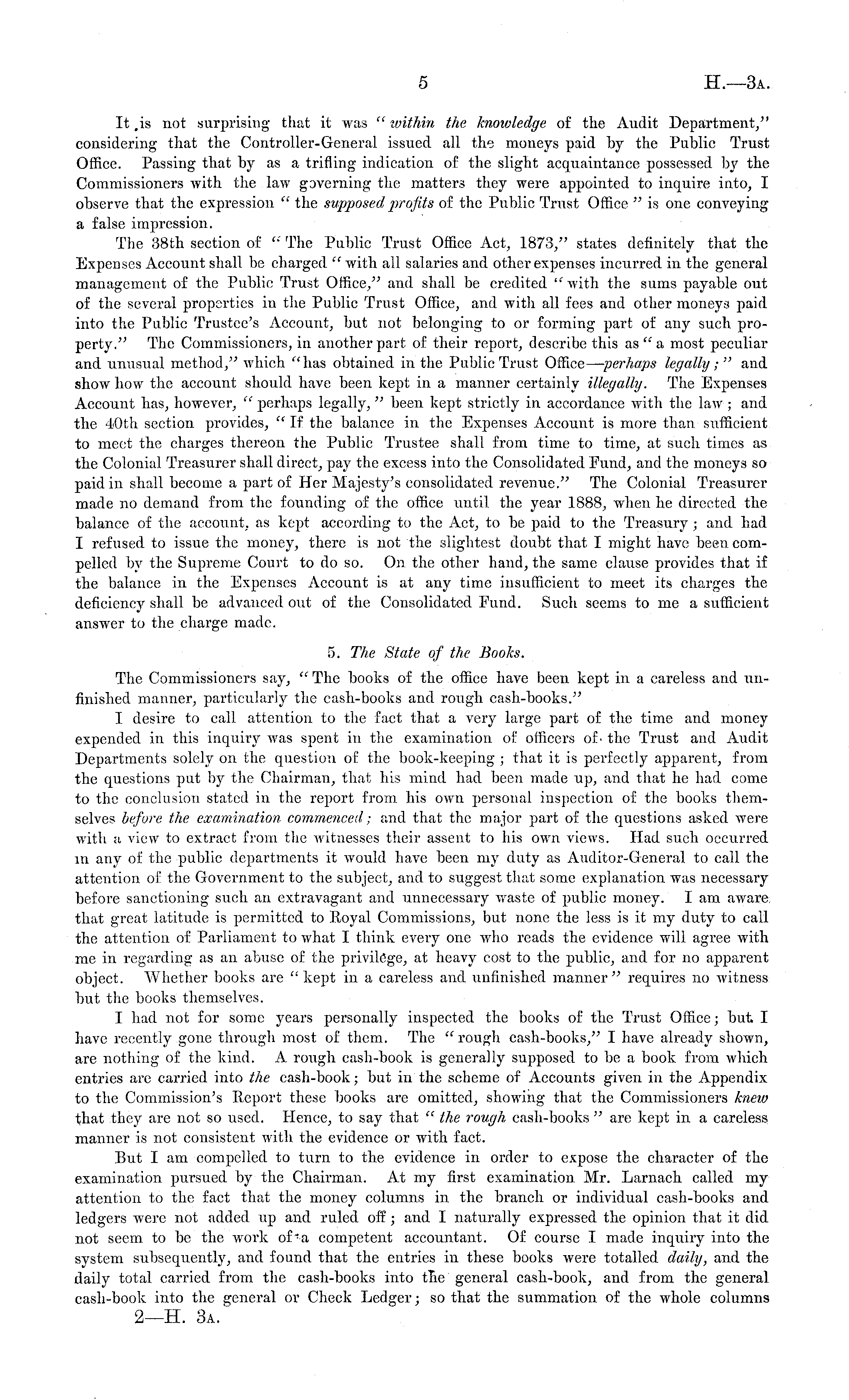 It ,is not surprising that it was " within the knowledge of the Audit Department/ considering that the Controller-General issued all the moneys paid by the Public Trust Office. Passing that by as a trifling indication of the slight acquaintance possessed by the Commissioners with the law governing the matters they were appointed to inquire into, I observe that the expression " the supposed profits of the Public Trust Office " is one conveying a false impression. The 38th section of " The Public Trust Office Act, 1873/' states definitely that the Expenses Account shall be charged " with all salaries and other expenses incurred in the general management of the Public Trust Office," and shall be credited " with the sums payable out of the several properties in the Public Trust Office, and with all fees and other moneys paid into the Public Trustee's Account, but not belonging to or forming part of any such property." The Commissioners, in another part of their report, describe this as "a most peculiar and unusual method," which "has obtained in the Public Trust Office — perhaps legally;" and show how the account should have been kept in a manner certainly illegally. The Expenses Account has, however, " perhaps legally," been kept strictly in accordance with the law ; and the 40th section provides, "If the balance in the Expenses Account is more than sufficient to meet the charges thereon the Public Trustee shall from time to time, at such times as the Colonial Treasurer shall direct, pay the excess into the Consolidated Eund, and the moneys so paid in shall become a part of Her Majesty's consolidated revenue." The Colonial Treasurer made no demand from the founding of the office until the year 1888, when he directed the balance of the account, as kept according to the Act, to be paid to the Treasury ; and had I refused to issue the money, there is not the slightest doubt that I might have been compelled by the Supreme Court to do so. On the other hand, the same clause provides that if the balance in the Expenses Account is at any time insufficient to meet its charges the deficiency shall be advanced out of the Consolidated Fund. Such seems to me a sufficient answer to the charge made. 5. The State of the Books. The Commissioners say, " The books of the office have been kept in a careless and unfinished manner, particularly the cash-books and rough cash-books." I desire to call attention to the fact that a very large part of the time and money expended in this inquiry was spent in the examination of officers of • the Trust and Audit Departments solely on the question of the book-keeping ; that it is perfectly apparent, from the questions put bj the Chairman, that his mind had been made up, and that he had come to the conclusion stated in the report from his own personal inspection of the books themselves before the examination commenced; and that the major part of the questions asked were with a view to extract from the witnesses their assent to his own views. Had such occurred m any of the public departments it would have been my duty as Auditor-General to call the attention of the Government to the subject, and to suggest that some explanation was necessary before sanctioning such an extravagant and unnecessary waste of public money. lam aware, that great latitude is permitted to Royal Commissions, but none the less is it my duty to call the attention of Parliament to what I think every one who reads the evidence will agree with me in regarding as an abuse of the privilege, at heavy cost to the public, and for no apparent object. Whether books are "kept in a careless and unfinished manner" requires no witness but the books themselves. I had not for some years personally inspected the books of the Trust Office ; but I have recently gone through most of them. The " rough cash-books," I have already shown, are nothing of the kind. A rough cash-book is generally supposed to be a book from which entries are carried into the cash-book; but in the scheme of Accounts given in the Appendix to the Commission's lleport these books are omitted, showing that the Commissioners knew that they are not so used. Hence, to say that " the rough cash-books " are kept in a careless manner is not consistent with the evidence or with fact. But I am compelled to turn to the evidence in order to expose the character of the examination pursued by the Chairman. At my first examination Mr. Larnach called my attention to the fact that the money columns in the branch or individual cash-books and ledgers were not added up and ruled off; and I naturally expressed the opinion that it did not seem to be the work of Ja competent accountant. Of course I made inquiry into the system subsequently, and found that the entries in these books were totalled daily, and the daily total carried from the cash-books into the general cash-book, and from the general cash-book into the general or Check Ledger; so that the summation of the whole columns 2—H. 3a.