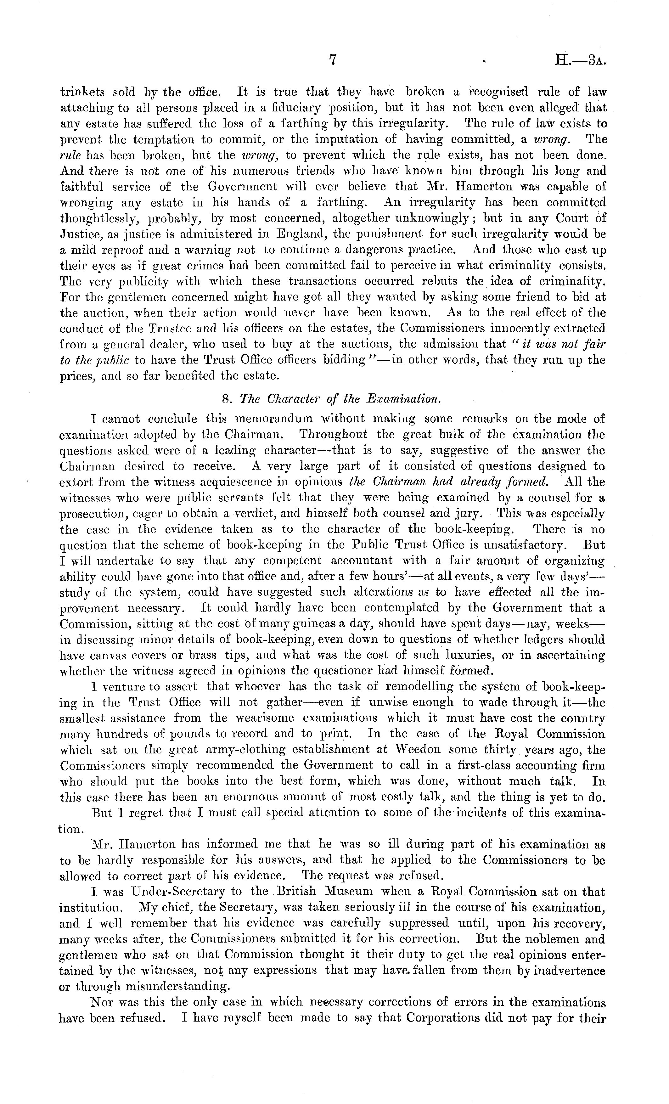 trinkets sold by the office. It is true that they have broken a recognised rule of law attaching to all persons placed in a fiduciary position, but it has not been even alleged that any estate has suffered the loss of a farthing by this irregularity. The rule of law exists to prevent the temptation to commit, or the imputation of having committed, a wrong. The rule has been broken, but the wrong, to prevent which the rule exists, has not been done. And there is not one of his numerous friends who have known him through his long and faithful service of the Government will ever believe that Mr. Hamerton was capable of wronging any estate in his hands of a farthing. An irregularity has been committed thoughtlessly, probably, by most concerned, altogether unknowingly j but in any Court of Justice, as justice is administered in England, the punishment for such irregularity would be a mild reproof and a warning not to continue a dangerous practice. And those who cast up their eyes as if great crimes had been committed fail to perceive in what criminality consists. The very publicity with which these transactions occurred rebuts the idea of criminality. For the gentlemen concerned might have got all they wanted by asking some friend to bid at the auction, when their action would never have been known. As to the real effect of the conduct of the Trustee and his officers on the estates, the Commissioners innocently extracted from a general dealer, who used to buy at the auctions, the admission that " it was not fair to the public to have the Trust Office officers bidding " —in other words, that they run up the prices, and so far benefited the estate. 8. I"he Character of the Examination. I cannot conclude this memorandum without making some remarks on the mode of examination adopted by the Chairman. Throughout the great bulk of the examination the questions asked were of a leading character —that is to say, suggestive of the answer the Chairman desired to receive. A very large part of it consisted of questions designed to extort from the witness acquiescence in opinions the Chairman had already formed. All the witnesses who were public servants felt that they were being examined by a counsel for a prosecution, eager to obtain a verdict, and himself both counsel and jury. This was especially the case in the evidence taken as to the character of the book-keeping. There is no question that the scheme of book-keeping in the Public Trust Office is unsatisfactory. But I will undertake to say that any competent accountant with a fair amount of organizing ability could have gone into that office and, after a few hours'—at all events, a very few days' — study of the system, could have suggested such alterations as to have effected all the improvement necessary. It could hardly have been contemplated by the Government that a Commission, sitting at the cost of many guineas a day, should have spent days —nay, weeks— in discussing minor details of book-keeping, even down to questions of whether ledgers should have canvas covers or brass tips, and what was the cost of such luxuries, or in ascertaining whether the witness agreed in opinions the questioner had himself formed. I venture to assert that whoever has the task of remodelling the system of book-keep-ing in the Trust Office will not gather —even if unwise enough to wade through it —the smallest assistance from the wearisome examinations which it must have cost the country many hundreds of pounds to record and to print. In the case of the Royal Commission which sat on the great army-clothing establishment at Weedon some thirty years ago, the Commissioners simply recommended the Government to call in a first-class accounting firm who should put the books into the best form, which was done, without much talk. In this case there has been an enormous amount of most costly talk, and the thing is yet to do. But I regret that I must call special attention to some of the incidents of this examination. Mr. Hamerton has informed me that he was so ill during part of his examination as to be hardly responsible for his answers, and that he applied to the Commissioners to be allowed to correct part of his evidence. The request was refused. I was Under-Secretary to the British Museum when a Royal Commission sat on that institution. My chief, the Secretary, was taken seriously ill in the course of his examination, and I well remember that his evidence was carefully suppressed until, upon his recovery, many weeks after, the Commissioners submitted it for his correction. But the noblemen and gentlemen who sat on that Commission thought it their duty to get the real opinions entertained by the witnesses, not any expressions that may have, fallen from them by inadvertence or through misunderstanding. Nor was this the only case in which necessary corrections of errors in the examinations have been refused. I have myself been made to say that Corporations did not pay for their