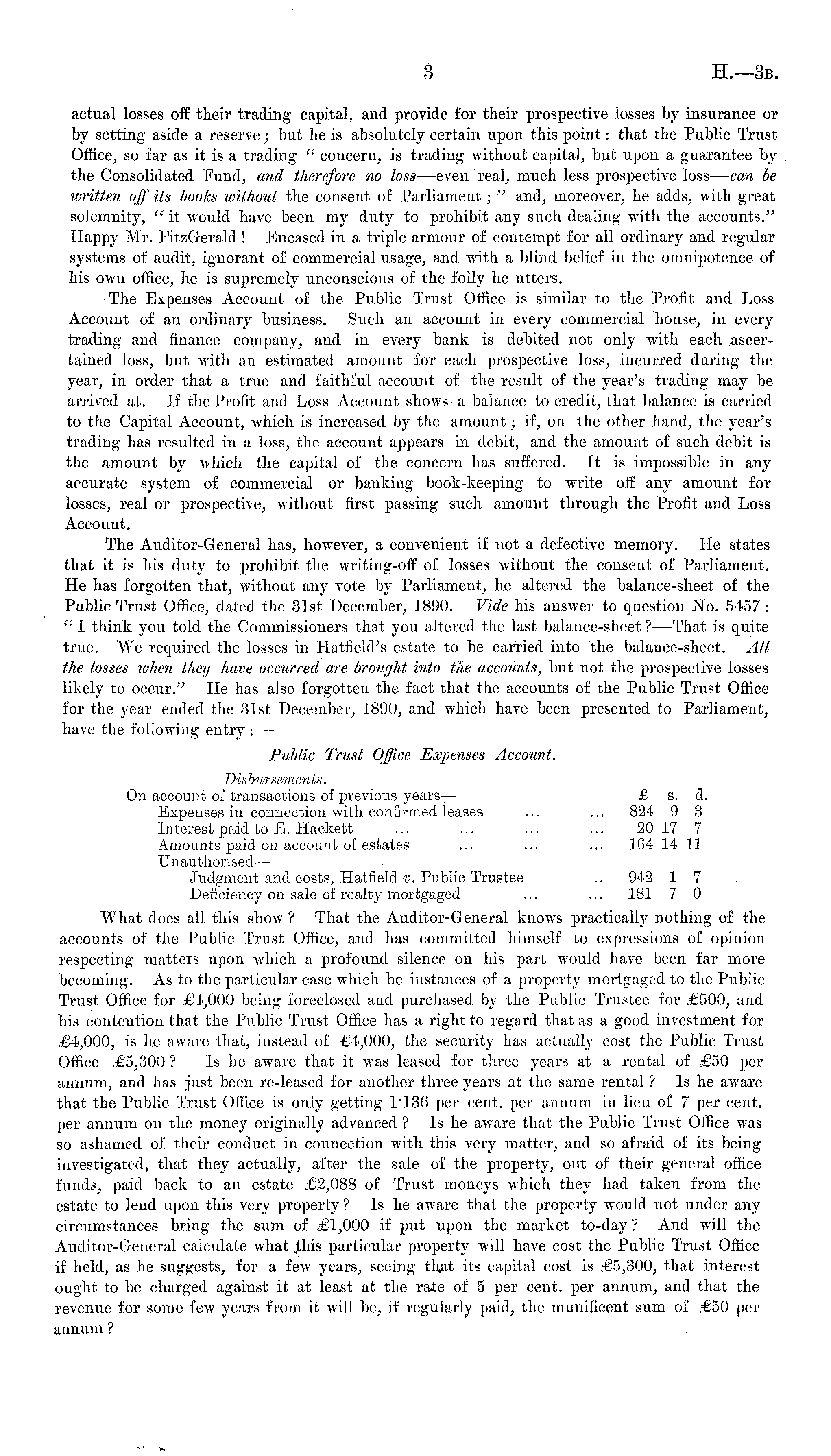 actual losses off their trading capital, and provide for their prospective losses by insurance or by setting aside a reserve ; but he is absolutely certain upon this point: that the Public Trust Office, so far as it is a trading " concern, is trading without capital, but upon a guarantee by the Consolidated Fund, and therefore no loss —even real, much less prospective loss— can be written off its books without the consent of Parliament; " and, moreover, he adds, with great solemnity, " it would have been my duty to prohibit any such dealing with the accounts." Happy Mr. PitzGerald ! Encased in a triple armour of contempt for all ordinary and regular systems of audit, ignorant of commercial usage, and with a blind belief in the omnipotence of his own office, he is supremely unconscious of the folly he utters. The Expenses Account of the Public Trust Office is similar to the Profit and Loss Account of an ordinary business. Such an account in every commercial house, in every trading and finance company, and in every bank is debited not only with each ascertained loss, but with an estimated amount for each prospective loss, incurred during the year, in order that a true and faithful account of the result of the year's trading may be arrived at. If the Profit and Loss Account shows a balance to credit, that balance is carried to the Capital Account, which is increased by the amount ; if, on the other hand, the year's trading has resulted in a loss, the account appears in debit, and the amount of such debit is the amount by which the capital of the concern has suffered. It is impossible in any accurate system of commercial or banking book-keeping- to write off any amount for losses, real or prospective, without first passing such amount through the Profit and Loss Account. The Auditor-General has, however, a convenient if not a defective memory. He states that it is his duty to prohibit the writing-off of losses without the consent of Parliament. He has forgotten that, without any vote by Parliament, he altered the balance-sheet of the Public Trust Office, dated the 31st December, 1890. Vide his answer to question No. 5457 : " I think you told the Commissioners that you altered the last balance-sheet ? —That is quite true. We required the losses in Hatfield's estate to be carried into the balance-sheet. All the losses when they have occurred are brought into the accounts, but not the prospective losses likely to occur." He has also forgotten the fact that the accounts of the Public Trust Office for the year ended the 31st December, 1890, and which have been presented to Parliament, have the following entry : — Public Trust Office Expenses Account. Disbursements. On account of transactions of previous years— £ s. d. Expenses in connection with confirmed leases ... ... 824 9 3 Interest paid to E. Hackett ... ... ... ... 20 17 7 Amounts paid on account of estates ... ... ... 164 14 11 Unauthorised — Judgment and costs, Hatfield v. Public Trustee .. 942 1 7 Deficiency on sale of realty mortgaged ... ... 181 7 0 What does all this show ? That the Auditor-General knows practically nothing of the accounts of the Public Trust Office, and has committed himself to expressions of opinion respecting matters upon which a profound silence on his part would have been far more becoming. As to the particular case which he instances of a property mortgaged to the Public Trust Office for £4,000 being foreclosed and purchased by the Public Trustee for £500, and his contention that the Public Trust Office has a right to regard that as a good investment for £4,000, is he aware that, instead of .£4,000, the security has actually cost the Public Trust Office £5,300 ? Is he aware that it was leased for three years at a rental of £50 per annum, and has just been re-leased for another three years at the same rental ? Is he aware that the Public Trust Office is only getting T136 per cent, per annum in lieu of 7 per cent. per annum on the money originally advanced ? Is he aware that the Public Trust Office was so ashamed of their conduct in connection with this very matter, and so afraid of its being investigated, that they actually, after the sale of the property, out of their general office funds, paid back to an estate £2,088 of Trust moneys which they had taken from the estate to lend upon this very property ? Is he aware that the property would not under any circumstances bring the sum of £1,000 if put upon the market to-day ? And will the Auditor-General calculate what ..this particular property will have cost the Public Trust Office if held, as he suggests, for a few years, seeing that its capital cost is £5,300, that interest ought to be charged against it at least at the rate of 5 per cent, per annum, and that the revenue for some few years from it will be, if regularly paid, the munificent sum of £50 per annum ?