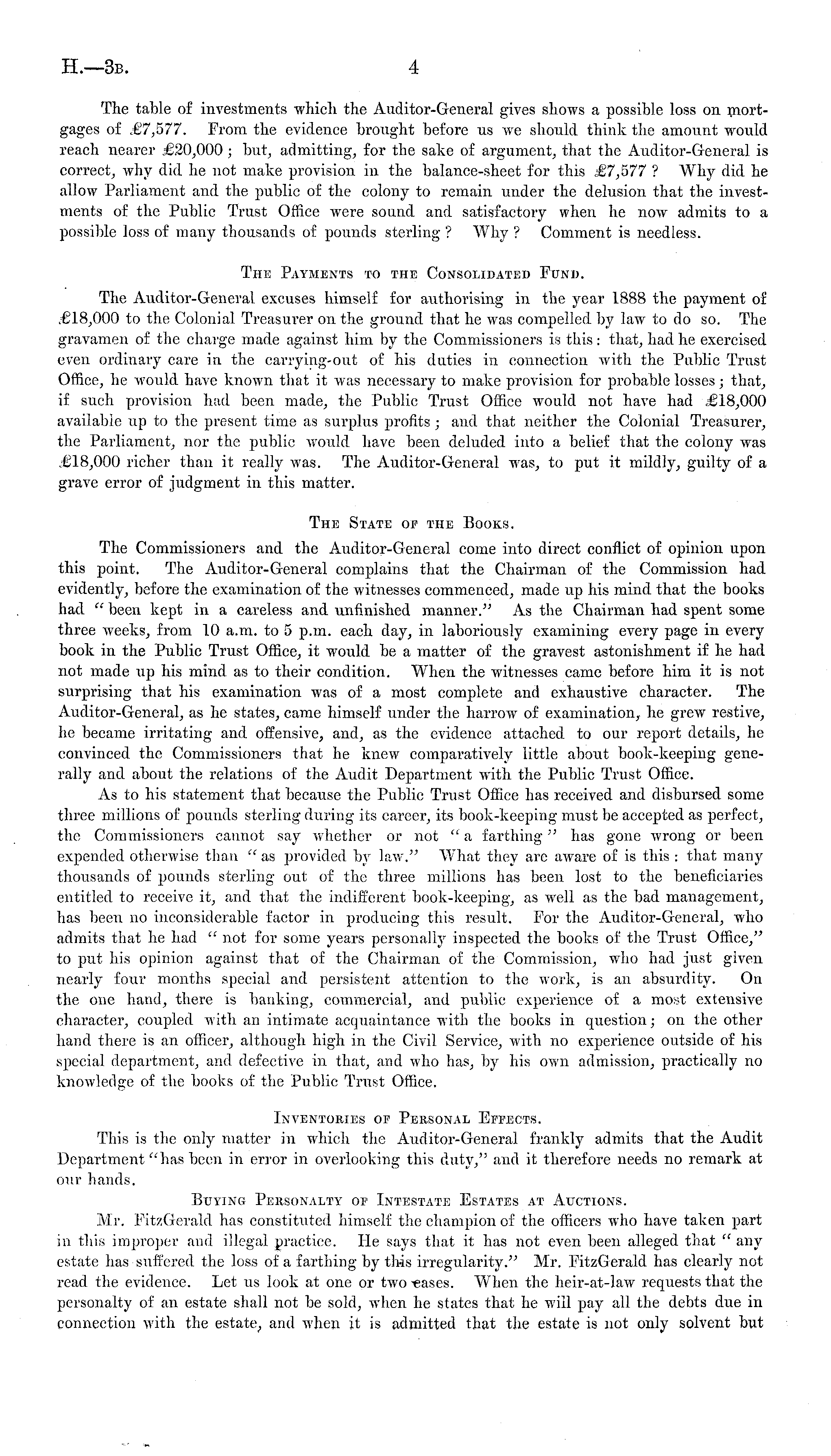 The table of investments which the Auditor-General gives shows a possible loss on mortgages of £7,577. From the evidence brought before us we should think the amount would reach nearer £20,000 ; but, admitting, for the sake of argument, that the Auditor-General is correct, why did he not make provision in the balance-sheet for this £7,577 ? Why did he allow Parliament and the public of the colony to remain under the delusion that the investments of the Public Trust Office were sound and satisfactory when he now admits to a possible loss of many thousands of pounds sterling ? Why ? Comment is needless. The Payments to the Consolidated Fund. The Auditor-General excuses himself for authorising in the year 1888 the payment of .€IB,OOO to the Colonial Treasurer on the ground that he was compelled by law to do so. The gravamen of the charge made against him by the Commissioners is this: that, had he exercised even ordinary care in the carrying-out of his duties in connection with the Public Trust Office, he would have known that it was necessary to make provision for probable losses ; that, if such provision had been made, the Public Trust Office would not have had JIB,OOO available up to the present time as surplus profits ; and that neither the Colonial Treasurer, the Parliament, nor the public; would have been deluded into a belief that the colony was j£lß,ooo richer than it really was. The Auditor-General was, to put it mildly, guilty of a grave error of judgment in this matter. The State of the Books. The Commissioners and the Auditor-General come into direct conflict of opinion upon this point. The Auditor-General complains that the Chairman of the Commission had evidently, before the examination of the witnesses commenced, made up his mind that the books had " been kept in a careless and unfinished manner." As the Chairman had spent some three weeks, from 10 a.m. to 5 p.m. each day, in laboriously examining every page in every book in the Public Trust Office, it would be a matter of the gravest astonishment if he had not made up his mind as to their condition. When the witnesses came before him it is not surprising that his examination was of a most complete and exhaustive character. The Auditor-General, as he states, came himself under the harrow of examination, he grew restive, he became irritating and offensive, and, as the evidence attached to our report details, he convinced the Commissioners that he knew comparatively little about book-keeping generally and about the relations of the Audit Department with the Public Trust Office. As to his statement that because the Public Trust Office has received and disbursed some three millions of pounds sterling during its career, its book-keeping must be accepted as perfect, the Commissioners cannot say whether or not " a farthing" has gone wrong or been expended otherwise than "as provided by law." What they are aware of is this : that many thousands of pounds sterling out of the three millions has been lost to the beneficiaries entitled to receive it, and that the indifferent book-keeping, as well as the bad management, has been no inconsiderable factor in producing this result. For the Auditor-General, who admits that he had " not for some years personally inspected the books of the Trust Office," to put his opinion against that of the Chairman of the Commission, who had just given nearly four months special and persistent attention to the work, is an absurdity. On the one hand, there is banking, commercial, and public experience of a most extensive character, coupled with an intimate acquaintance with the books in question; on the other hand there is an officer, although high in the Civil Service, with no experience outside of his special department, and defective in that, and who has, by his own admission, practically no knowledge of the books of the Public Trust Office. Inventories of Personal Effects. This is the only matter in which the Auditor-General frankly admits that the Audit Department "has been in error in overlooking this duty," and it therefore needs no remark at our hands. Buying Personalty of Intestate Estates at Auctions. Mr. FitzGerald has constituted himself the champion of the officers who have taken part in this improper and illegal practice. He says that it has not even been alleged that " any estate has suffered the loss of a farthing by this irregularity." Mr. FitzGerald has clearly not read the evidence. Let us look at one or two -eases. When the heir-at-law requests that the personalty of an estate shall not be sold, when he states that he will pay all the debts due in connection with the estate, and when it is admitted that the estate is not only solvent but