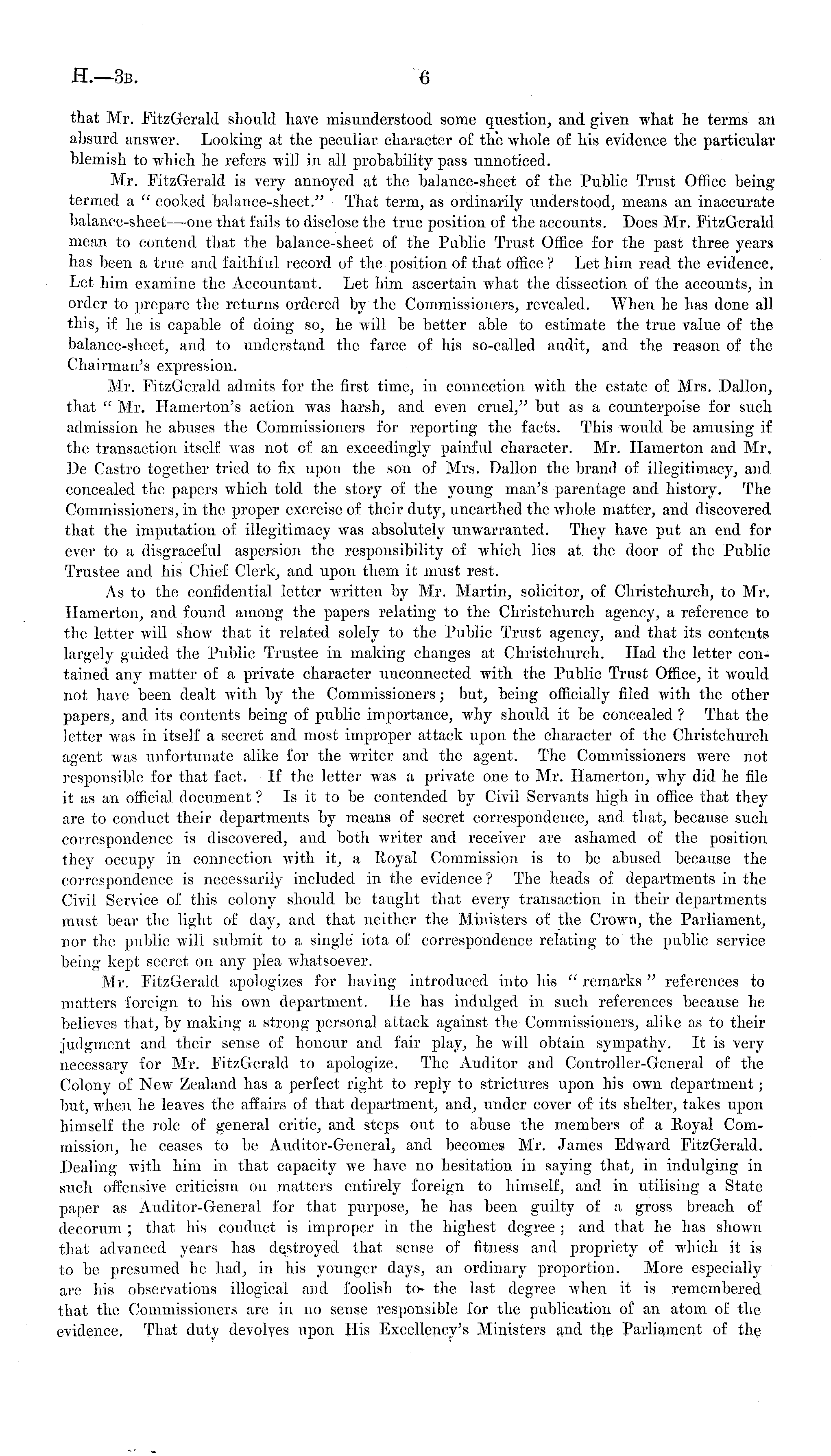 that Mr. FitzGerald should have misunderstood some question, and given what he terms an absurd answer. Looking at the peculiar character of the whole of his evidence the particular blemish to which he refers will in all probability pass unnoticed. Mr. FitzGerald is very annoyed at the balance-sheet of the Public Trust Office being termed a " cooked balance-sheet." That term, as ordinarily understood, means an inaccurate balance-sheet—one that fails to disclose the true position of the accounts. Does Mr. FitzGerald mean to contend that the balance-sheet of the Public Trust Office for the past three years has been a true and faithful record of the position of that office ? Let him read the evidence. Let him examine the Accountant. Let him ascertain what the dissection of the accounts, in order to prepare the returns ordered by the Commissioners, revealed. When he has done all this, if he is capable of doing so, he will be better able to estimate the true value of the balance-sheet, and to understand the farce of his so-called audit, and the reason of the Chairman's expression. Mr. FitzGerald admits for the first time, in connection with the estate of Mrs. Dallon, that " Mr. Hamerton's action was harsh, and even cruel," but as a counterpoise for such admission he abuses the Commissioners for reporting the facts. This would be amusing if the transaction itself was not of an exceedingly painful character. Mr. Hamerton and Mr, De Castro together tried to fix upon the son of Mrs. Dallon the brand of illegitimacy, and concealed the papers which told the story of the young man's parentage and history. The Commissioners, in the proper exercise of their duty, unearthed the whole matter, and discovered that the imputation of illegitimacy was absolutely unwarranted. They have put an end for ever to a disgraceful aspersion the responsibility of which lies at the door of the Publio Trustee and his Chief Clerk, and upon them it must rest. As to the confidential letter written by Mr. Martin, solicitor, of Christchurch, to Mr. Hamerton, and found among the papers relating to the Christchurch agency, a reference to the letter will show that it related solely to the Public Trust agency, and that its contents largely guided the Public Trustee in making changes at Christchurch. Had the letter contained any matter of a private character unconnected with the Public Trust Office, it would not have been dealt with by the Commissioners; but, being officially filed with the other papers, and its contents being of public importance, why should it be concealed ? That the letter was in itself a secret and most improper attack upon the character of the Christchurch agent was unfortunate alike for the writer and the agent. The Commissioners were not responsible for that fact. If the letter was a private one to Mr. Hamerton, why did he file it as an official document ? Is it to be contended by Civil Servants high in office that they are to conduct their departments by means of secret correspondence, and that, because such correspondence is discovered, and both writer and receiver are ashamed of the position they occupy in connection with it, a Royal Commission is to be abused because the correspondence is necessarily included in the evidence ? The heads of departments in the Civil Service of this colony should be taught that every transaction in their de23artments must bear the light of day, and that neither the Ministers of the Crown, the Parliament, nor the public will submit to a single iota of correspondence relating to the public service being kept secret on any plea whatsoever. Mr. FitzGerald apologizes for having introduced into his " remarks " references to matters foreign to his own department. He has indulged in such references because he believes that, by making a strong personal attack against the Commissioners, alike as to their judgment and their sense of honour and fair play, he will obtain sympathy. It is very necessary for Mr. FitzGerald to apologize. The Auditor and Controller-General of the Colony of New Zealand has a perfect right to reply to strictures upon his own department; but, when he leaves the affairs of that department, and, under cover of its shelter, takes upon himself the role of general critic, and steps out to abuse the members of a Royal Commission, he ceases to be Auditor-General, and becomes Mr. James Edward FitzGerald. Dealing with him in that capacity we have no hesitation in saying that, in indulging in such offensive criticism on matters entirely foreign to himself, and in utilising a State paper as Auditor-General for that purpose, he has been guilty of a gross breach of decorum ; that his conduct is improper in the highest degree; and that he has shown that advanced years has destroyed that sense of fitness and propriety of which it is to be presumed he had, in his younger days, an ordinary proportion. More especially are his observations illogical and foolish to- the last degree when it is remembered that the Commissioners are in no sense responsible for the publication of an atom of the evidence. That duty devolves upon His Excellency's Ministers and the X-'arliament of the