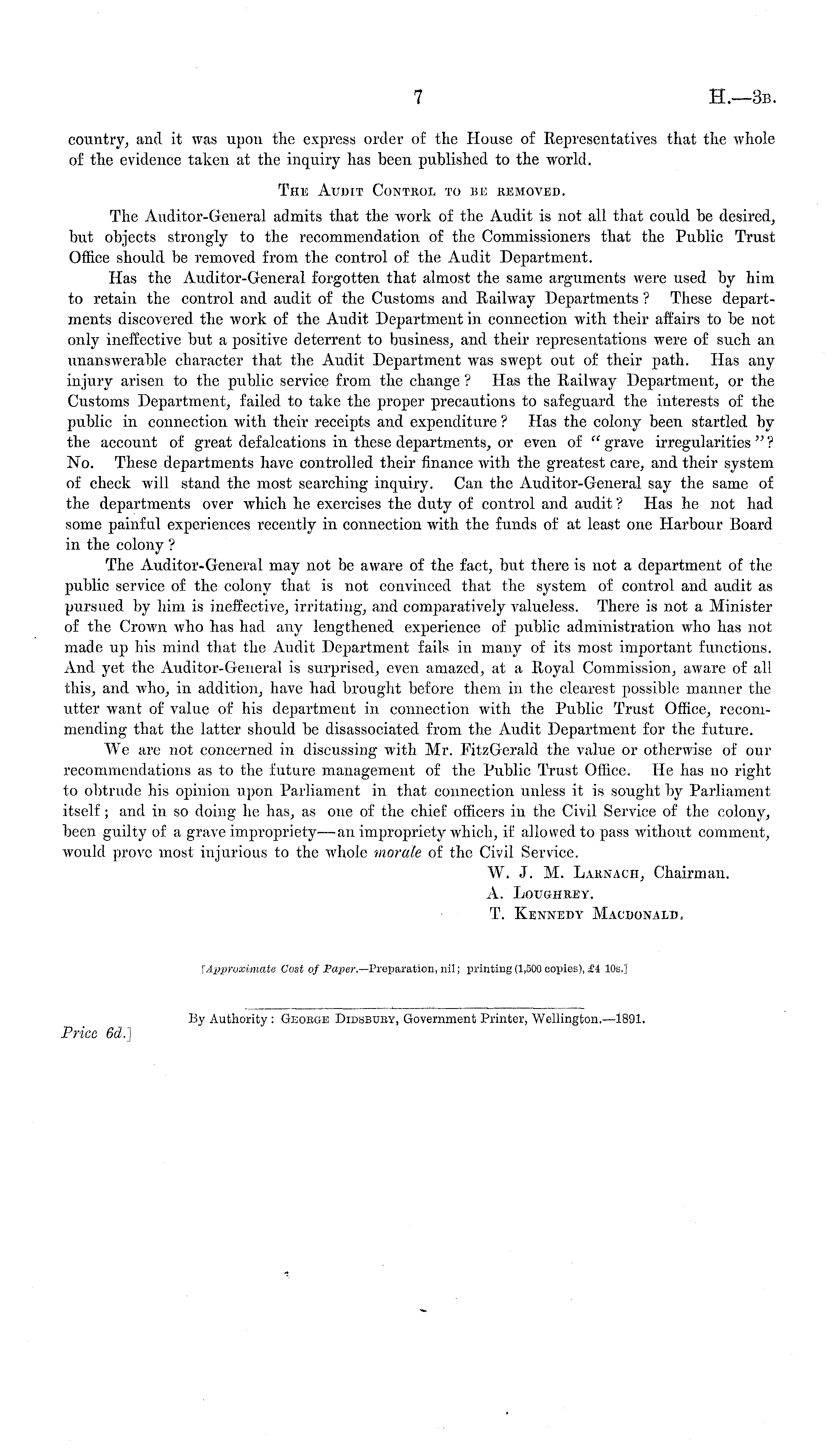 country, and it was upon the express order of the House of Representatives that the whole of the evidence taken at the inquiry has been published to the world. The Audit Control to be kemoved. The Auditor-General admits that the Avork of the Audit is not all that could be desired, but objects strongly to the recommendation of the Commissioners that the Public Trust Office should be removed from the control of the Audit Department. Has the Auditor-General forgotten that almost the same arguments were used by him to retain the control and audit of the Customs and Railway Departments ? These departments discovered the work of the Audit Department in connection with their affairs to be not only ineffective but a positive deterrent to business, and their representations were of such an unanswerable character that the Audit Department was swept out of their path. Has any injury arisen to the public service from the change ? Has the Railway Department, or the Customs Department, failed to take the proper precautions to safeguard the interests of the public in connection with their receipts and expenditure ? Has the colony been startled by the account of great defalcations in these departments, or even of " grave irregularities " ? No. These departments have controlled their finance with the greatest care, and their system of check will stand the most searching inquiry. Can the Auditor-General say the same of the departments over which he exercises the duty of control and audit ? Has he not had some painful experiences recently in connection with the funds of at least one Harbour Board in the colony ? The Auditor-General may not be aware of the fact, but there is not a department of the public service of the colony that is not convinced that the system of control and audit as pursued by him is ineffective, irritating, and comparatively valueless. There is not a Minister of the Crown who has had any lengthened experience of public administration who has not made up his mind that the Audit Department fails in many of its most important functions. And yet the Auditor-General is surprised, even amazed, at a Royal Commission, aware of all this, and who, in addition, have had brought before them in the clearest possible manner the utter want of value of his department in connection with the Public Trust Office, recommending that the latter should be disassociated from the Audit Department for the future. We are not concerned in discussing with Mr. FitzGerald the value or otherwise of our recommendations as to the future management of the Public Trust Office. He has no right to obtrude his opinion upon Parliament in that connection unless it is sought by Parliament itself; and in so doing he has, as one of the chief officers in the Civil Service of the colony, been guilty of a grave impropriety—an impropriety which, if allowed to pass without comment, would prove most injurious to the whole morale of the Civil Service. W. J. M. Laknach, Chairman. A. Loughrey. T. Kennedy Macdonald, l Approximate Cost of Paper.— Preparation, nil ; printing (1,500 copies), £i 10s.j