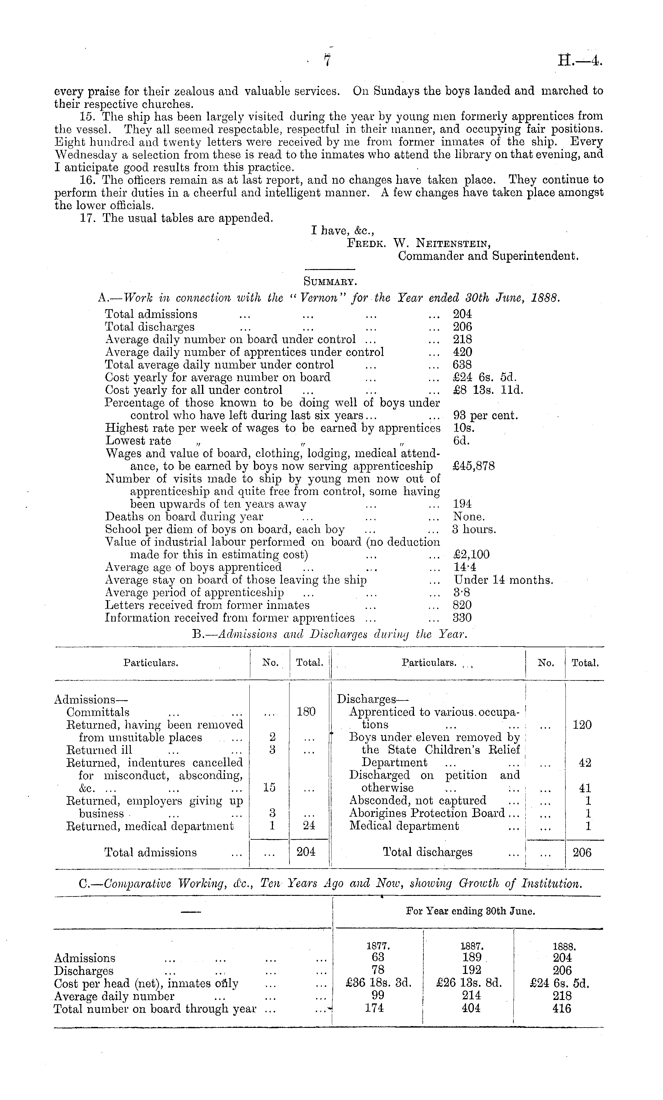 Summaby. A.— Work in connection with the "Vemon" for the Year ended 30th June, 1888. Total admissions ... ... ... ... 204 Total discharges ... ... ... ... 206 Average daily number on board under control ... ... 218 Average daily number of apprentices under control ... 420 Total average daily number under control ... ... 638 Cost yearly for average number on board ... ... £24 6s. sd. Cost yearly for all under control ... ... ... £8 13s. lid. Percentage of those known to be doing well of boys under control who have left during last six years... ... 93 per cent. Highest rate per week of wages to be earned by apprentices 10s. Lowest rate „ „ „ 6d. Wages and value of board, clothing, lodging, medical attendance, to be earned by boys now serving apprenticeship £45,878 Number of visits made to ship by young men now out of apprenticeship and quite free from control, some having been upwards of ten years away ... ... 194 Deaths on board during year ... ... ... None. School per diem of boys on board, each boy ... ... 3 hours. Value of industrial labour performed on board (no deduction made for this in estimating cost) ... ... £2,100 Average age of boys apprenticed ... ... ... 14-4 Average stay on board of those leaving the ship ... Under 14 months. Average period of apprenticeship ... ... ... 3-8 Letters received from former inmates ... ... 820 Information received from former apprentices ... ... 330