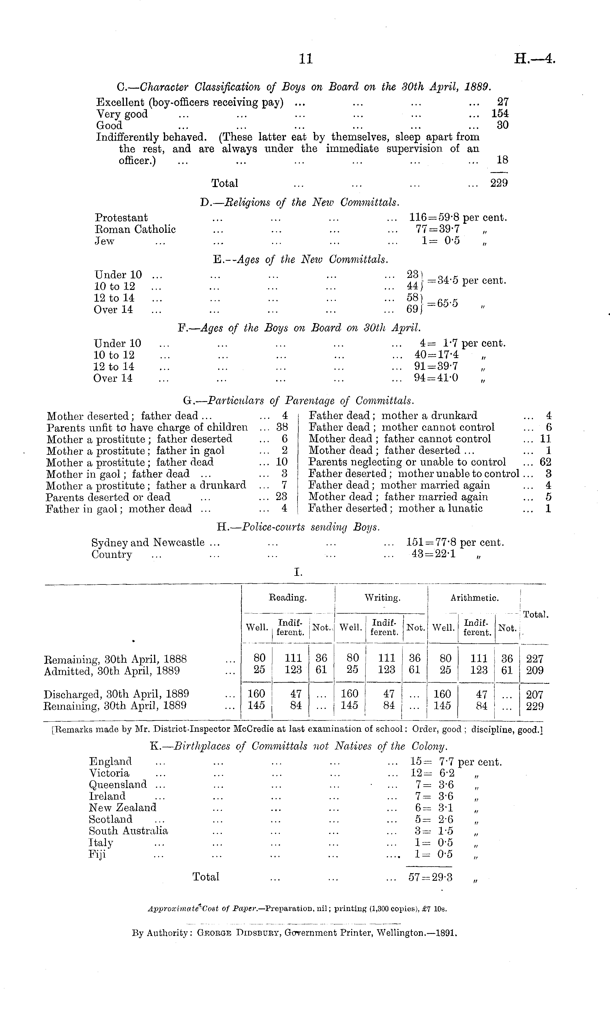 [Remarks made by Mr. District-Inspector McCredie at last examination of school: Order, good : discipline, good.] X. — Birthplaces of Committals not Natives of the Colony. England ... ... ... ... ... 15= 7-7 per cent. Victoria ... ... ... ... ... 12= 6-2 Queensland ... ... ... ... ... 7= 3-6 „ Ireland ... ... ... ... ... 7= 3-6 New Zealand ... ... ... ... 6= 3-1 Scotland ... ... ... ... ... 5 = 2-6 South Australia ... ... ... ... 3= 1-5 „ Italy ... ... ... ... ... 1= 0-5 Fiji ... ... ... ... .... 1= 0-5 Total ... ... ... 57 = 29-3 Approximate'' Cost of Paper. —Preparation, nil; printing (1,300 copies), £7 10b.
